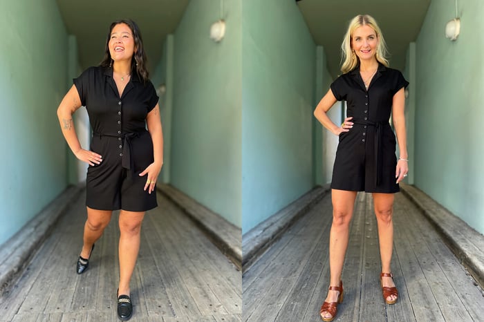Jeg og Caterina er nesten like høye, og jeg har litt høyere heler på sandalene mine her, men buksa er ganske lik i lengden som du ser! Endelig har de skjønt det - beinlengden øker ikke masse oppover i størrelsene! Vi fatter ikke hvorfor så mange merker gjør dette...akkurat som man er veldig mye høyere om man er en størrelse XL enn når man er en S - ikke logisk spør du oss😅