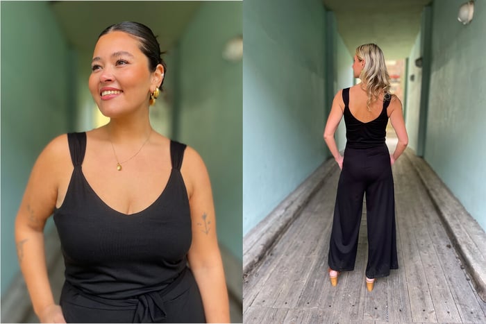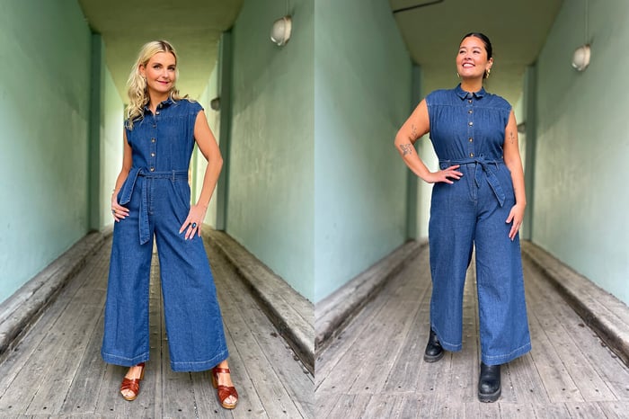 Amy-modellen i kjole er som mange av dere vet en meget romslig modell, men denne buksedressen er mer normal i størrelsen vil jeg si. Jeg har på meg en størrelse 36 som vanlig, og Caterina har på seg 44. Selv om Caterina bruker størrelse 46 i buksene fra Dianas Vintage og har mål nærmere 46 over hoftene, funker denne buksedressen fint på henne. Den er bare litt mer tettsittende over hofta.
