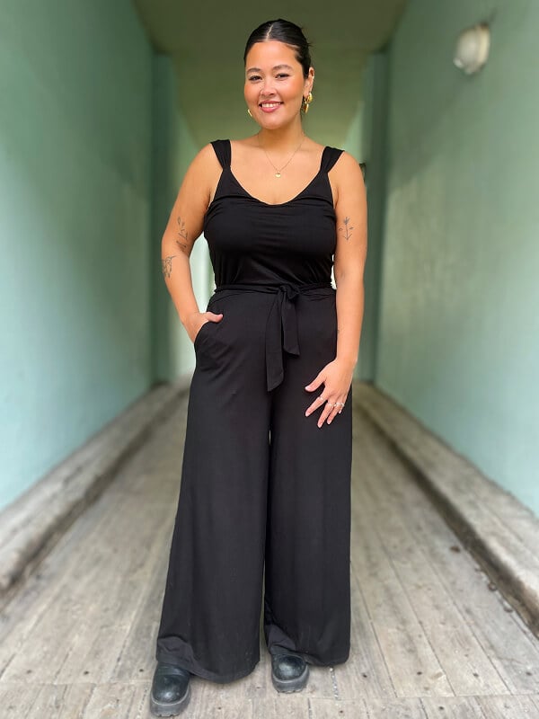 👆Lenny heter denne og er en superclassy buksedress som samtidig er som å ha på seg en pysj🤩 De fine stroppene som går fra smalt til bredt, og den lekre utringingen på denne gjør den både sexy og elegant, mens stoffet er som på playsuiten- superdeilig stretchy EcoVero! Her er det vide flytende bein, lommer og et løst knytebelte i midjen.