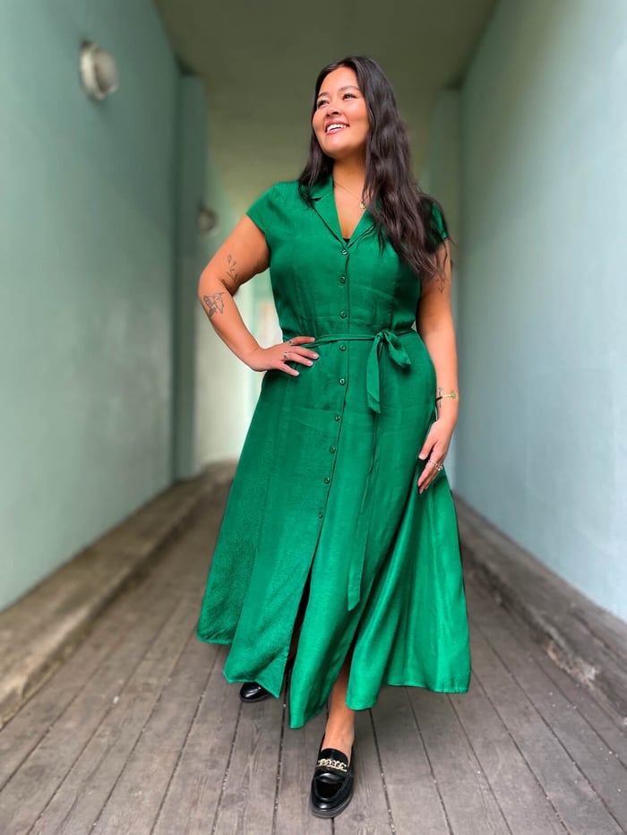 Fargen er fantastisk; dyp grønn, men forferdelig vanskelig å få helt korrekt på bildene😳😅 Caterina har jobbet hardt med redigeringen for å få frem den rette grønntonen, og det har hun lyktes med, men på grunn av glansen og bevegelsen i stoffet må denne kjolen rett og slett sees med det blotte øyet, og ta og føles på for å komme fullstendig til sin rett🤩