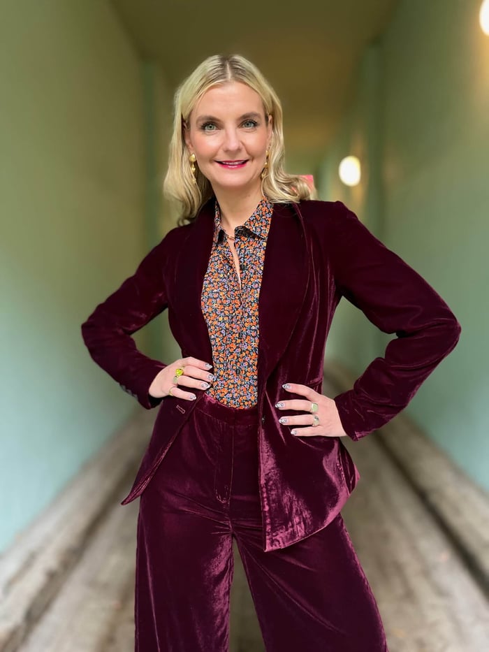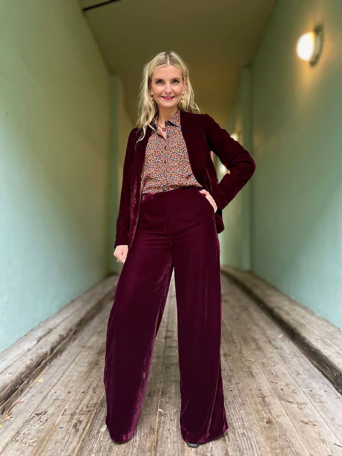 Først ut er denne fløyelsdressen i nydelig burgunder. Den består av Peppa pants og Brooke blazer. Peppa pantsene sitter høyt i livet akkurat slik jeg liker det, og har kule vide bein . Fløyelen er blank og myk og deilig! Buksene er normale i størrelsen og jeg bruker min faste størrelse 36 i disse. Siden Caterina er en 46 over hoftene passer dessverre ikke buksen til henne i 44. Vi maser støtt på King Louie for at de skal lage større størrelser! Må si jeg synes det er dårlig at de ikke hører på oss. Når vi som selv har et bittelite klesmerke sammenliknet med dem får til å gradere bukser opp til str. 50, skjønner jeg ikke hvorfor de ikke ønsker å gjøre det samme...😬 jaja, det var dagens rant. Men dere skal vite at vi virkelig har gitt mange tilbakemeldinger på dette, men uten å nå gjennom inntil videre der altså...