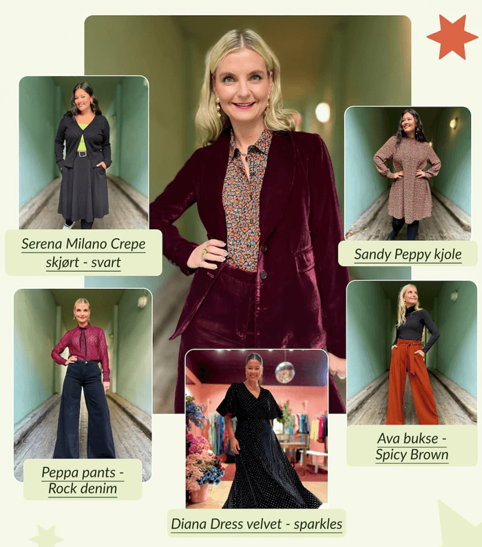 Brooke blazeren har vi hatt inne før, og den har en skikkelig fin klassisk fasong med litt innsving i midjen. Dette gjør den så nett at den er like fin å bruke over både bukser , kjoler og skjørt. Putt på en pen bluse inni blazeren og kombiner med matchende Peppa pants for en kledd heldress-look. Her har jeg brukt den avslappede Leila-blusen med blomsterprint i kjempefine høstfarger til, og det mykner opp stilen litt. Den hvite Carina Sista-blusen med blanke spetter vil derimot gjøre looken mere edgy. Eller sleng blazeren over en avslappet t-skjorte eller strikkagenser sammen med jeans for en helt annen og mer hverdagslig look. Fløyel er så fint å kombinere med så mage andre materialer så her er det bare å leke seg med fluffy strikk, jeans eller dressbukser, og sette sammen noe i din egen stil.