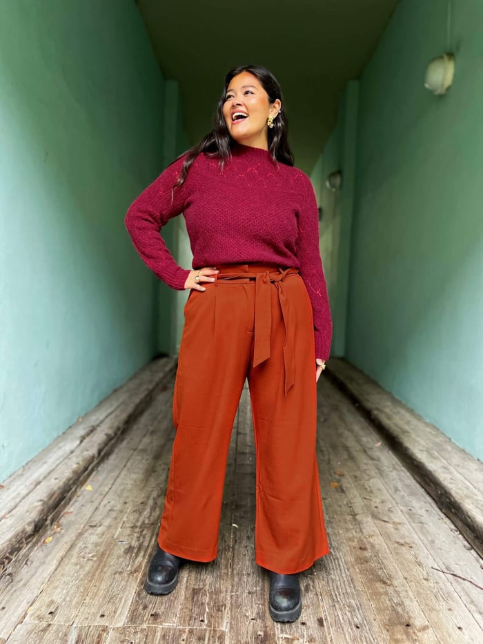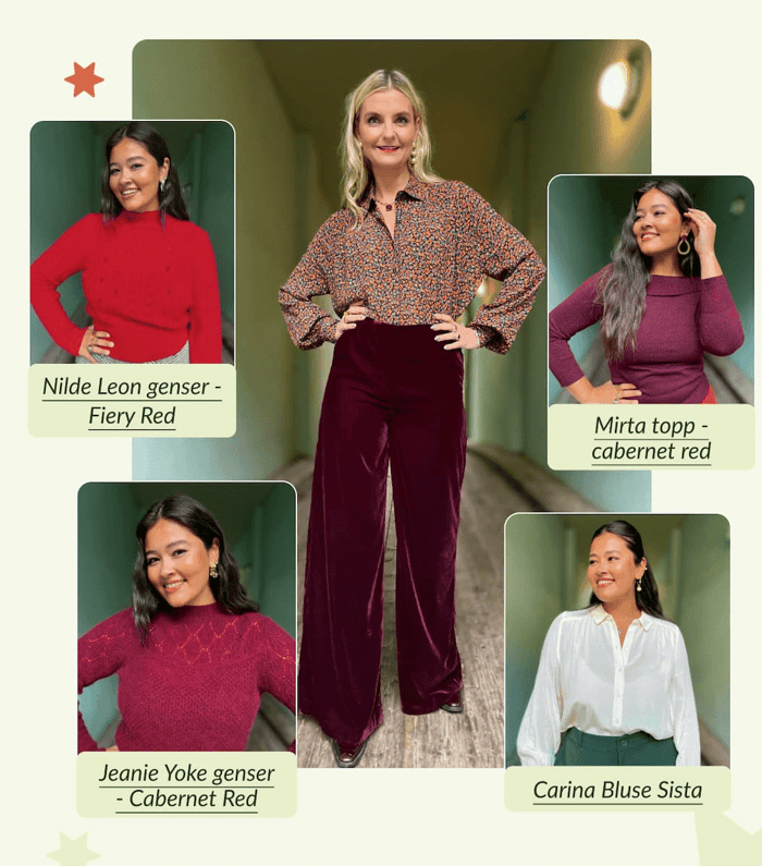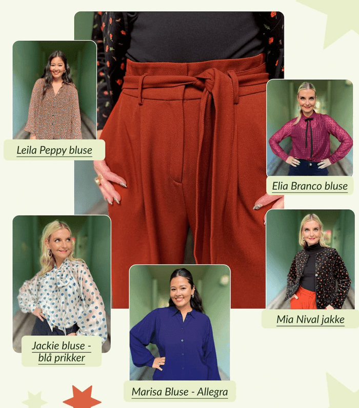Brent oransje eller glødende brun som i denne Ava-buksa er en deilig farge å sette sammen med en mengde av sesongens farger synes jeg. Leila-blusen er allerede nevnt som en perfekt match, og som du ser på bildet så er den nye strikkegenseren Jeanie i burgunder som Caterina har på seg til også en kjempefin sammensetning. Stoffet i buksa er ikke helt glatt, men har et litt grovere utrykk, noe som gjør at den er knallfin med kontrasterende stoffer til. Prøv med den fine burgunderfargede blondeblusen Elia eller den dype blå Marisa-blusen med blanke striper! Blått og oransje er komplementærfarger og er en rålekker kombo! Jeg vil også bruke denne sammen med den kule Jackie-blusen fra Cras som har kommet inn i med blå polka-prikker💙🧡 I uka som var hadde Synne Ava-buksa sammen med en vintagebluse i leopard print, og Cecilie brukte den sammen med en søt lyserosa vintagebluse med blonder, så dette er virkelig salongens nye favoritt!