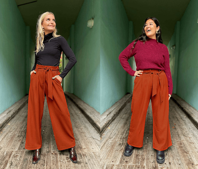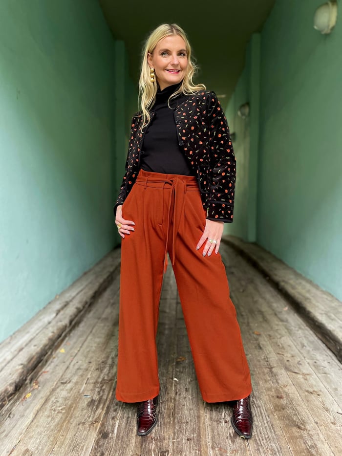 En annen nyhet som også passer perfekt til den blomstrete Leila-blusen er den nye Ava-buksa!! Her har King Louie gjort et godt grep og laget buksa ordentlig romslig i størrelsen! Jeg har sjeldent sett Caterina mer fornøyd på bukse-fotoshoot enn i denne knallfine brente orange-brune buksa🤩
