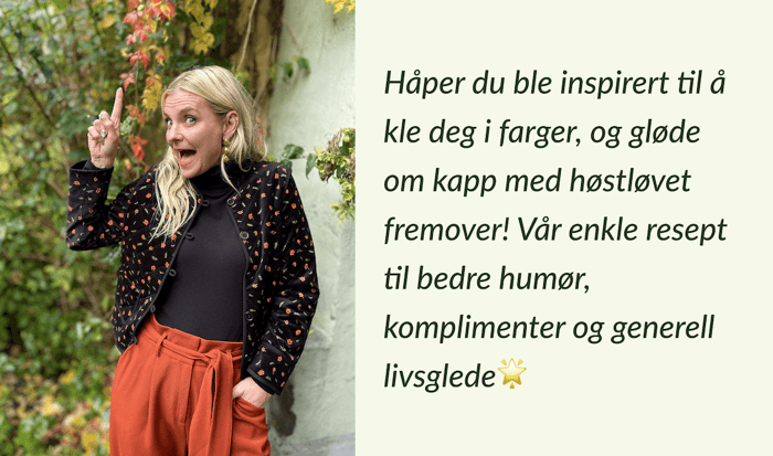 Et av de komplimentene jeg får oftest må være at folk kommer bort og synes jeg har på meg så fine farger😊 Jeg blir så glad av å se på deg, sier folk. Og ja, jeg blir glad selv også! Jeg har nok sagt det før, men dette med feel-good dressing er faktisk ikke til å kimse av. Når du kler deg i noe fint og fargerikt vil humøret stige og du får mere positiv oppmerksomhet fra omverdenen, selvtilitten stiger, det slippes dopaminer ut i hjernen, og vipps er det litt enklere å gå den mørke, kalde tiden i møte🙌 Her i Oslo er det nydelig crispy høstvær om dagen, og vi har fått inn så mange nyheter i farger som virkelig gløder av høst🍁🧡🍷🍇 Så denne uka vil jeg presentere nyheter i høstens favorittfarger, og det er bare å velge og vrake!