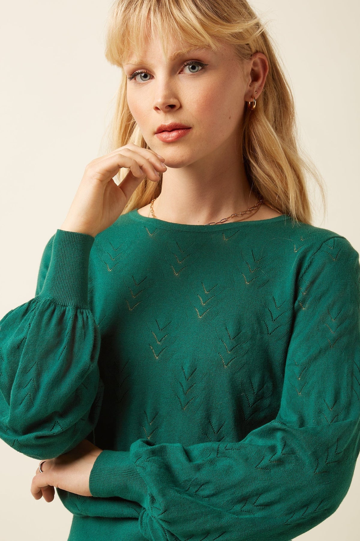 - Rund hals og lange ermer med lett puff