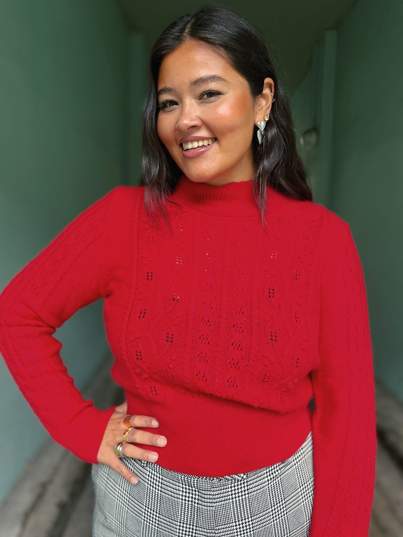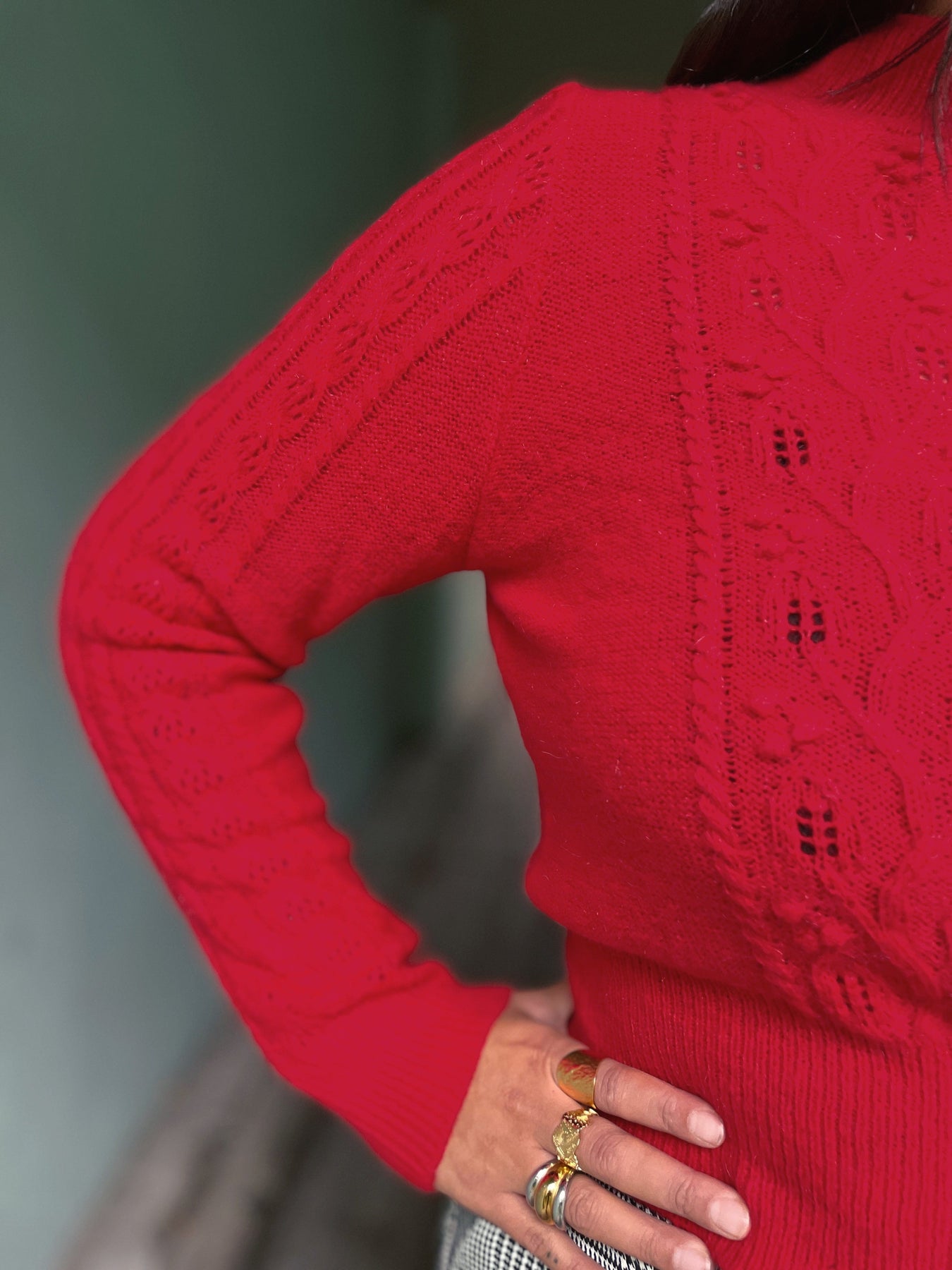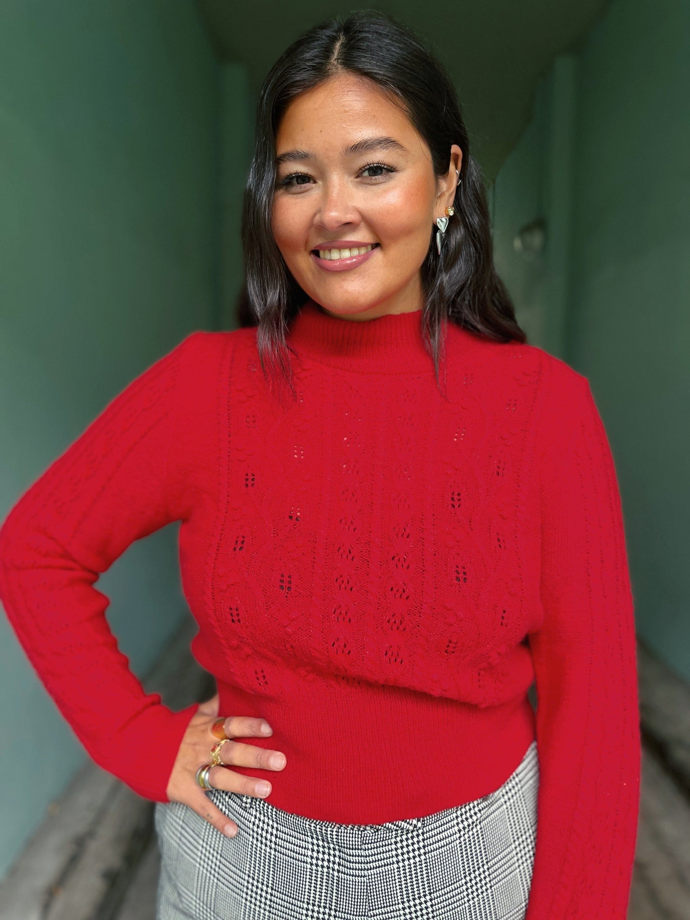 En skikkelig power-genser i knallrødt! Nilde genseren har klassisk kabelstrikk, moderne croppet fasong, og høy hals, dette gjør den både tidløs og trendy på samme tid😍 Den er myk, fluffy, lun og deilig å bruke, og den løfter ethvert antrekk med et øyeblikkelig fargekick❣️Den brede ribbekanten nede, på ermene og i halsen gjør fasongen ekstra fin, og denne er like fin å bruke oppi eller utenpå både bukser og skjørt!