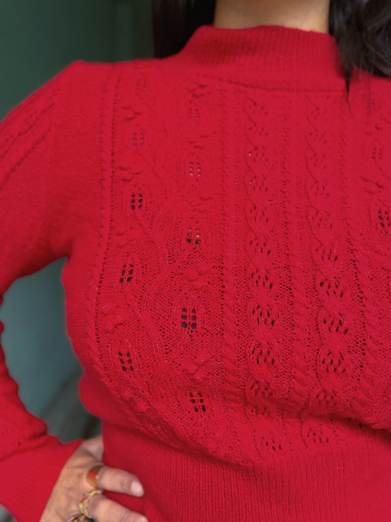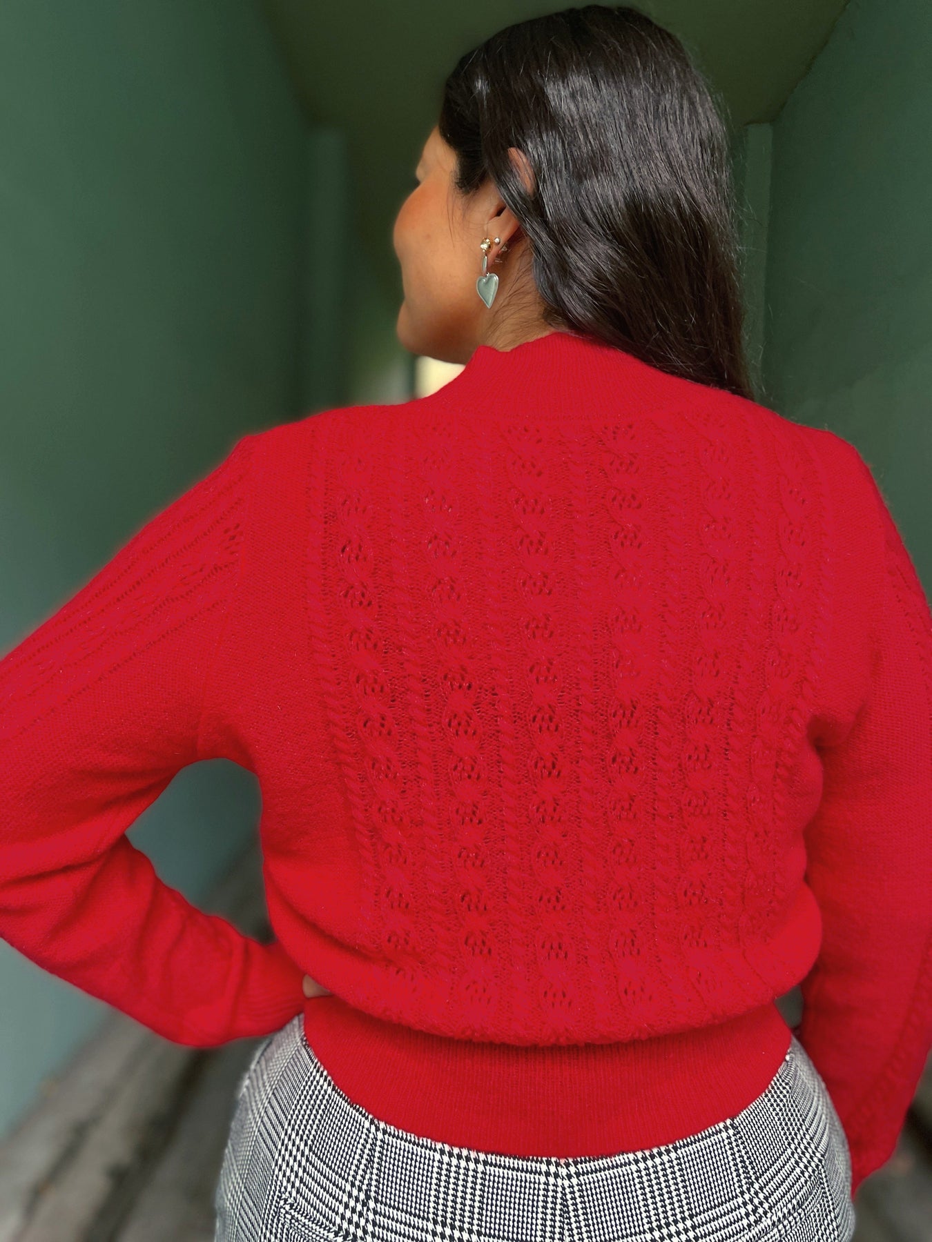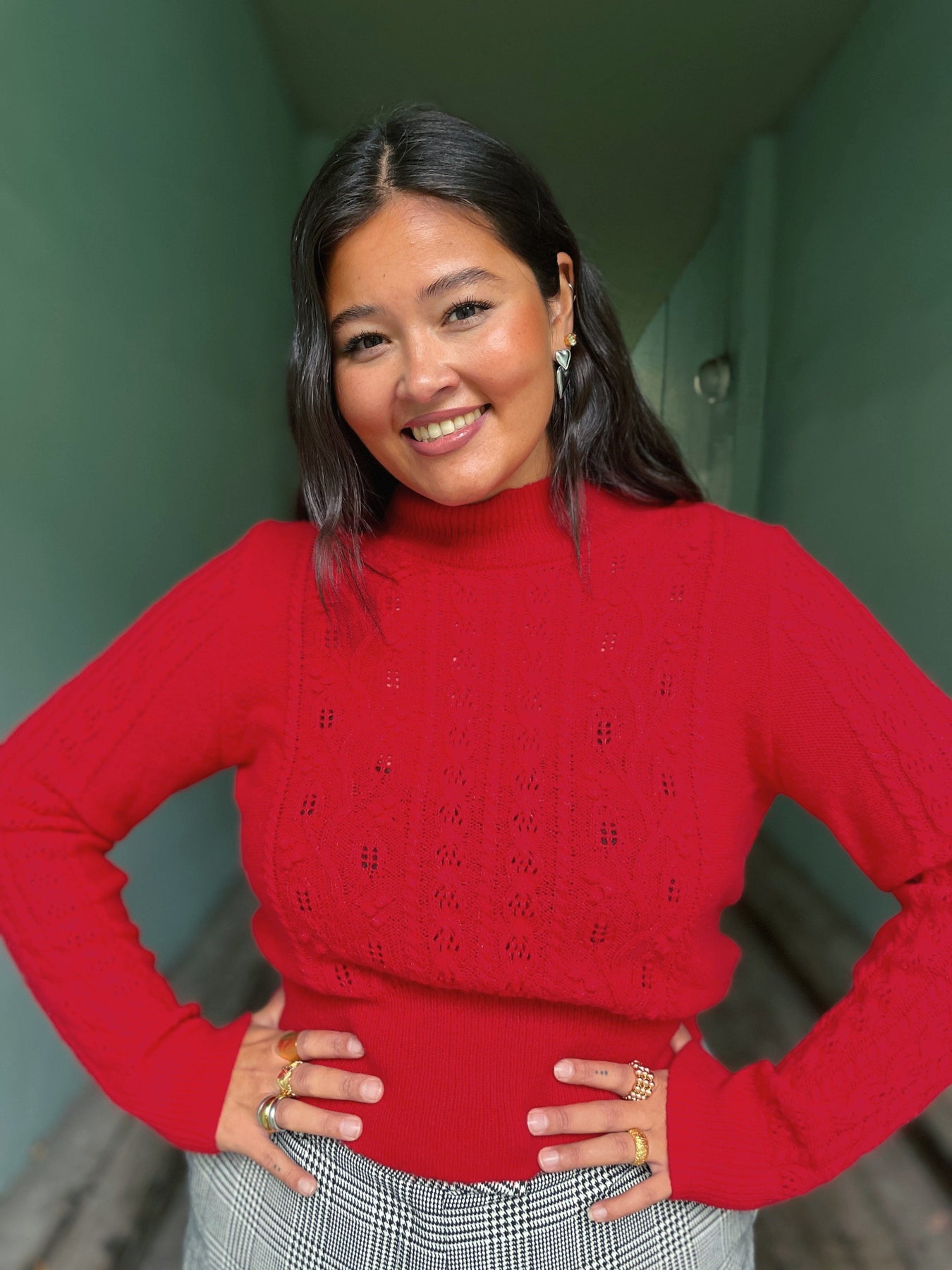 En skikkelig power-genser i knallrødt! Nilde genseren har klassisk kabelstrikk, moderne croppet fasong, og høy hals, dette gjør den både tidløs og trendy på samme tid😍 Den er myk, fluffy, lun og deilig å bruke, og den løfter ethvert antrekk med et øyeblikkelig fargekick❣️Den brede ribbekanten nede, på ermene og i halsen gjør fasongen ekstra fin, og denne er like fin å bruke oppi eller utenpå både bukser og skjørt!