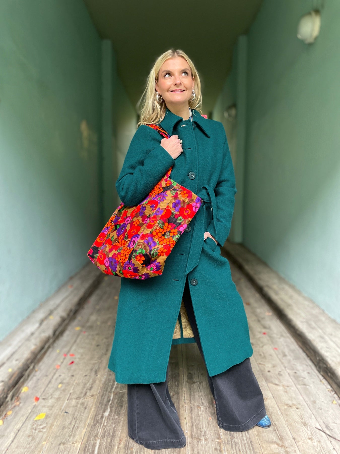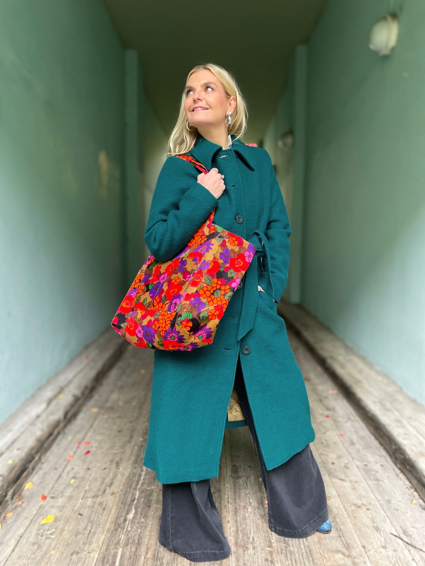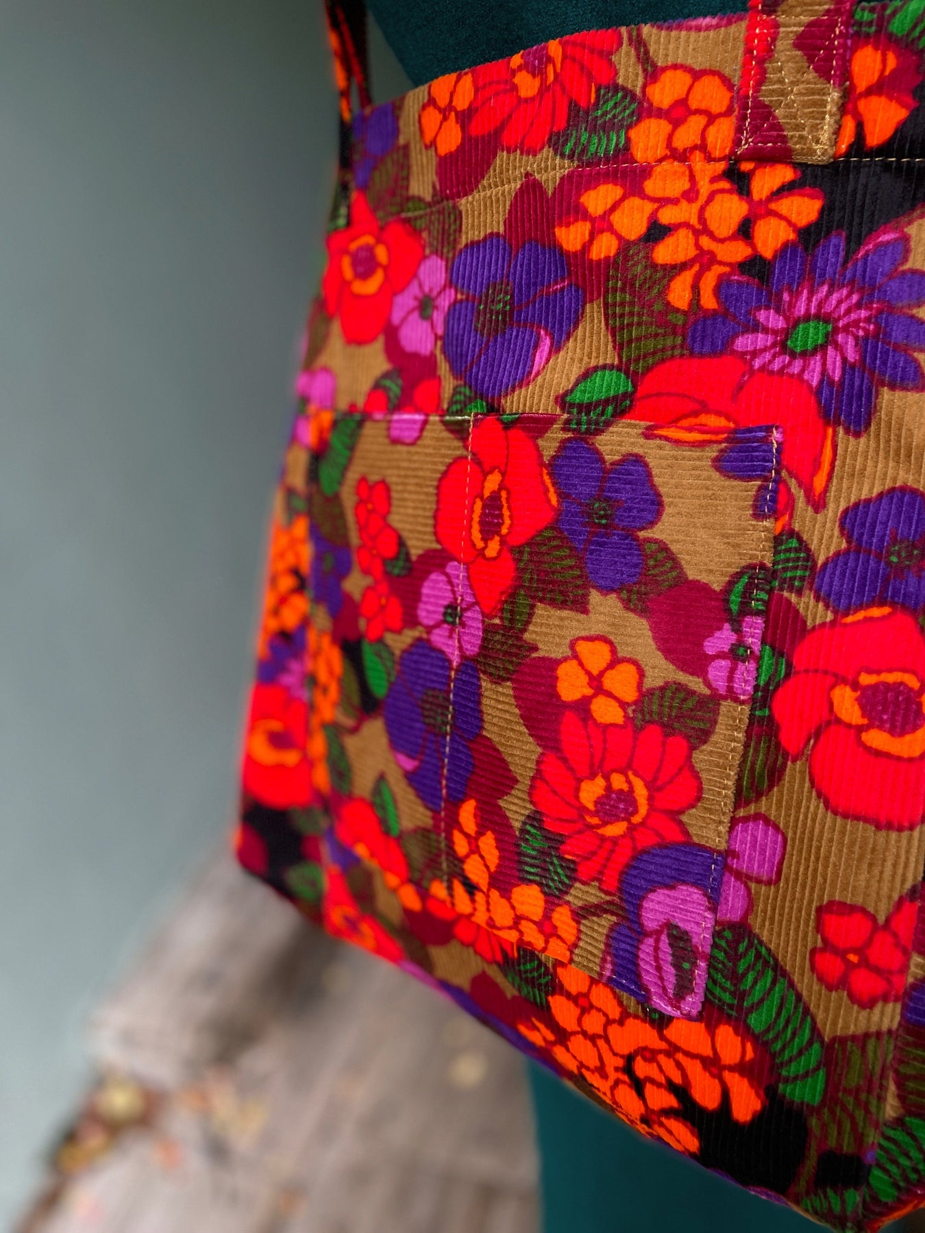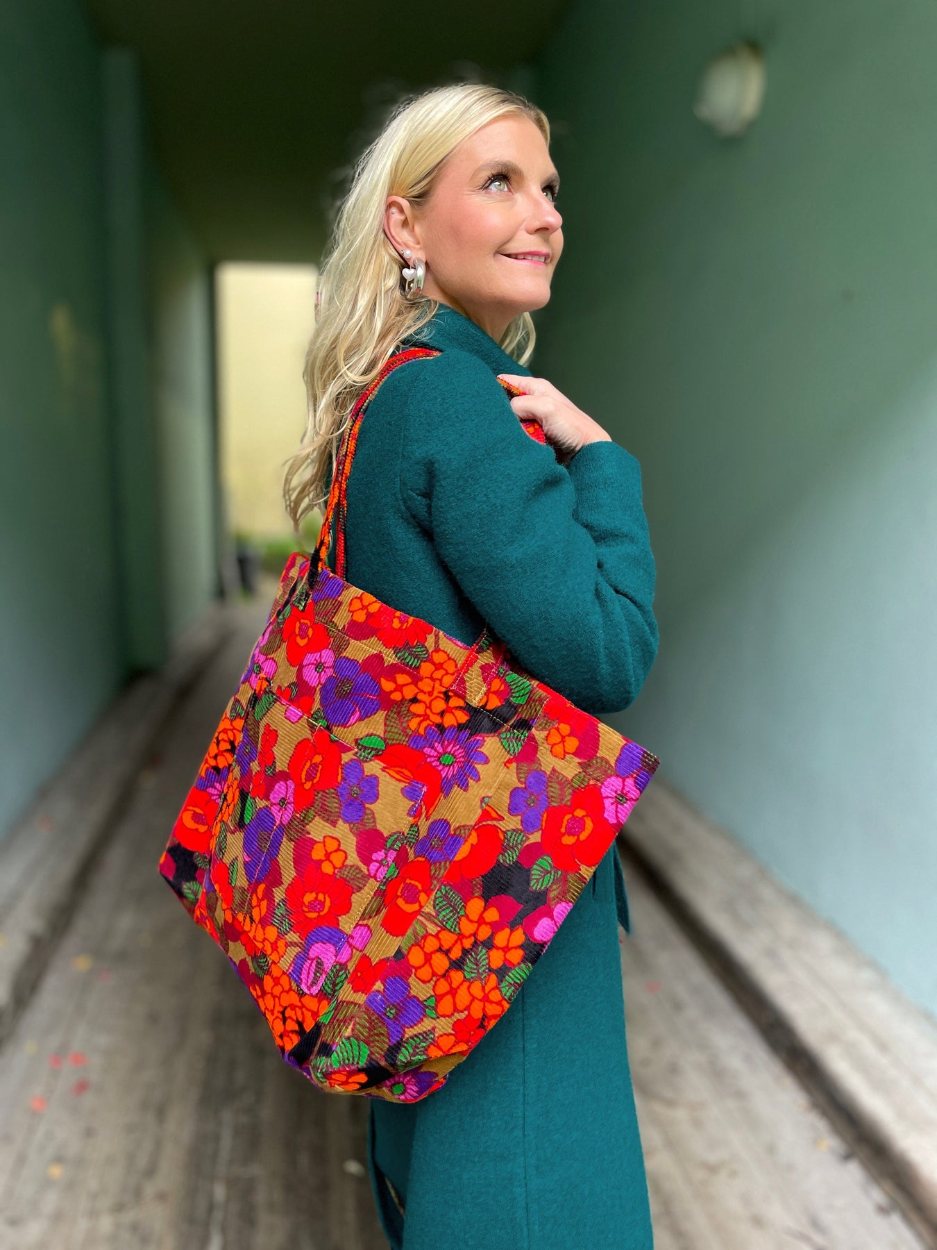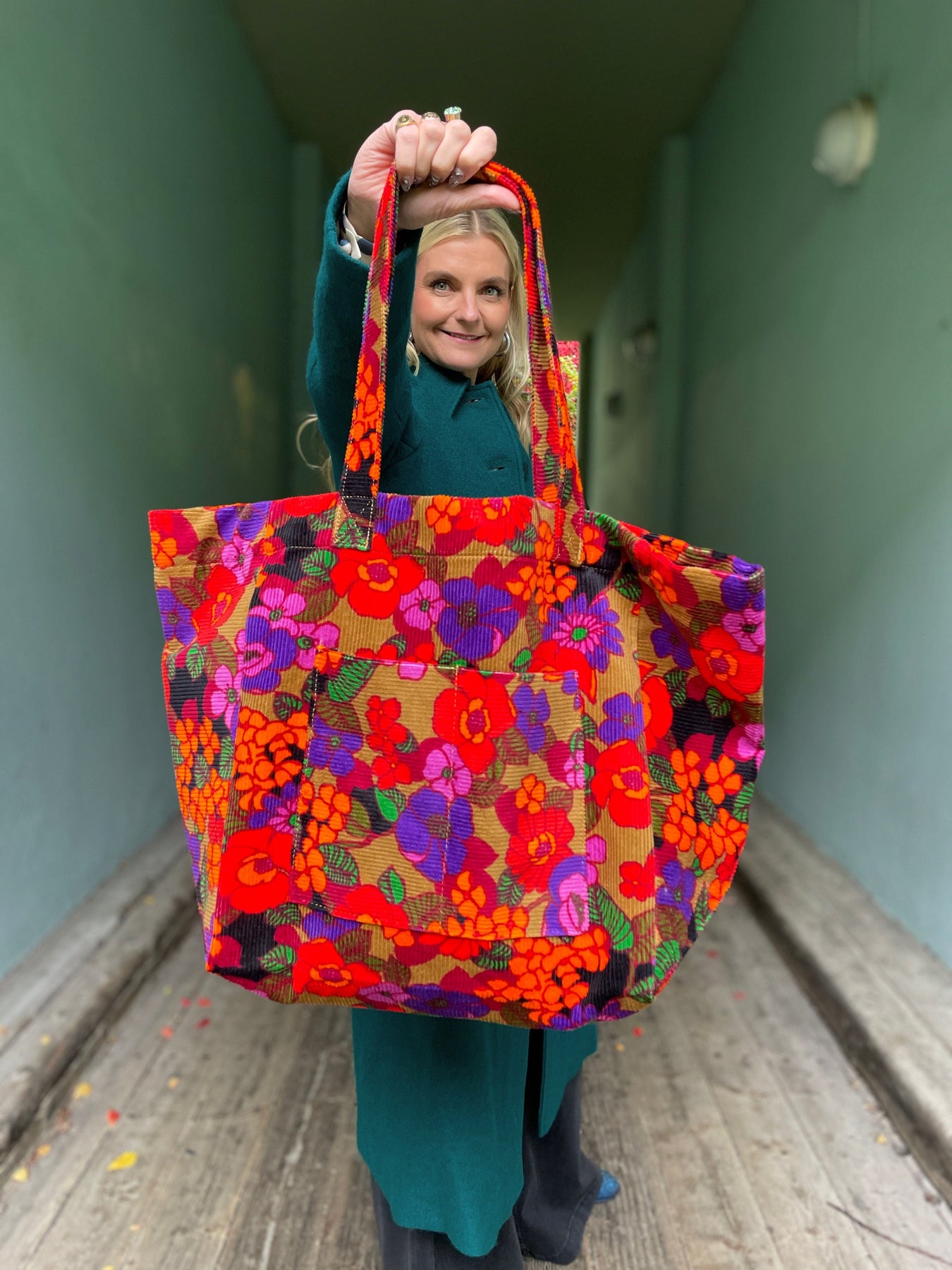 Kjempestort handlenett i cordfløyel med fantastisk print🌺 Her får du et nett, eller en weekendbag om du vil, med god plass, som tåler litt vekt, er i slitesterk bomull, og som i tillegg ser skikkelig kult ut! Det 70-tallsinspirerte blomsterprintet er rett og slett en energi-innsprøytning i seg selv og gjør drassing til en lek🙌 Limited edition!
