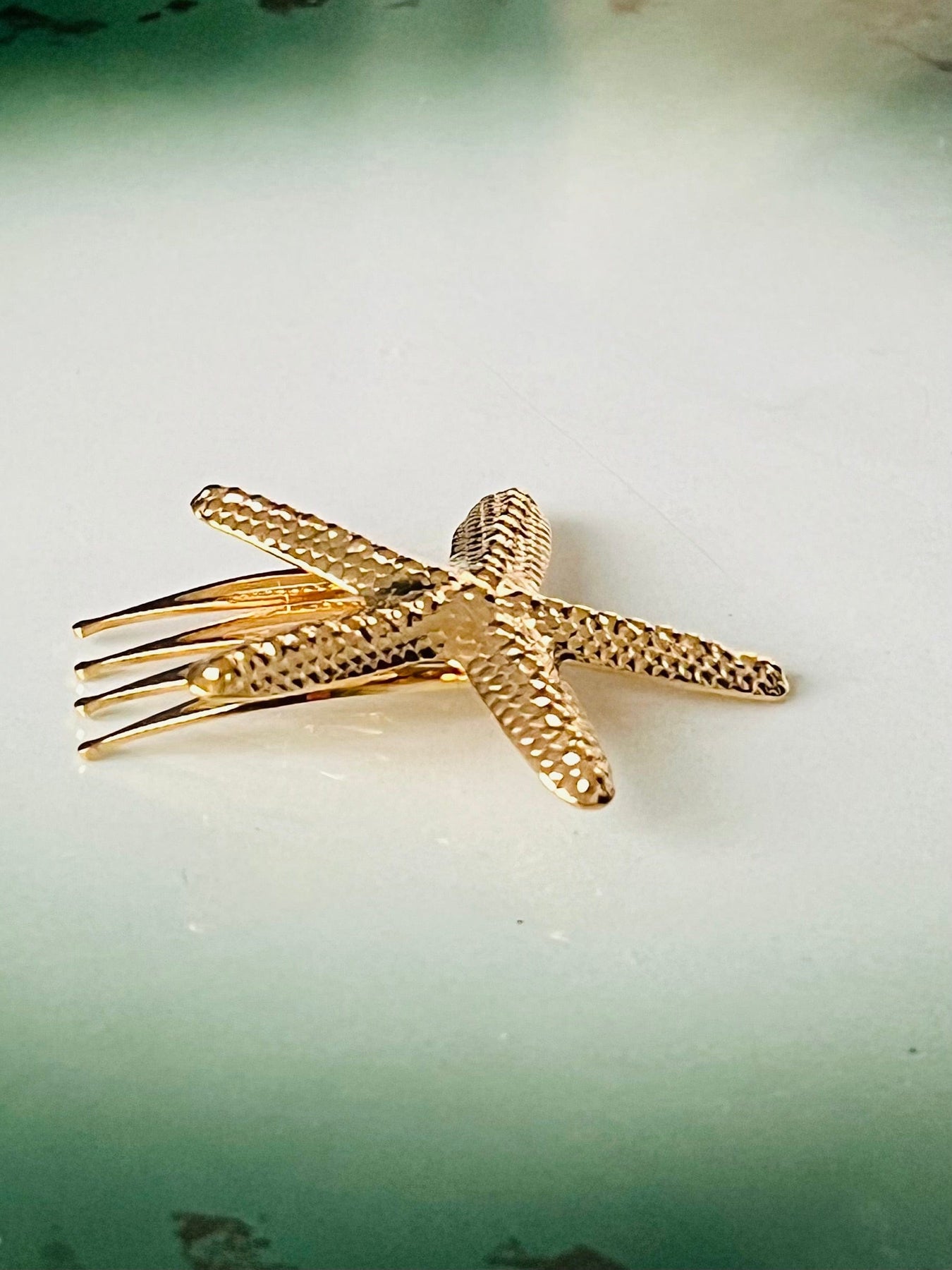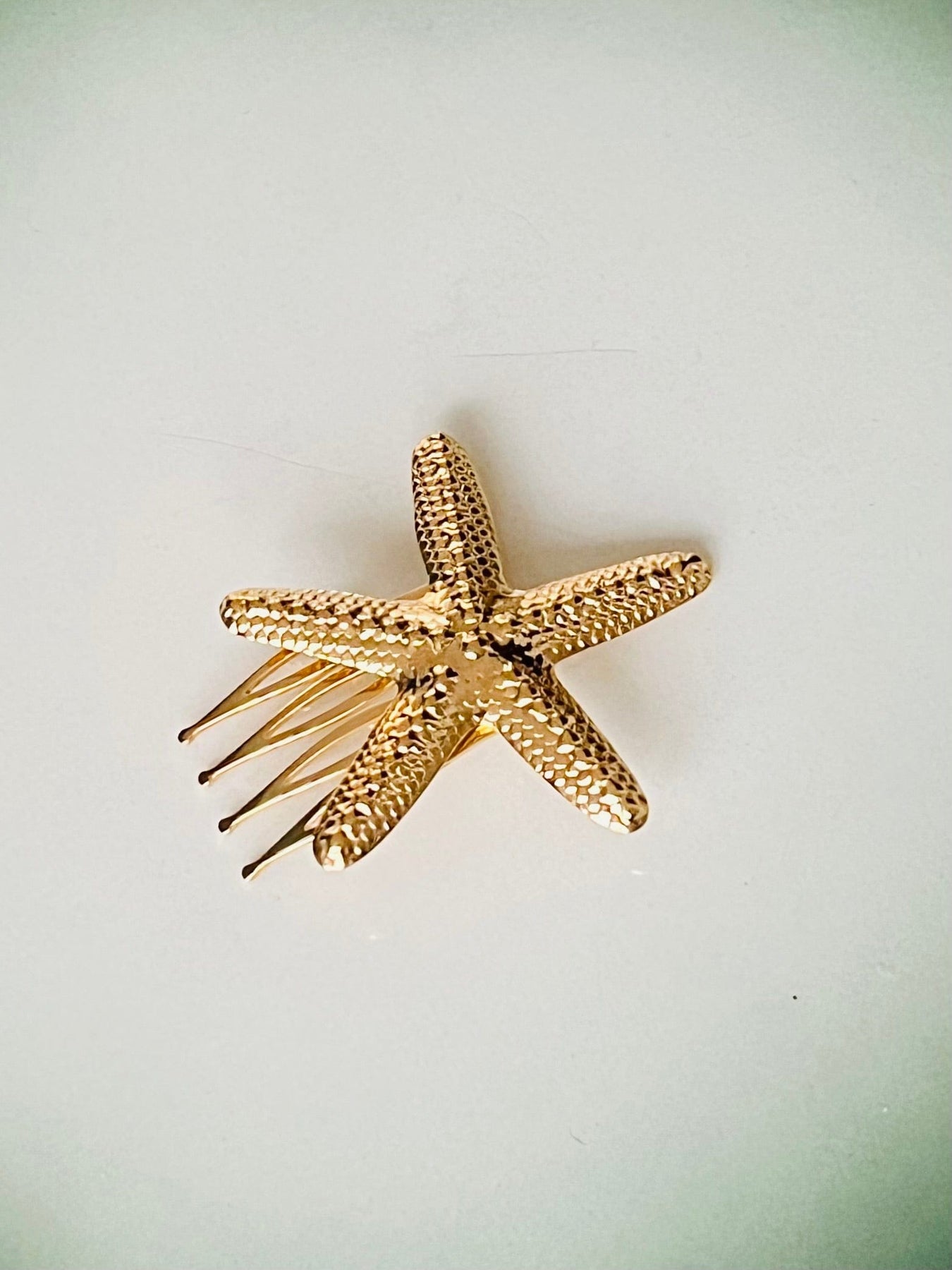Skal det være en nydelig hårkam formet som en sjøstjerne i håret? Denne falt vi pladask for, og er som et lite smykke i håret ditt🤩 Hårkammer er et av våre favoritt-redskap for å fikse sveisen på et blunk. Denne sitter godt i håret og er skikkelig dekorativ. Sett flere hårkammer sammen for å løfte håret til nye høyder, eller bruk en enkel i siden for å få håret bort fra ansiktet- her er det bare fantasien som setter begrensninger. Sjekk ut videoen blant bildene hvor Elise viser frem hvordan hun bruker hårkammer. Denne er laget av 18 KT gullbelagt rustfritt stål, og vil ikke falme eller sverte av i fargen.