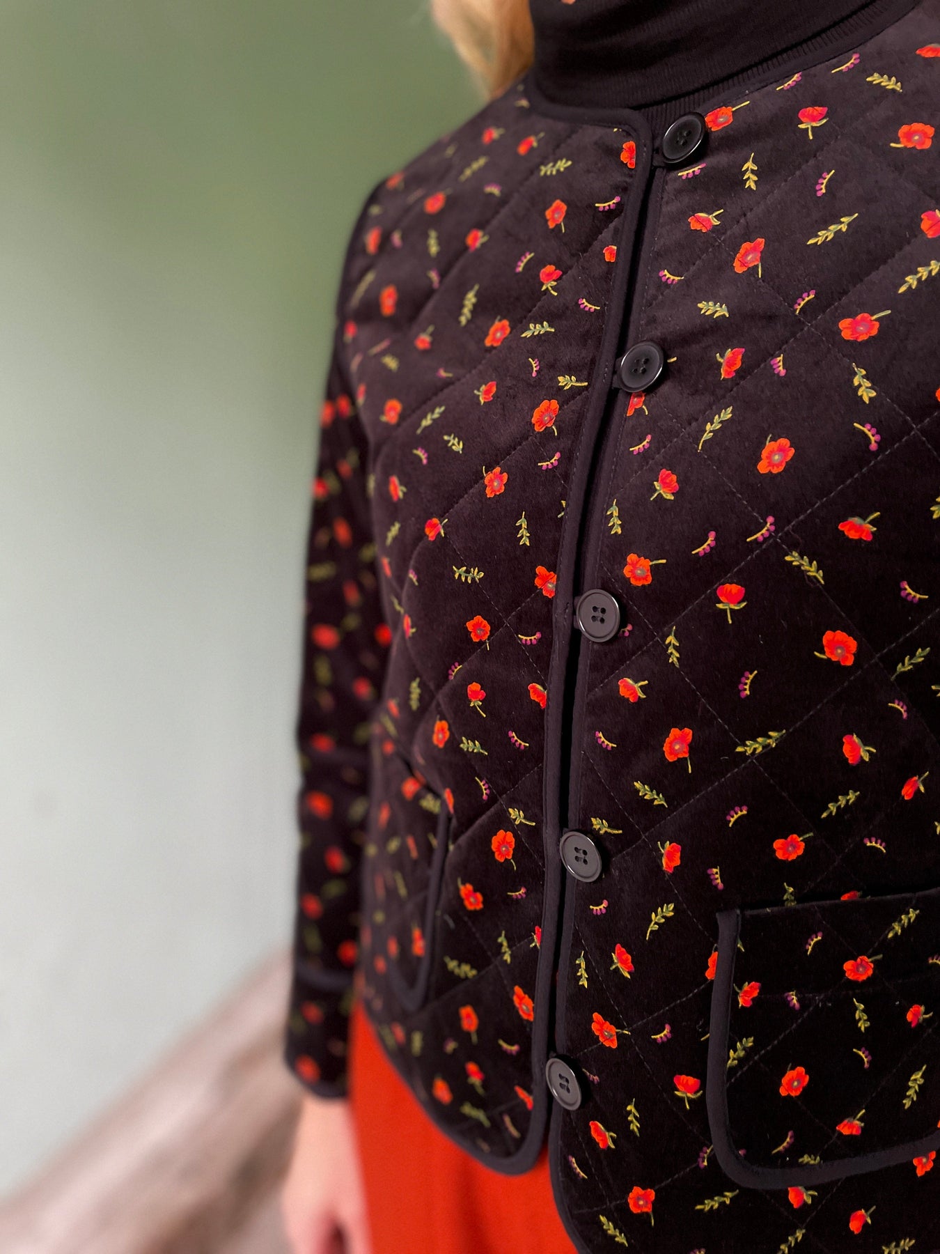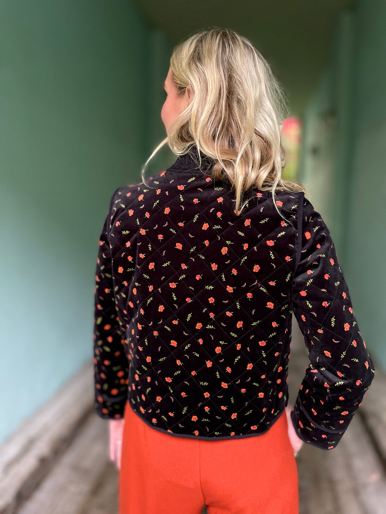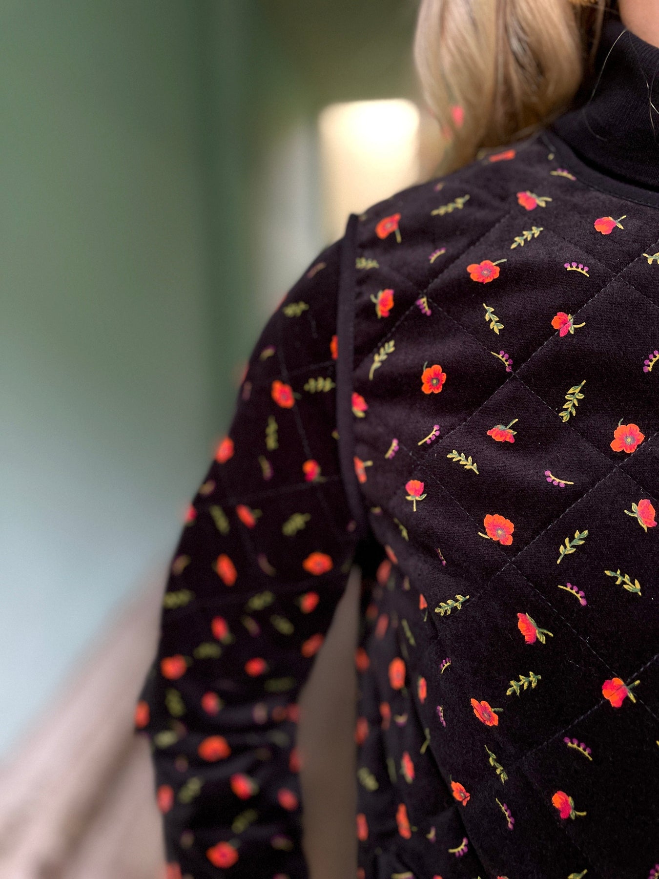 - Kort quiltet jakke i svart velur/fløyel med blomsterprint