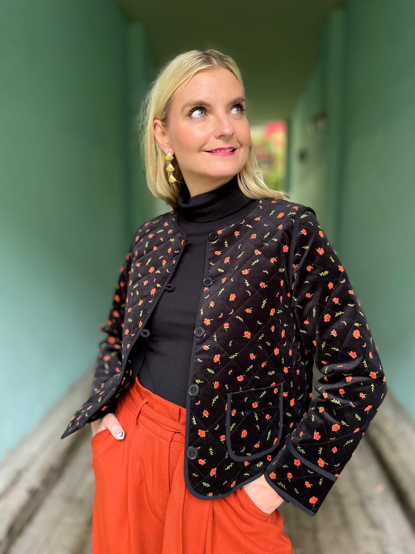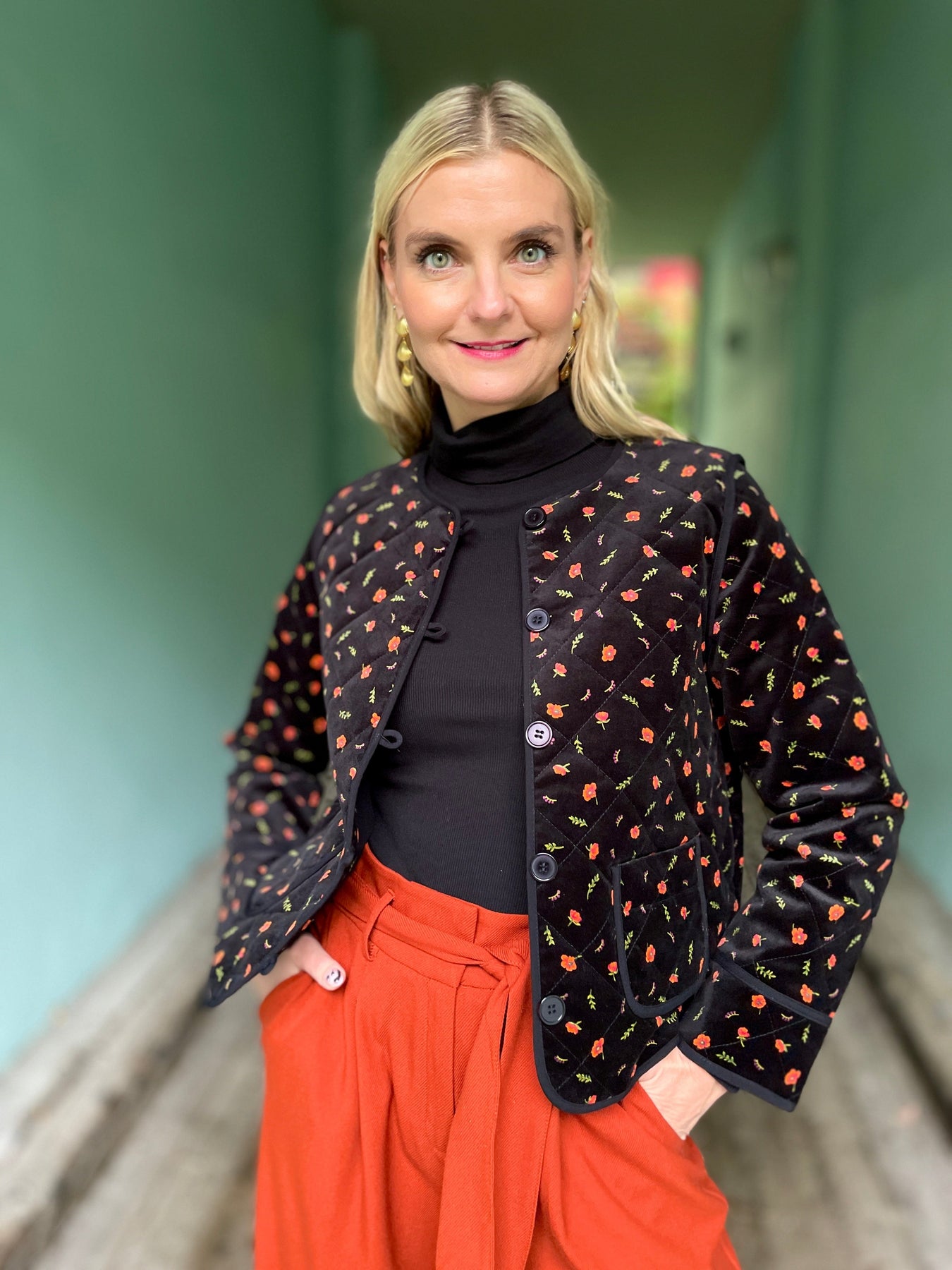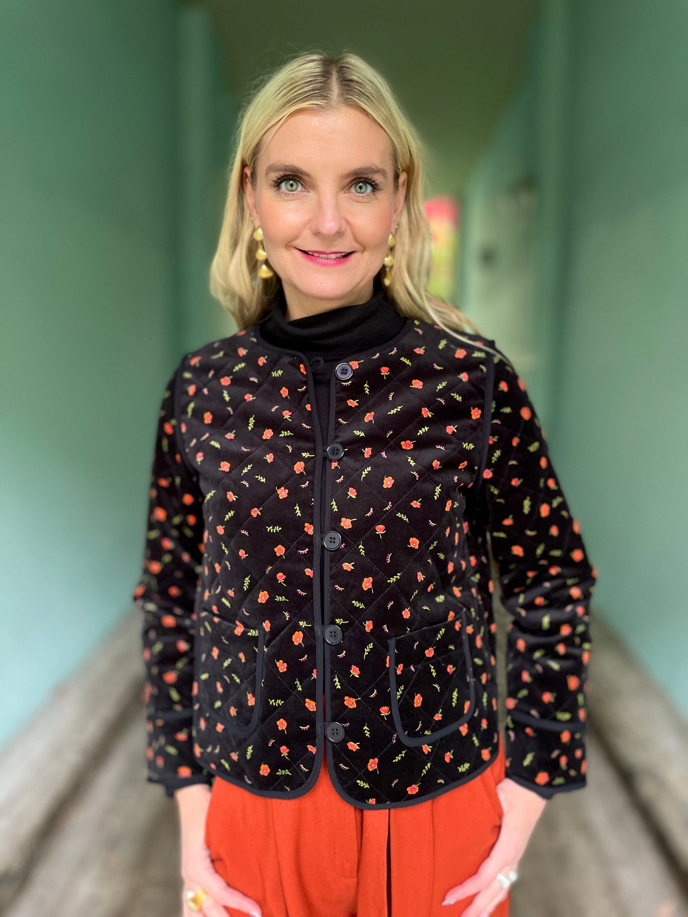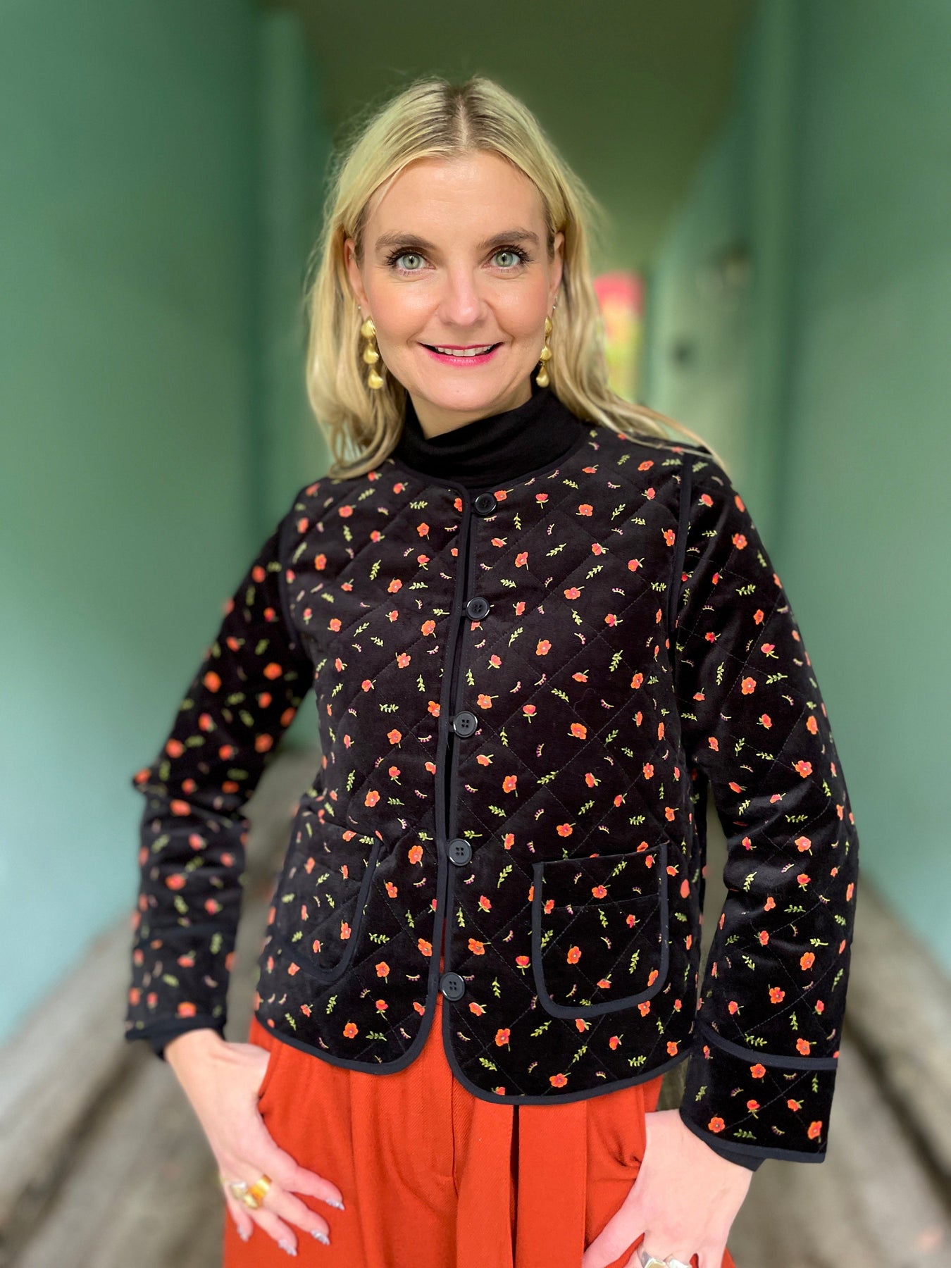 - Kort quiltet jakke i svart velur/fløyel med blomsterprint