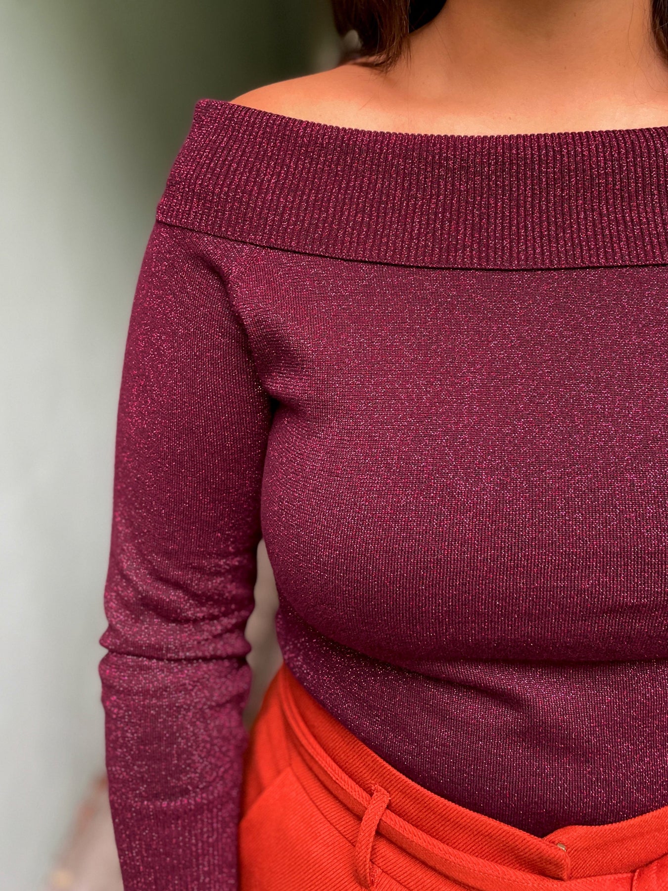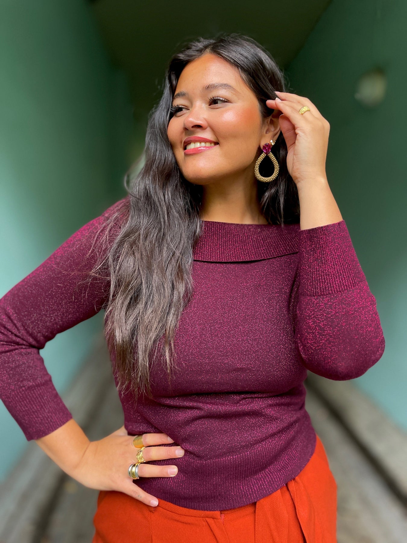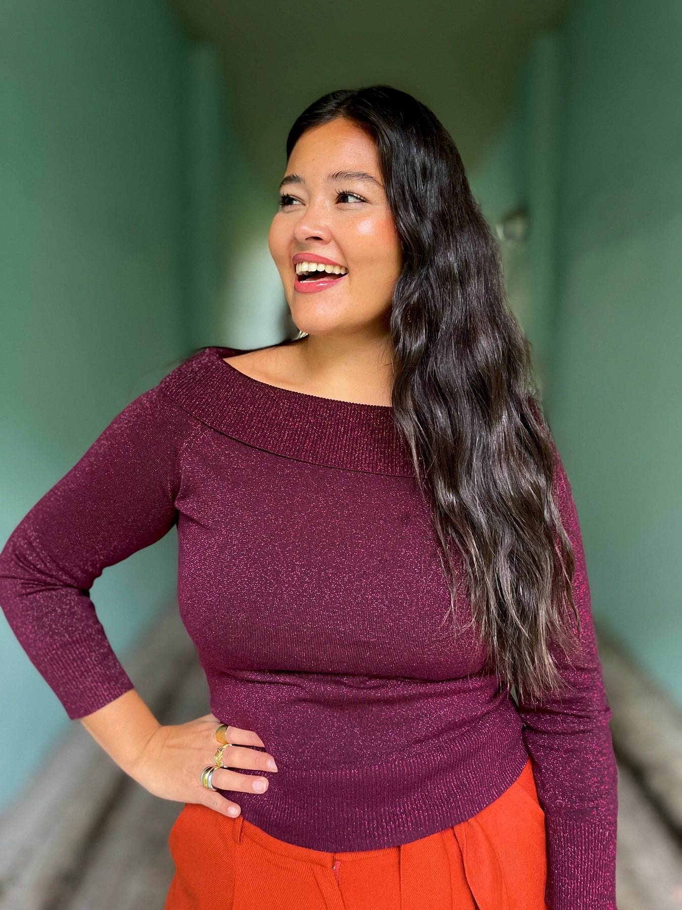En elegant genser med masse glam! Mirta topp glitrer i en kjempefin, dyp burgunder-rød farge og denne vil vi bruke både på kontoret og ut i sene kvelder💃 Den brede båthalsen kan trekkes elegant ned på skuldrene om du ønsker å vise litt hud, og den smale passformen gjør den til den perfekte partneren til alt fra paljettskjørtet til yndlingsjeansen. Genseren er strikket i 75% bærekraftig bomull og er myk, pustende og deilig å ha på seg. En topp som garantert får deg til å føle deg smashing! 💃