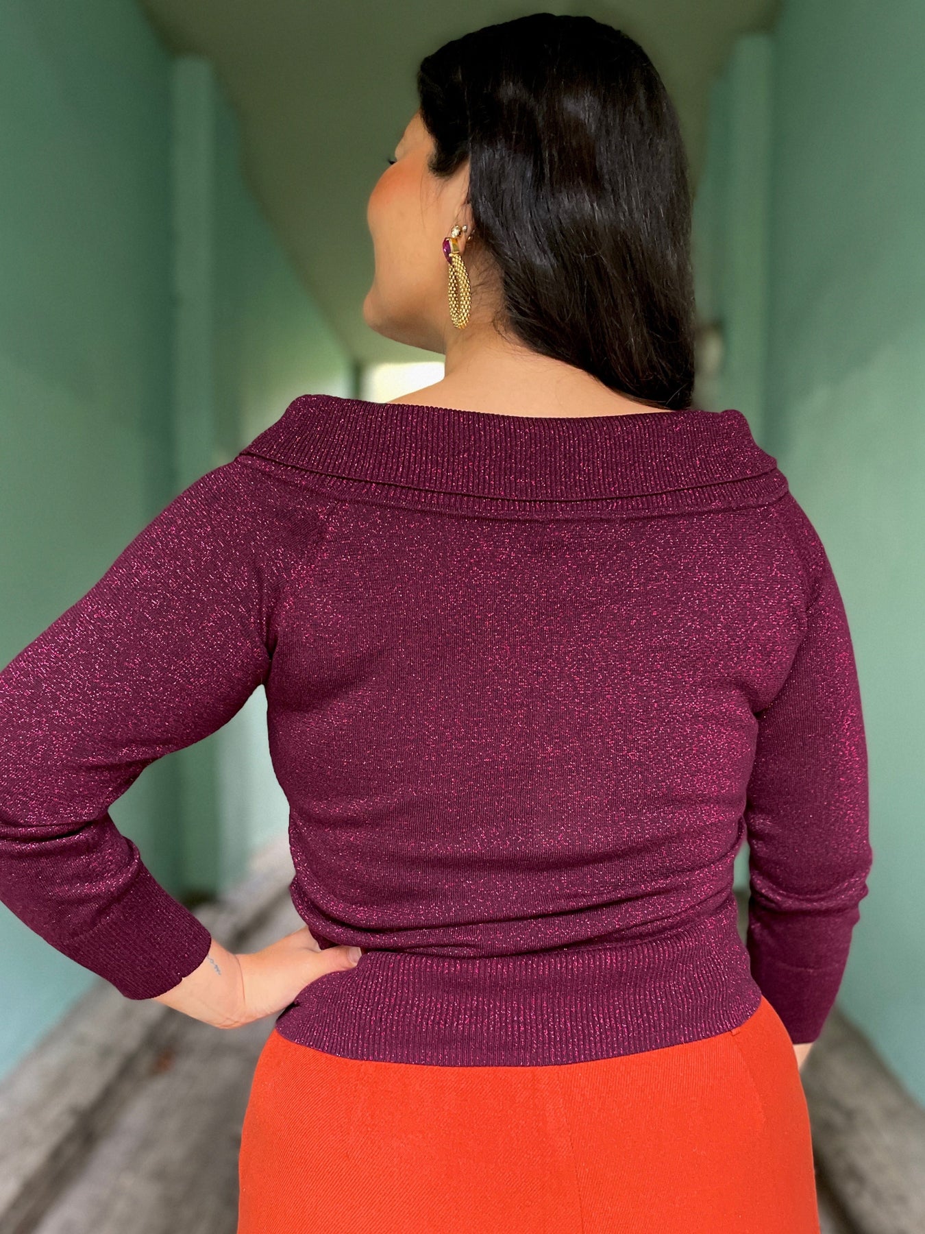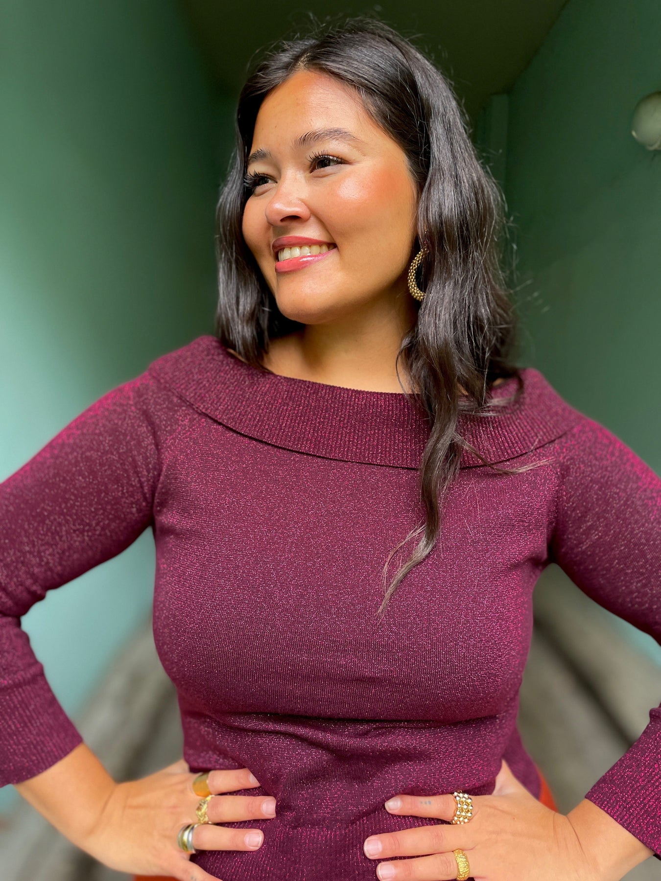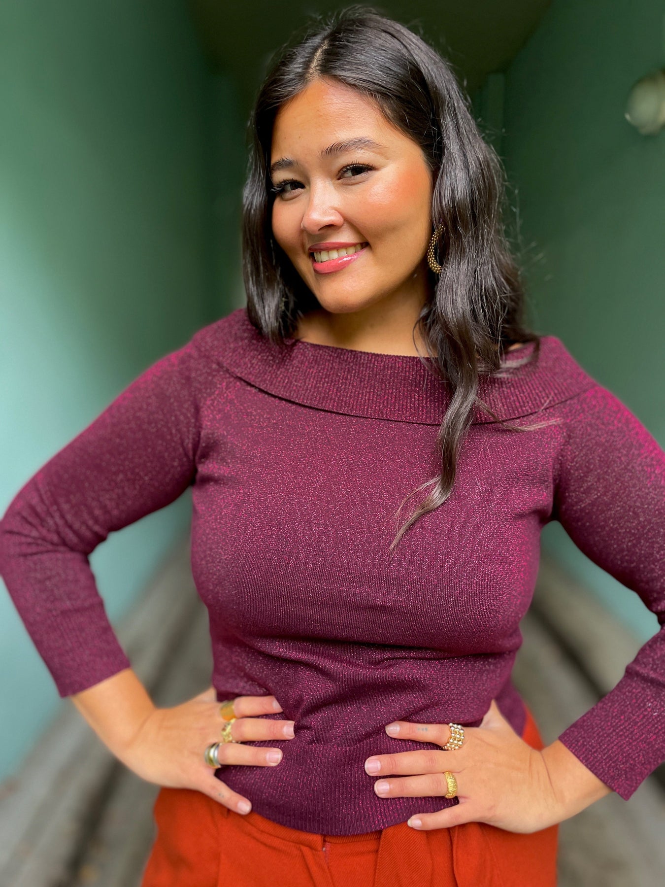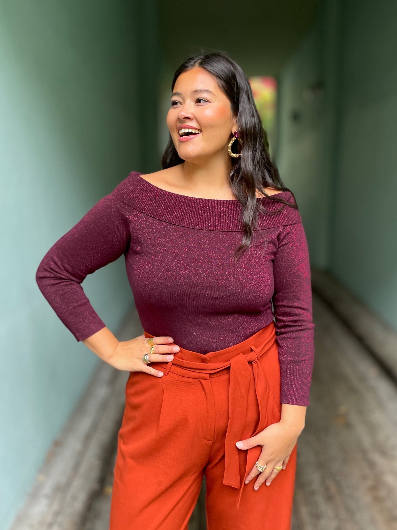 En elegant genser med masse glam! Mirta topp glitrer i en kjempefin, dyp burgunder-rød farge og denne vil vi bruke både på kontoret og ut i sene kvelder💃 Den brede båthalsen kan trekkes elegant ned på skuldrene om du ønsker å vise litt hud, og den smale passformen gjør den til den perfekte partneren til alt fra paljettskjørtet til yndlingsjeansen. Genseren er strikket i 75% bærekraftig bomull og er myk, pustende og deilig å ha på seg. En topp som garantert får deg til å føle deg smashing! 💃