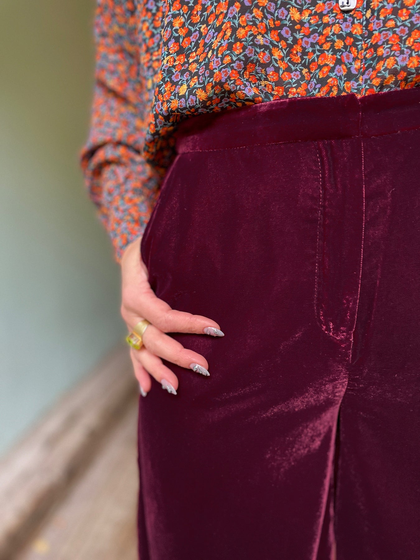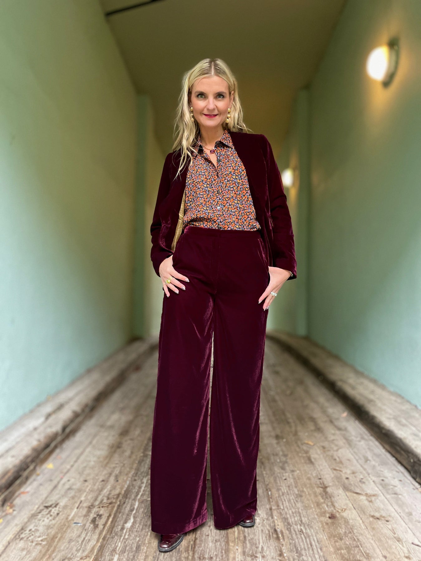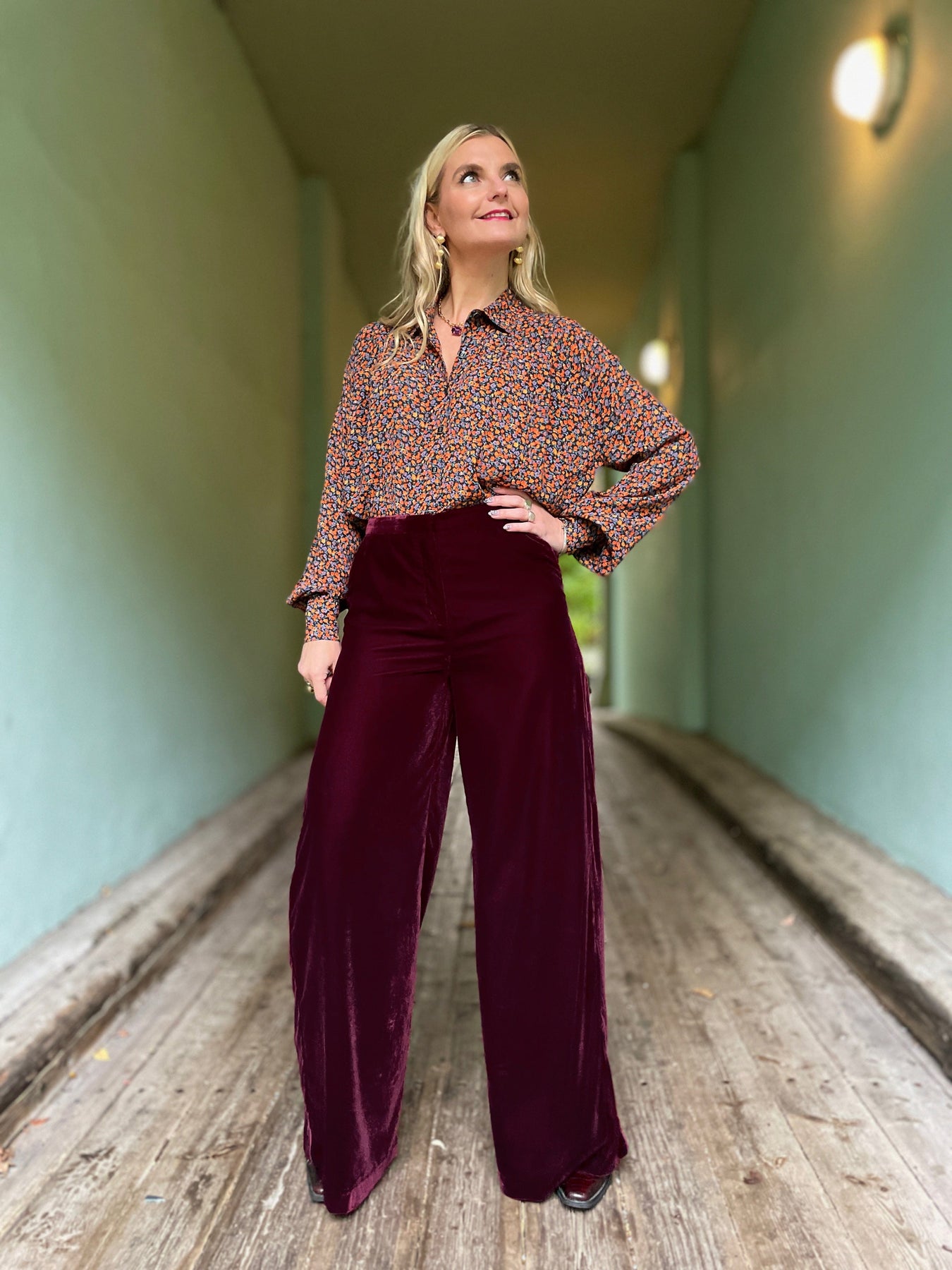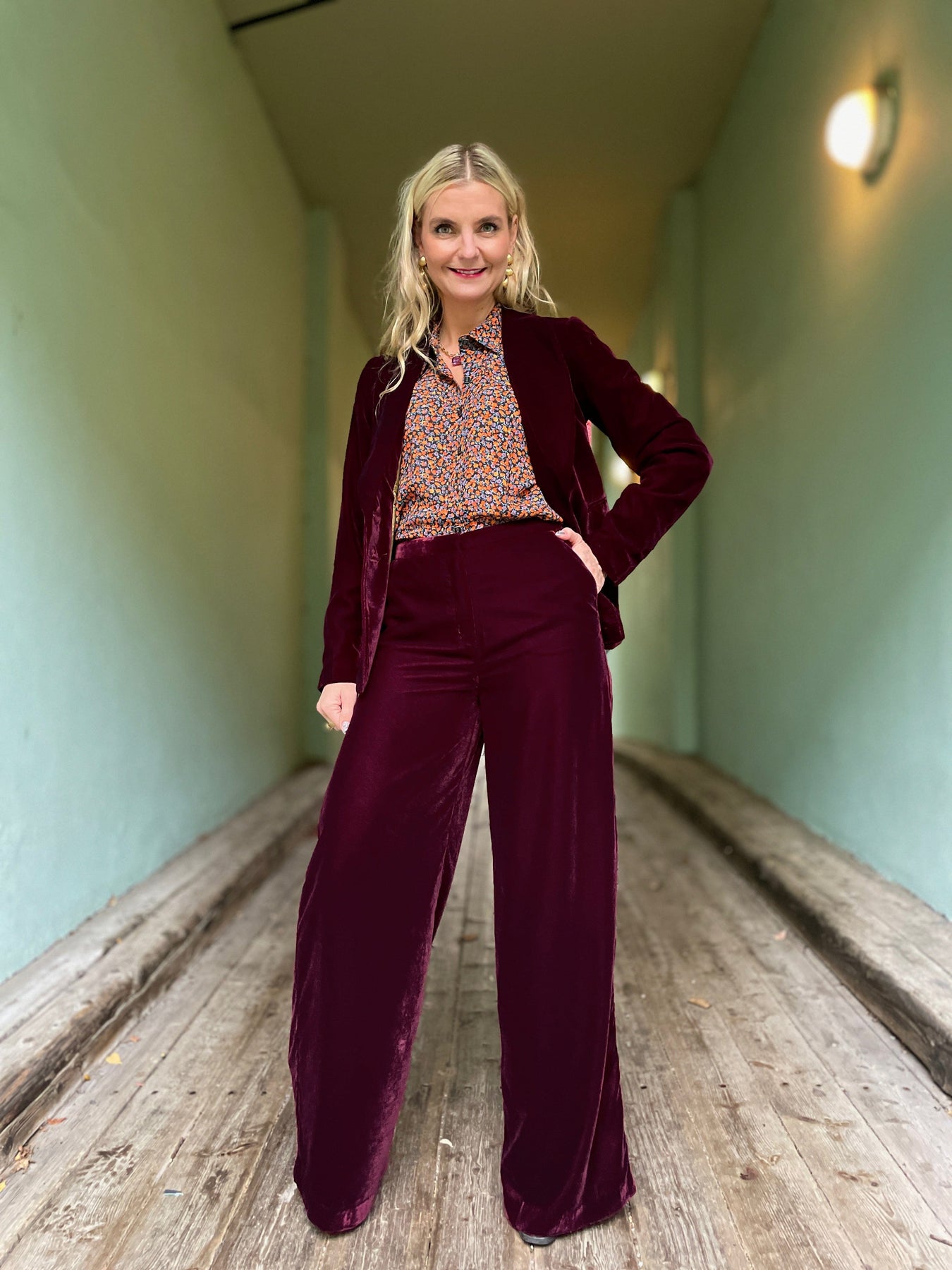 Disse buksene i myk fløyel er rene 70-tallsdrømmen! Den dype, burgunderrøde fargen er ALT vi ønsker oss denne høsten🍇Stoffet oser eleganse, og de vide, rette beina gir en kul og sofistikert silhuett. Peppa sitter høyt og godt i livet og har lommer i sidene. Buksene er perfekte både til fest med høye hæler og bluse, eller til en mer avslappet look med chunky boots og grov strikk. For en hel fløyels-dress, sjekk ut den matchende Brooke blazeren😍