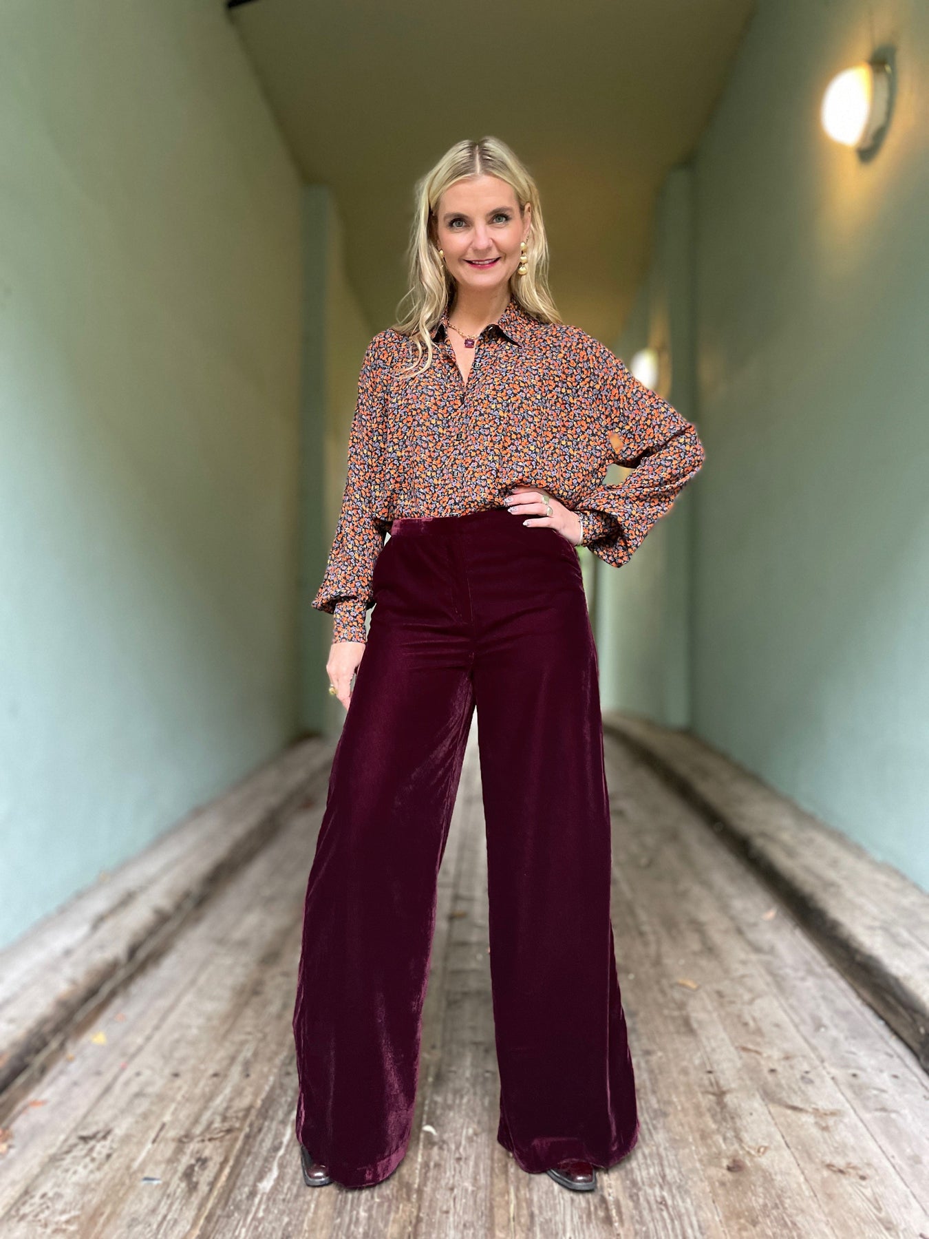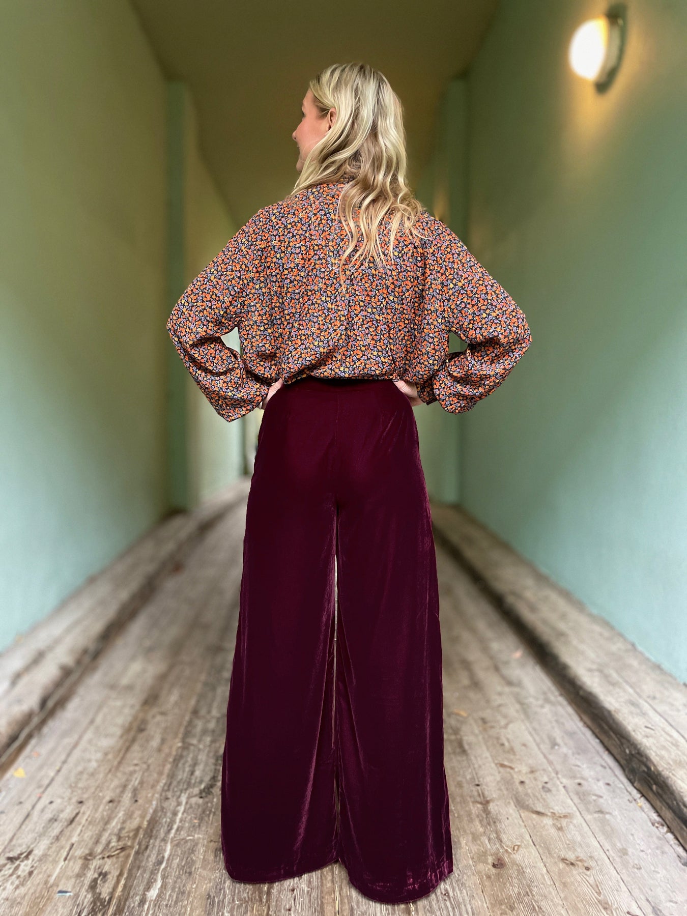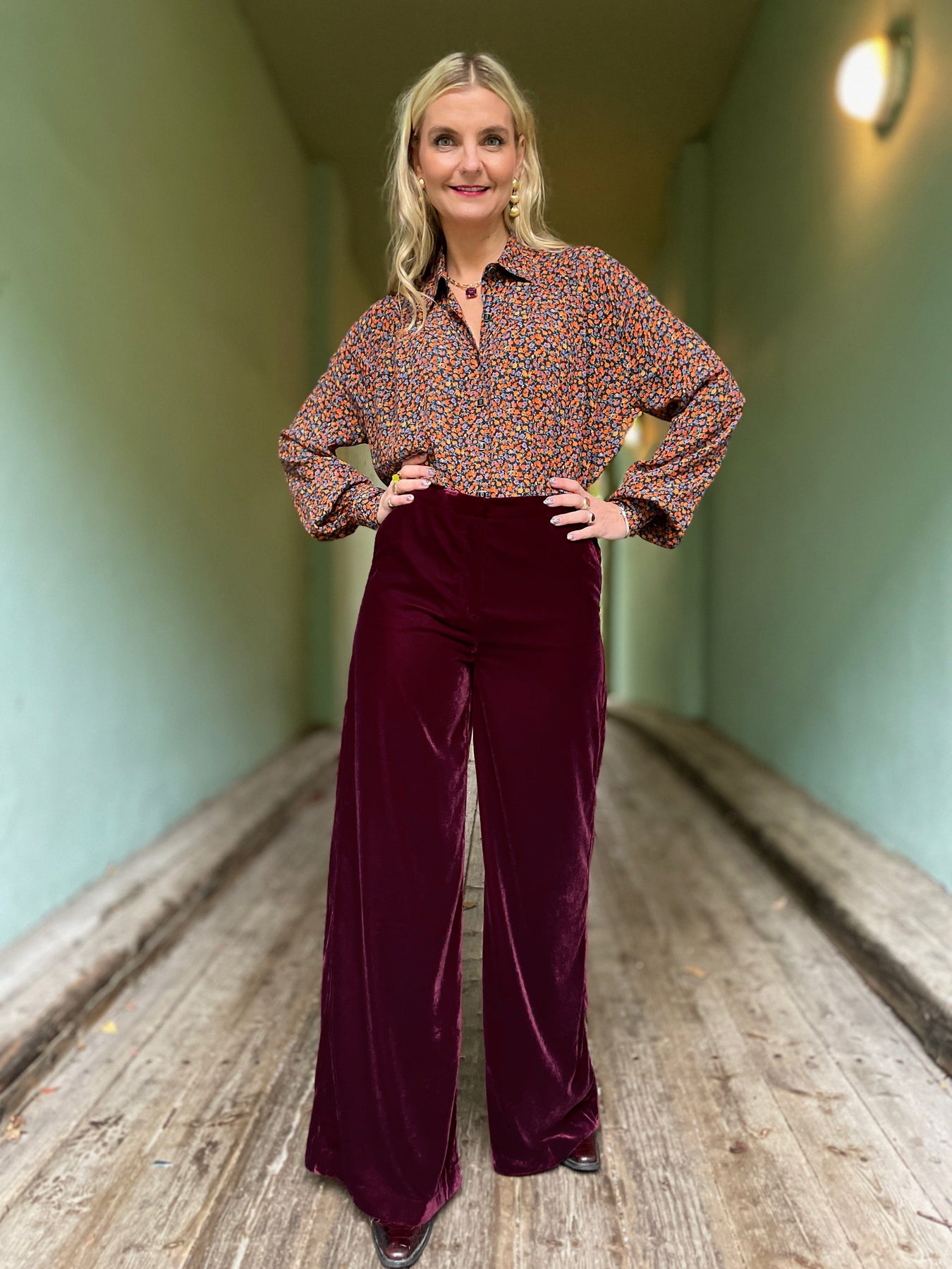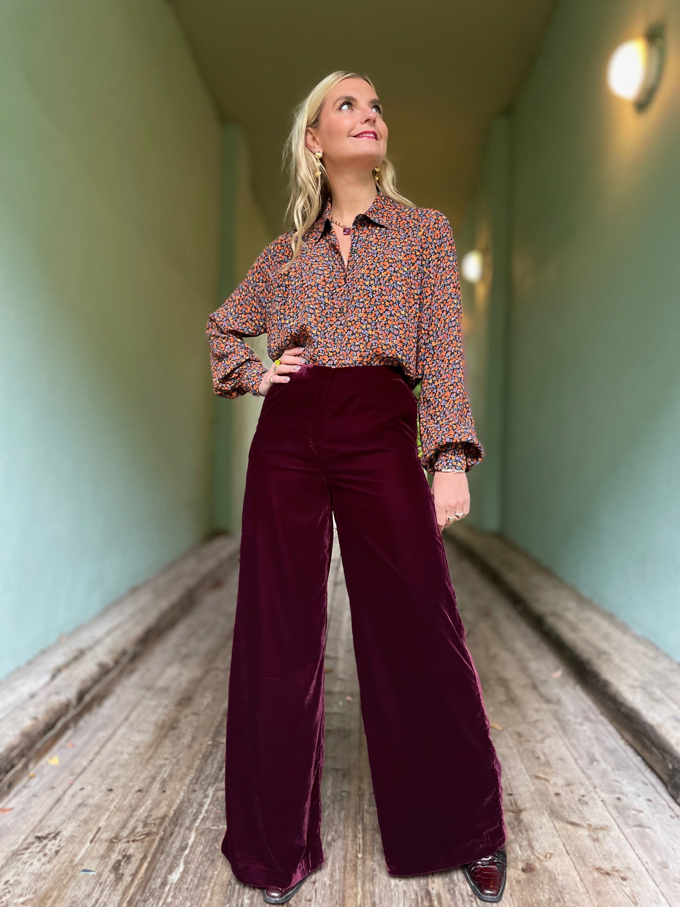 Disse buksene i myk fløyel er rene 70-tallsdrømmen! Den dype, burgunderrøde fargen er ALT vi ønsker oss denne høsten🍇Stoffet oser eleganse, og de vide, rette beina gir en kul og sofistikert silhuett. Peppa sitter høyt og godt i livet og har lommer i sidene. Buksene er perfekte både til fest med høye hæler og bluse, eller til en mer avslappet look med chunky boots og grov strikk. For en hel fløyels-dress, sjekk ut den matchende Brooke blazeren😍