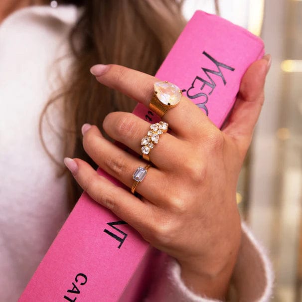 Denne chunky gullringen er en favoritt i Salongen fordi den både er vakker og tøff. Vi kjører titt og ofte flere ringer samtidig. Ingenting glitrer som Swarovski og Caroline Svedbom er en mester på å bruke farger som gir oss vann i munnen. Vi elsker den kule, brun-oransje fargen på denne ringen!