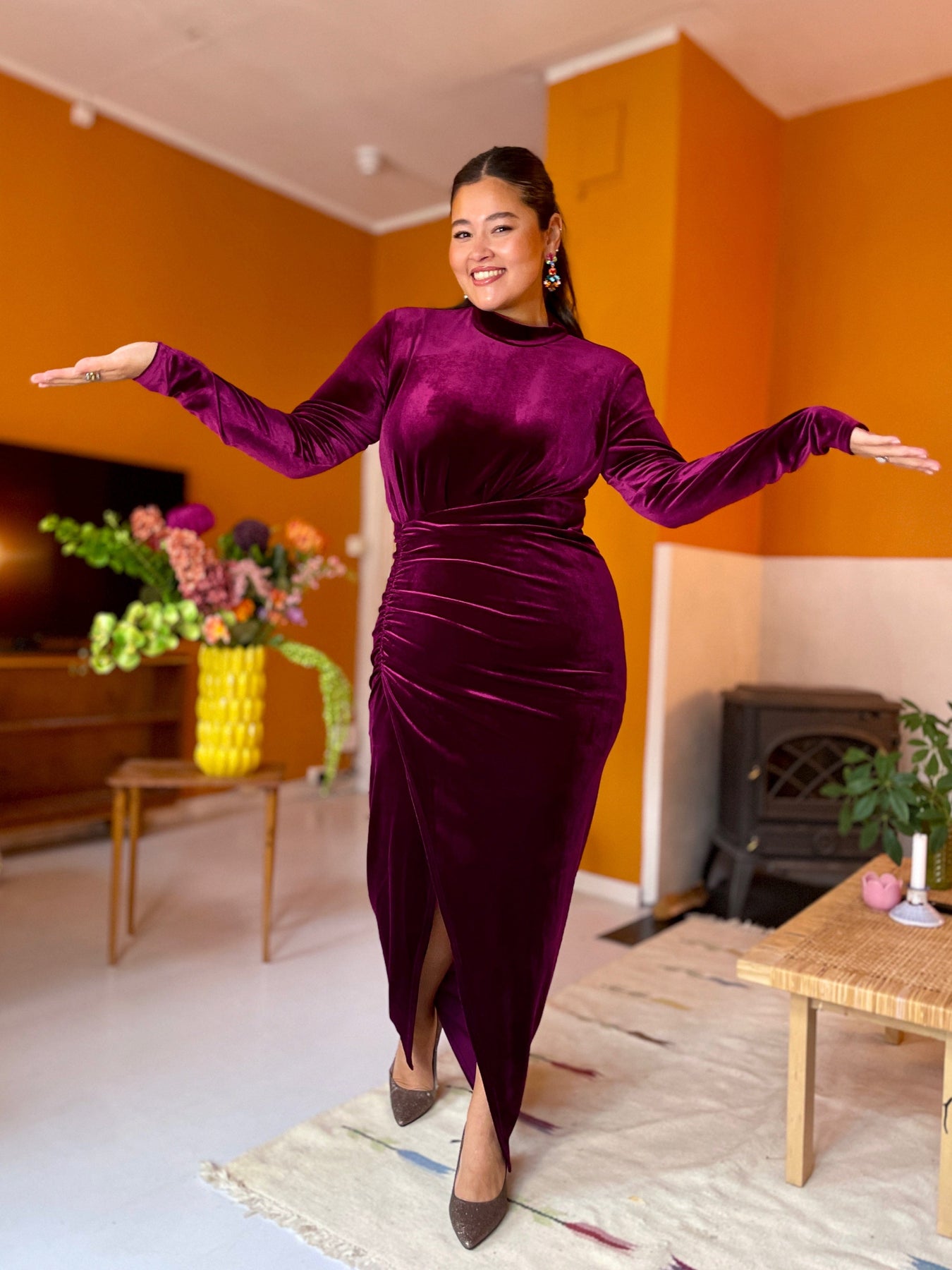 Glory-kjolen fra Cras forsvant som dugg for solen i fjor, og nå er den tilbake i nydelig burgunder♥️! Kjolen er sydd i myk, stretchy fløyel som både ser fantastisk ut, og føles komfortabel på. Draperingene i midjen fremhever figuren din, mens den høye splitten gir kjolen en ekstra dose drama! Dette er en kjole som oser av glamour med lange armer, høy hals, splitt og skulderputer! Vi føler oss SÅ elegante i denne kjolen og fargen er bare helt magisk🤩
