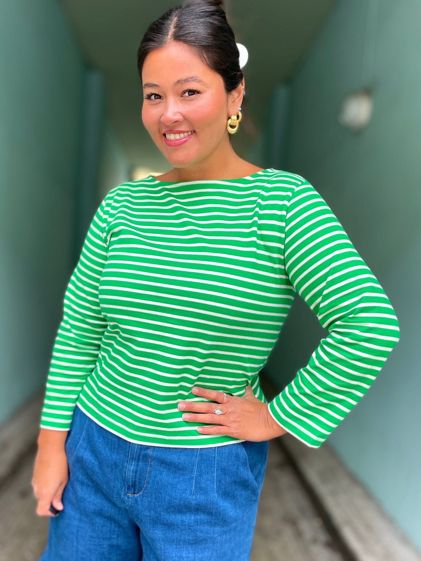 Vi digger striper og dette er en skikkelig glad-topp! Britney Stripe er laget i myk bomull som føles lett og behagelig mot huden - perfekt til hverdagsbruk året rundt. Den klare grønnfargen og de hvite stripene gir et rent og friskt uttrykk som er superlett å style med både denim, skjørt og under strikk. En enkel, tidløs basic som gjør antrekket litt mer levende 💚