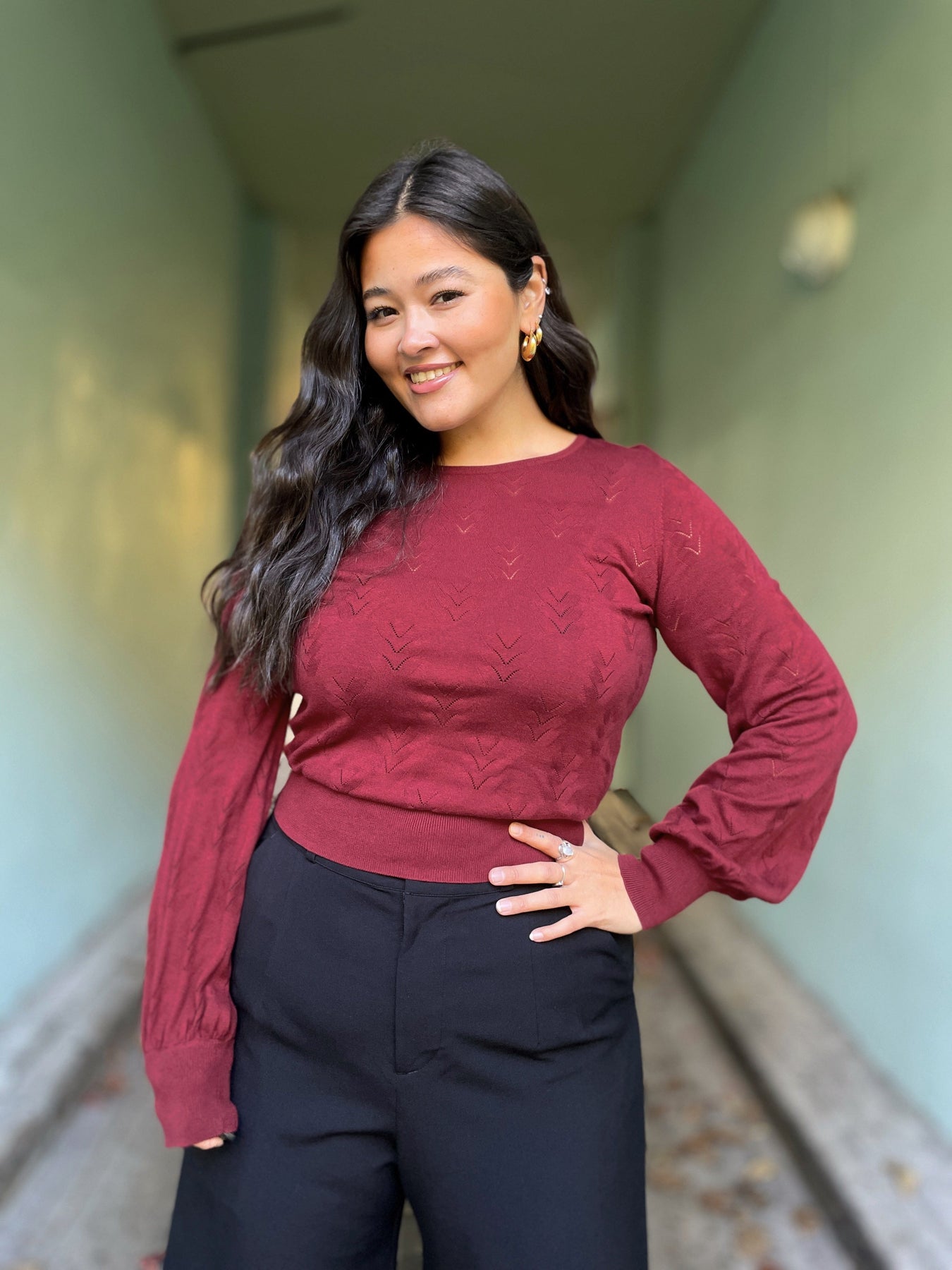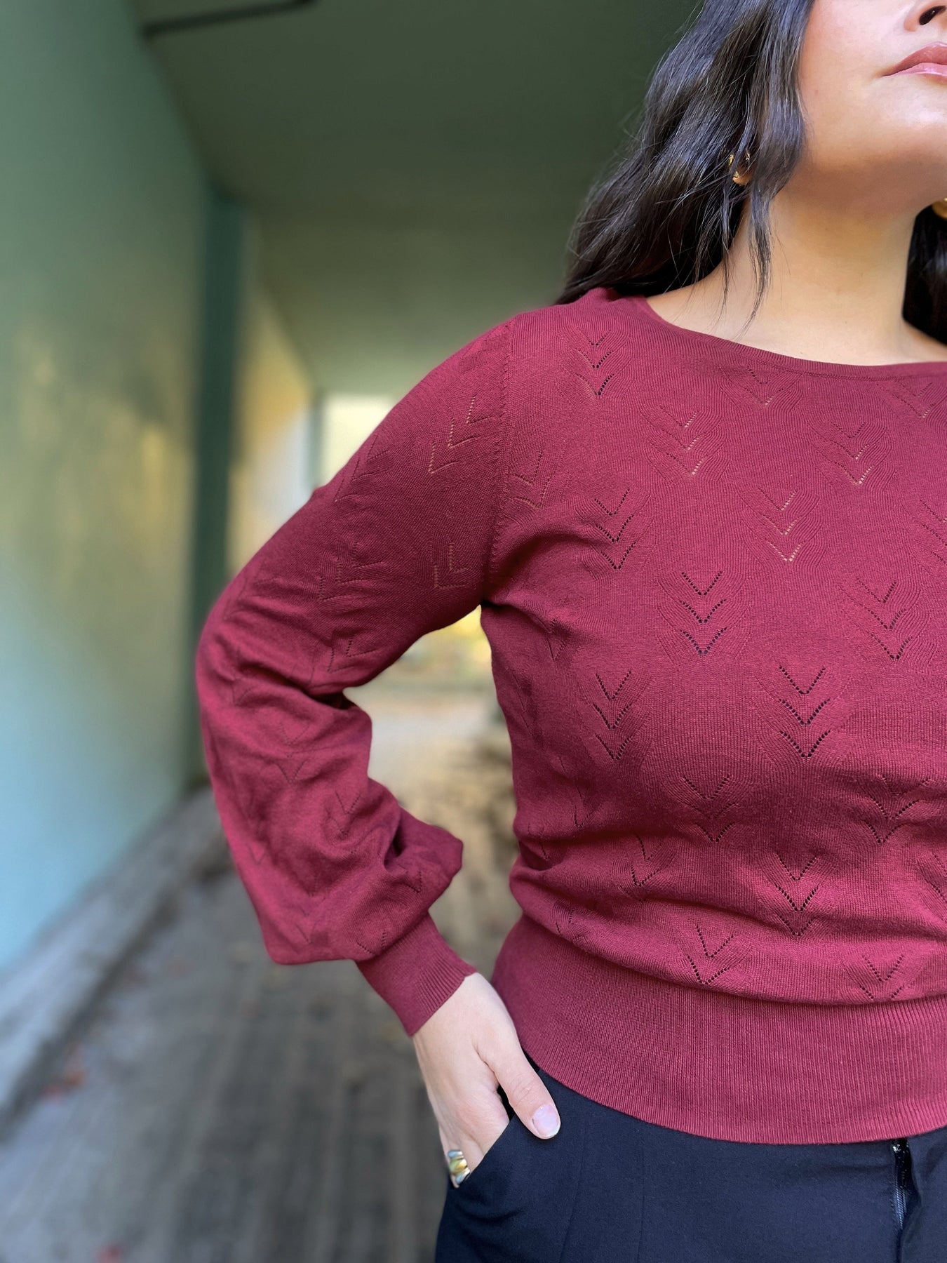 - Rund hals og lange ermer med lett puff