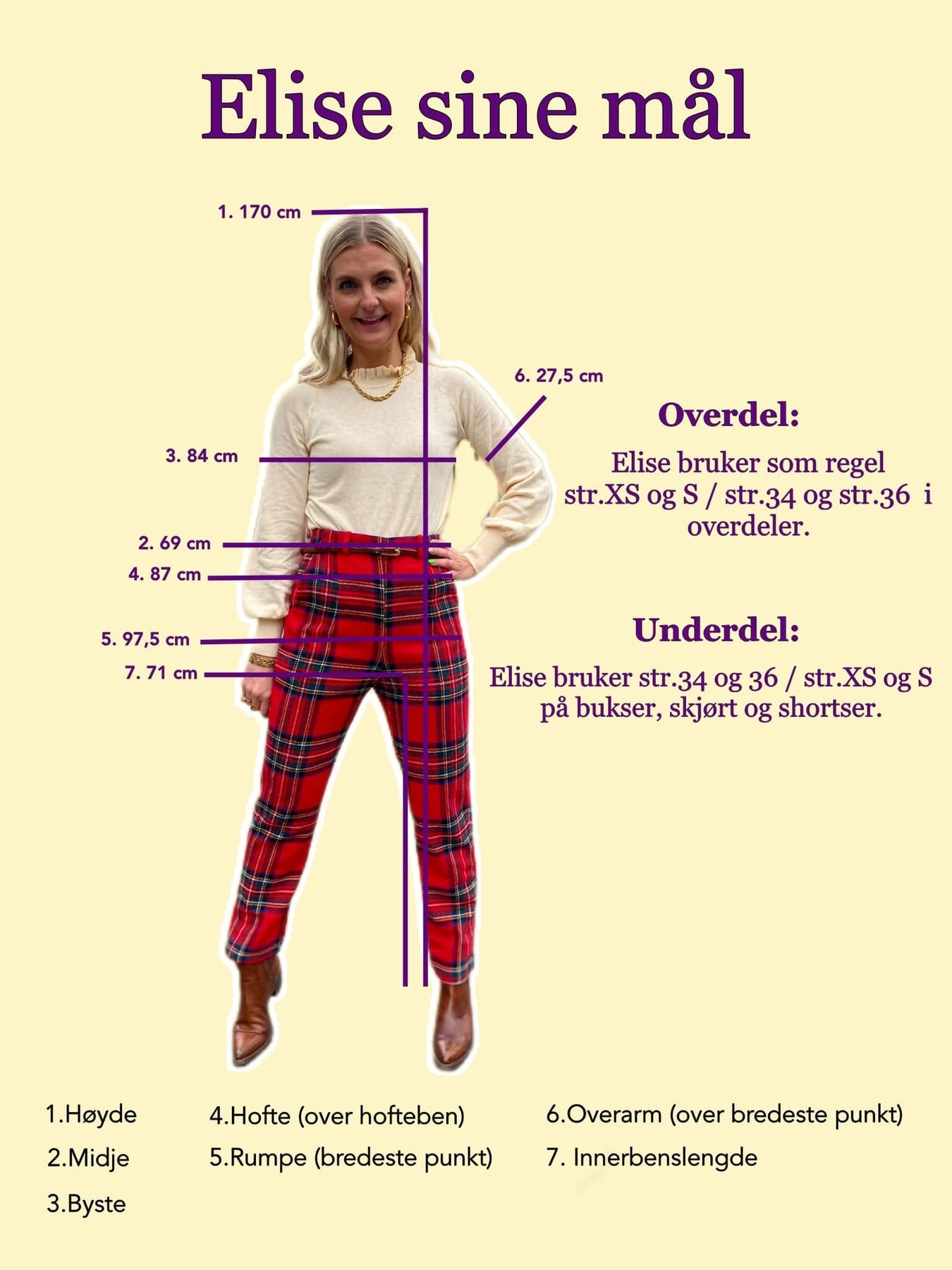 - Elises mål ligger nærmest størrelse S i overdeler og hun har på seg S på bildene