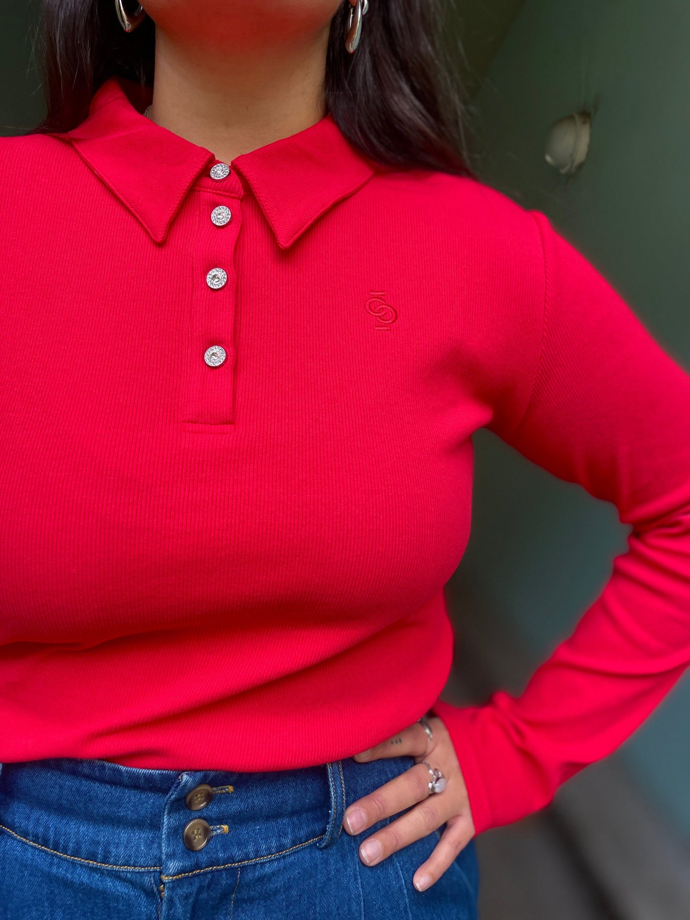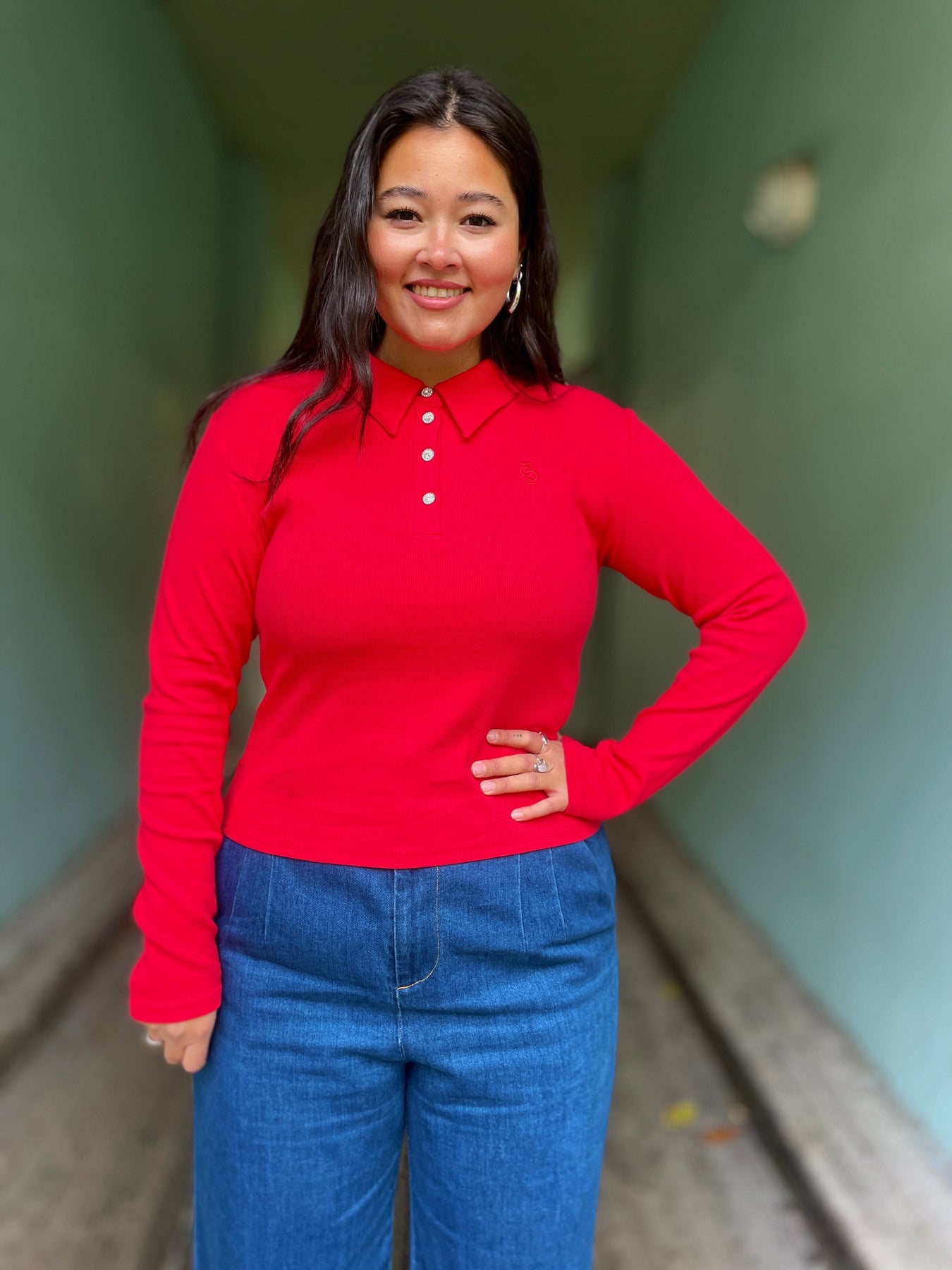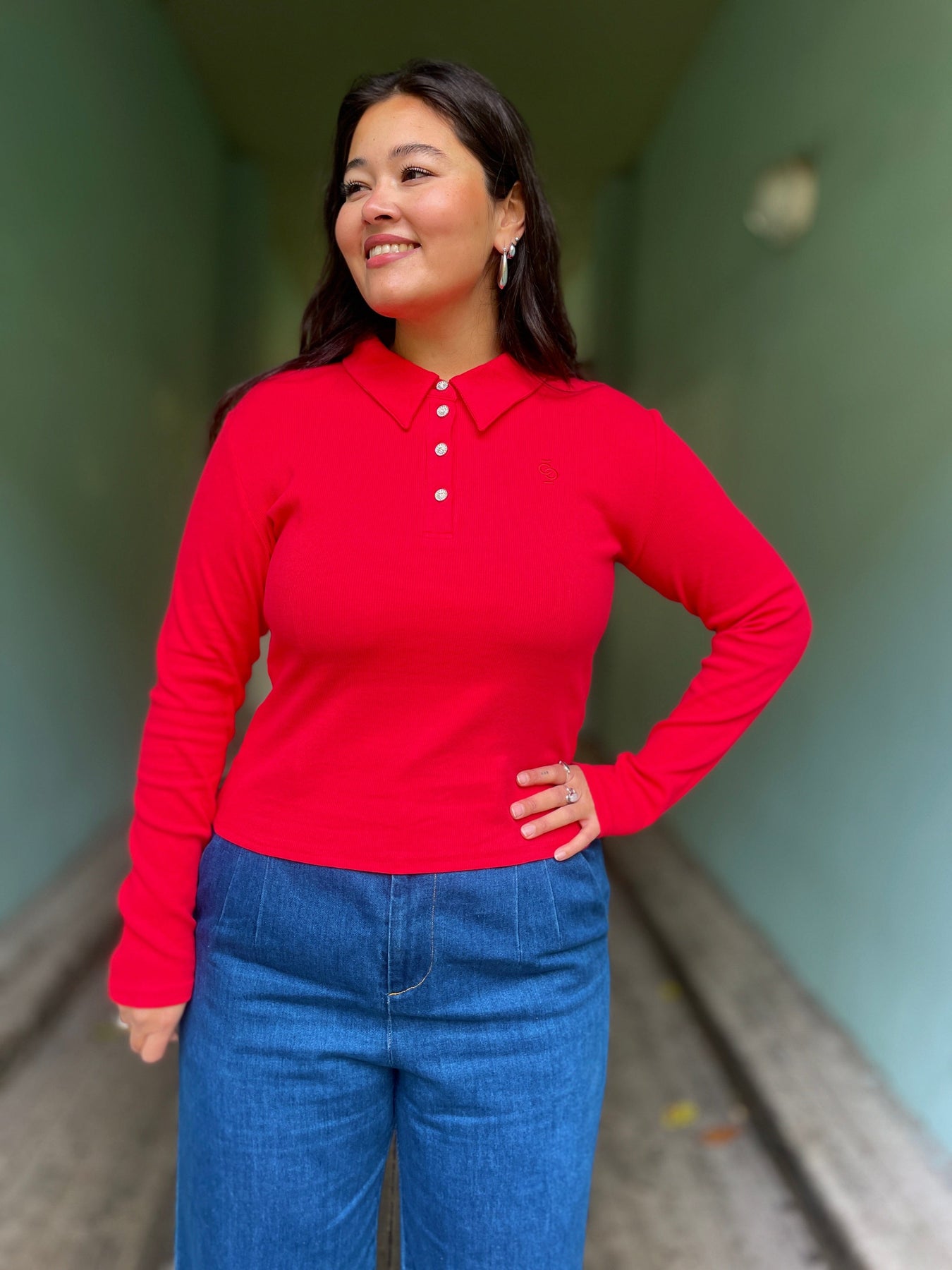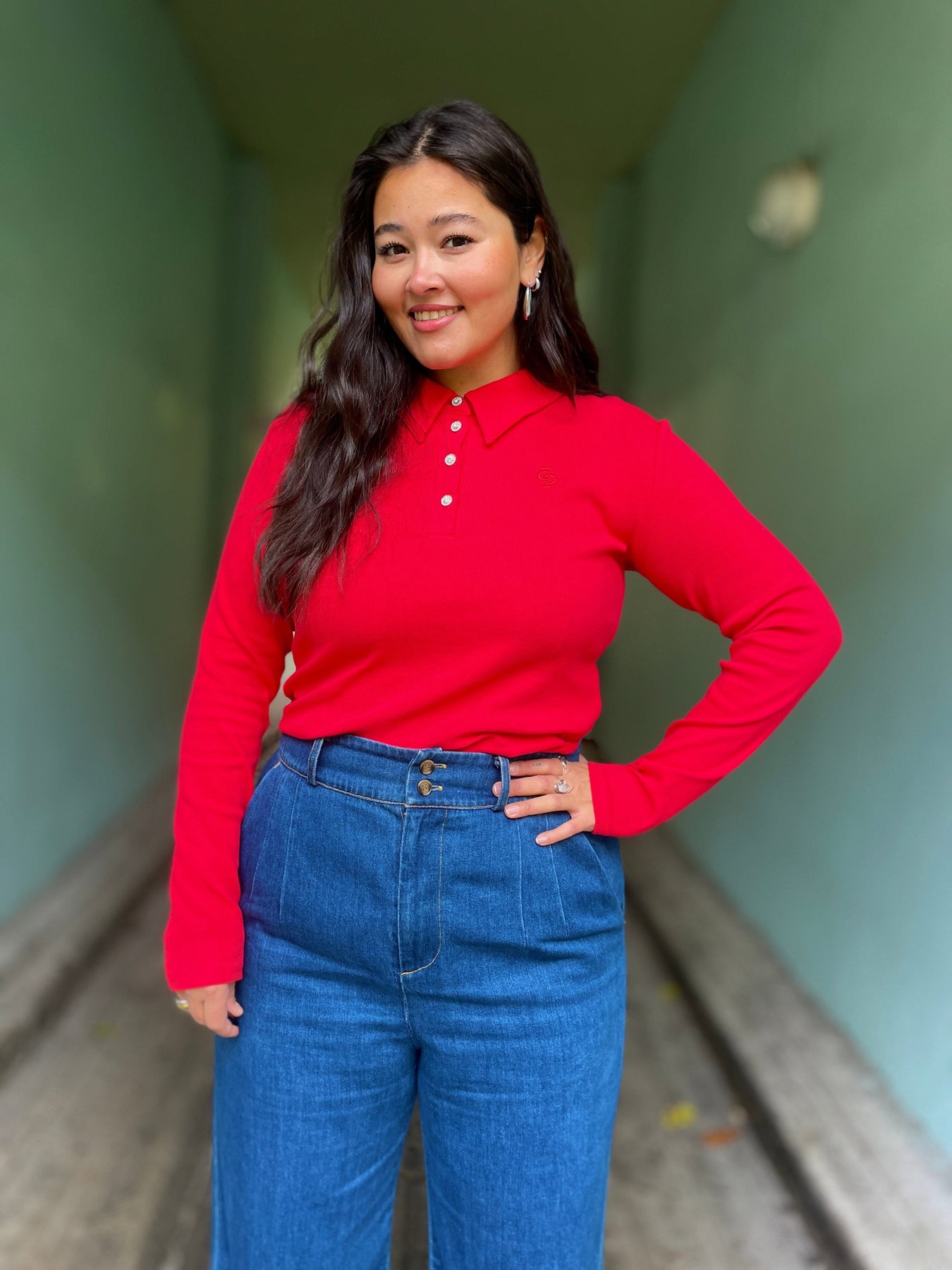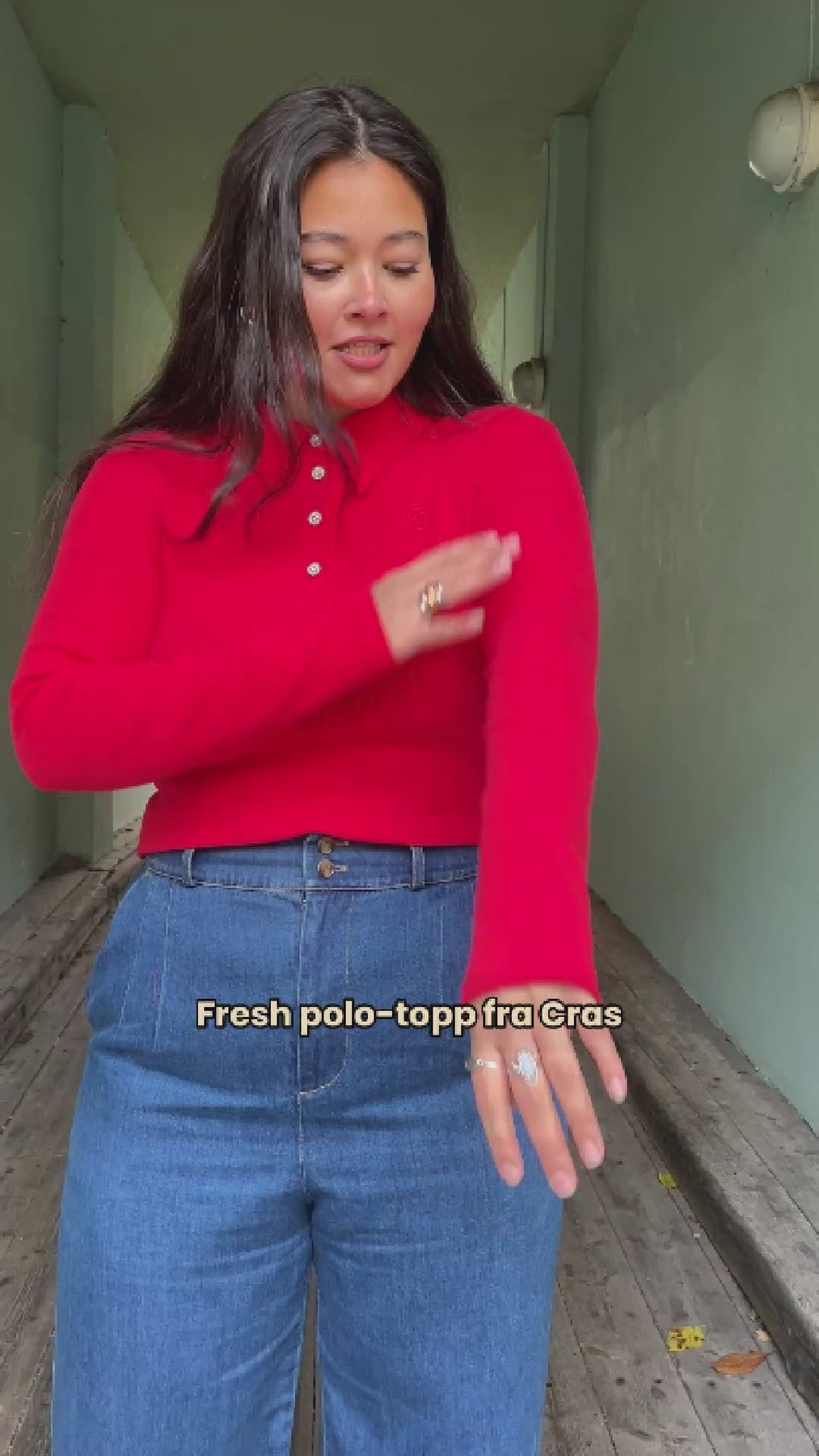 En stilig, rød genser med polokrage fra Cras som gir antrekket det lille ekstra🔥 Den enkle passformen gir et tidløst utrykk, men de glitrende knappene gir genseren piff! Stoffet er deilig, stretchy bomull og den er både behagelig å gå i og enkel å style. Bruk den til våre highwaist-bukser til hverdags, eller sammen med skjørt og blazer når du vil være litt ekstra chic❤️