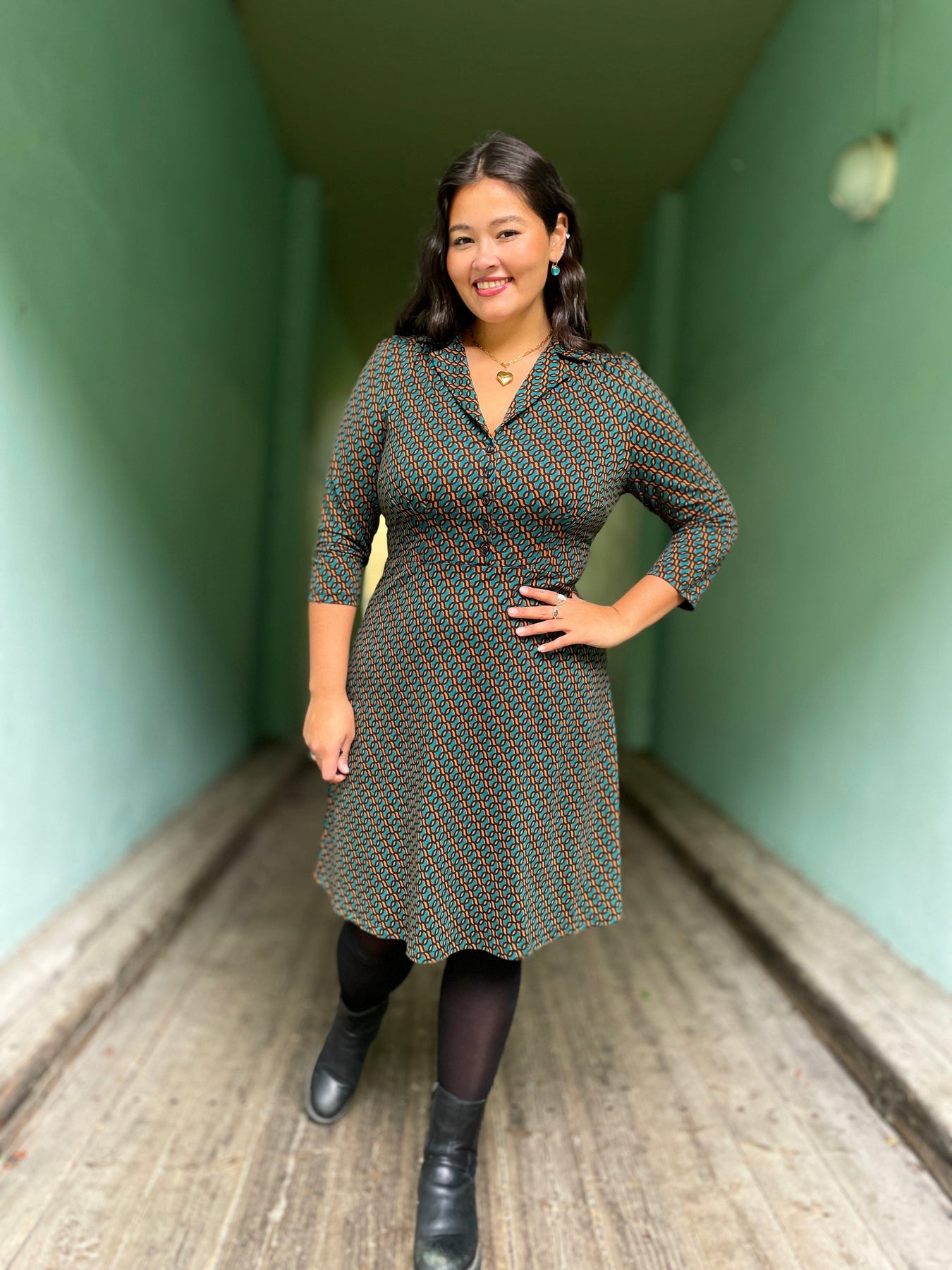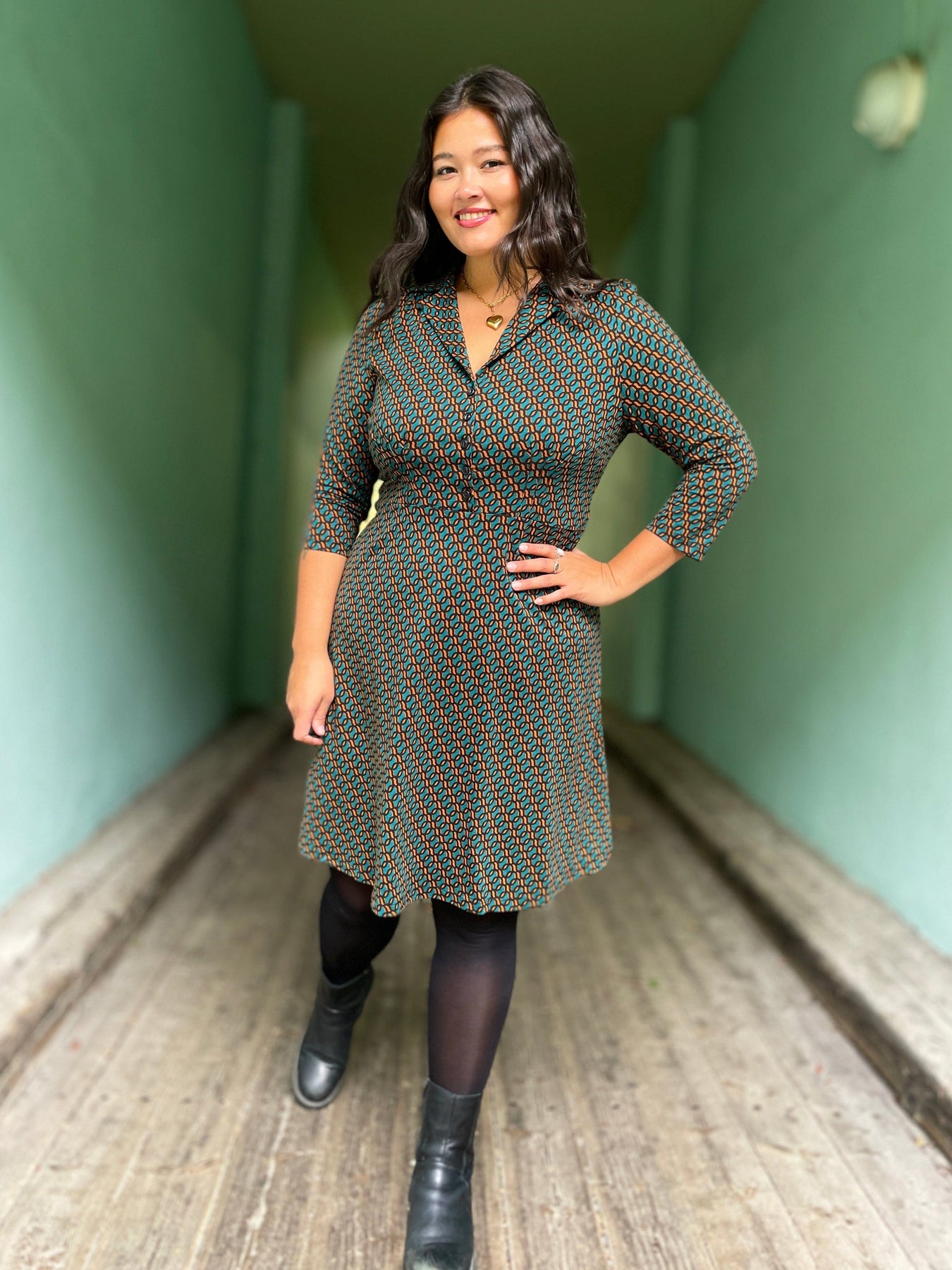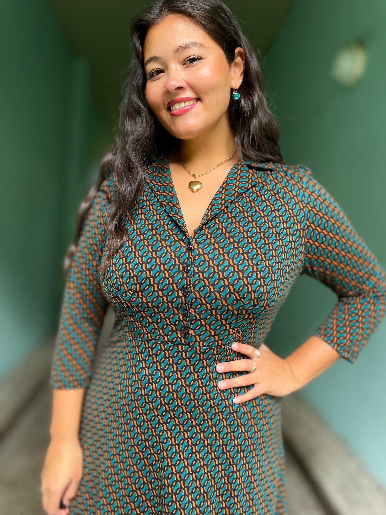 Endelig er den populære Diner-modellen tilbake! Dette er kjolen som fikser både kontordagen og middagsplanene etterpå! Diner Brisk har en flatterende v-utringning med krage, markert midje og fine legg under bysten som gjør denne modellen ekstra fin til deg som har stor byste. Den har stilig lenke-print i grønt og oransje, to av våre favorittfarger å møte høsten med🍂 Den myke og bærekraftige EcoVero-viskosen holder seg så pent i vask og gjør den superkomfortabel å bruke hele dagen. En ekte multitasker i garderoben ✨