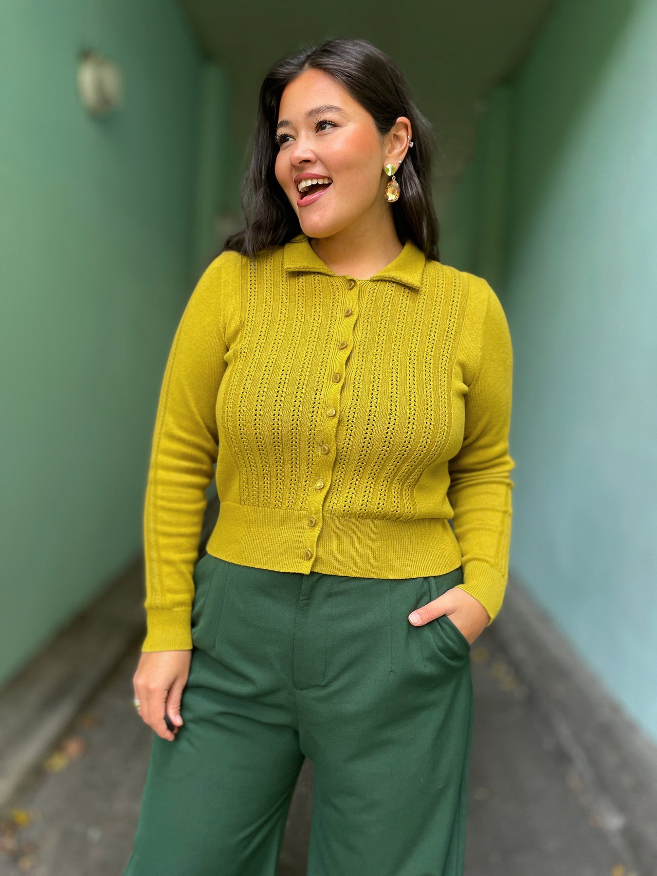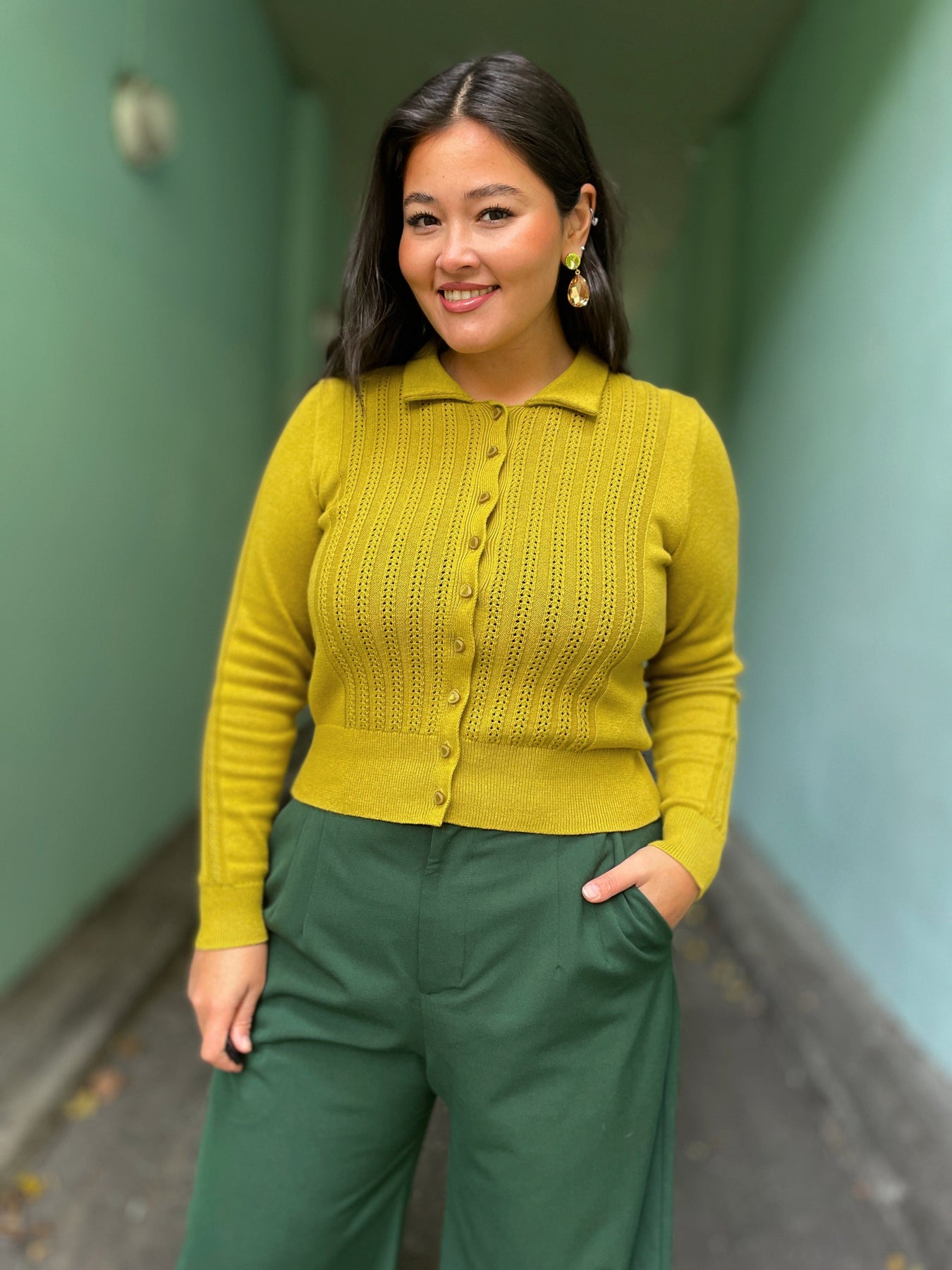 - 40-talls inspirert cardigan i en kul gul-grønn farge