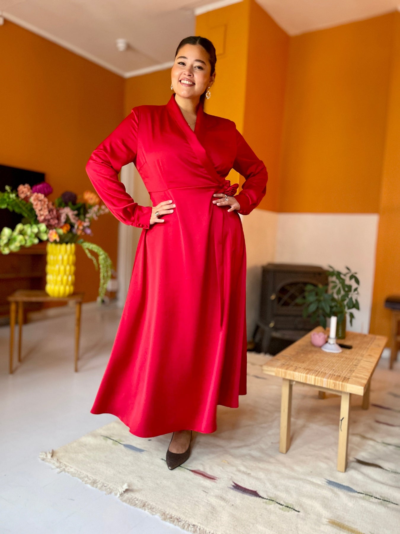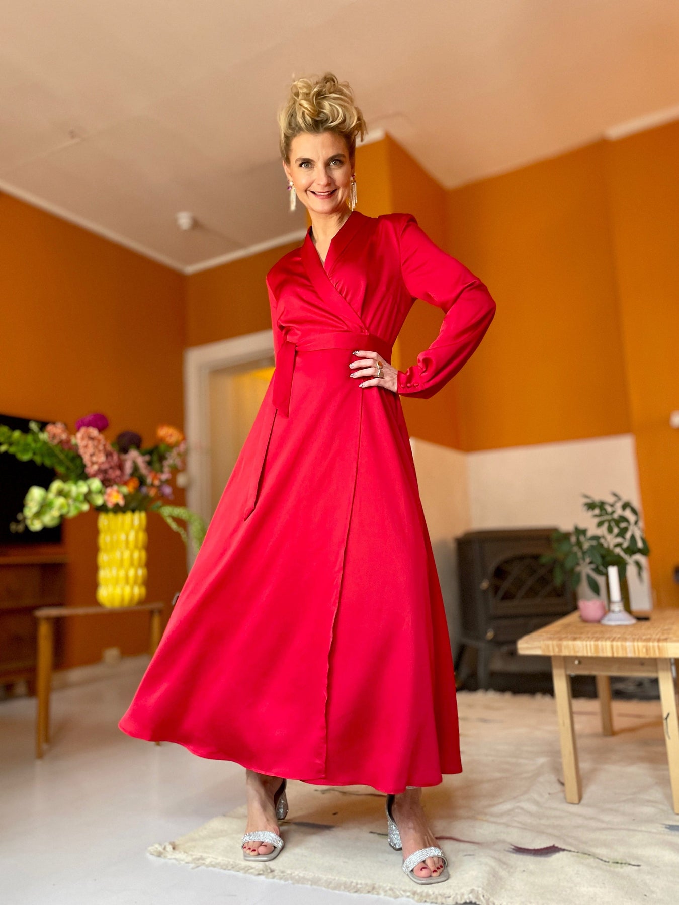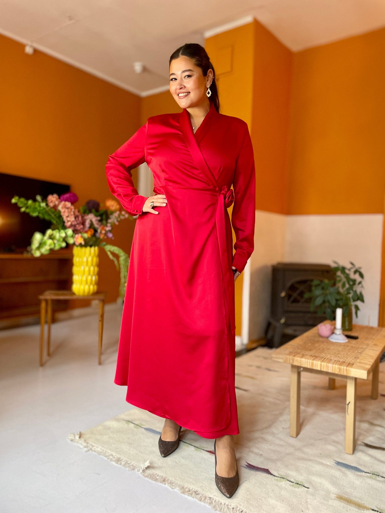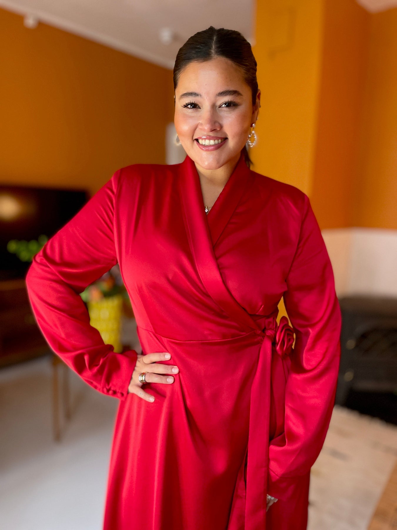 Klassisk, feminin og full av power! En ny wrap-kjole fra Cras i skinnende rødt❤️ Charleen-kjolen sitter som et skudd, har et tidløst snitt som fremhever midjen, og et glansfullt stoff som gir et eksklusivt uttrykk. Den avtakbare blomsten i siden gir en leken touch som du kan bruke for å pynte opp, eller droppe for et renere uttrykk. En perfekt kjole til både julemiddager, festlige kvelder og alle anledninger hvor du vil skinne litt ekstra ✨