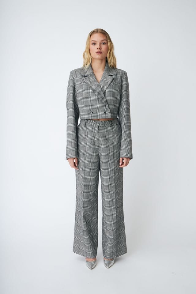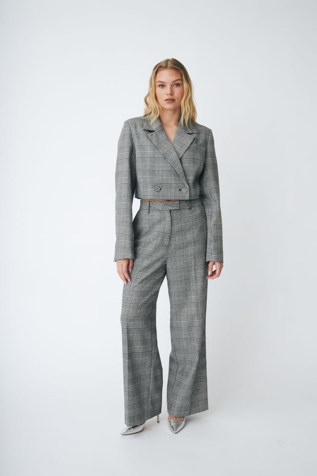 • Grå dressbukse med rutemønster i svart og glitrende sølv