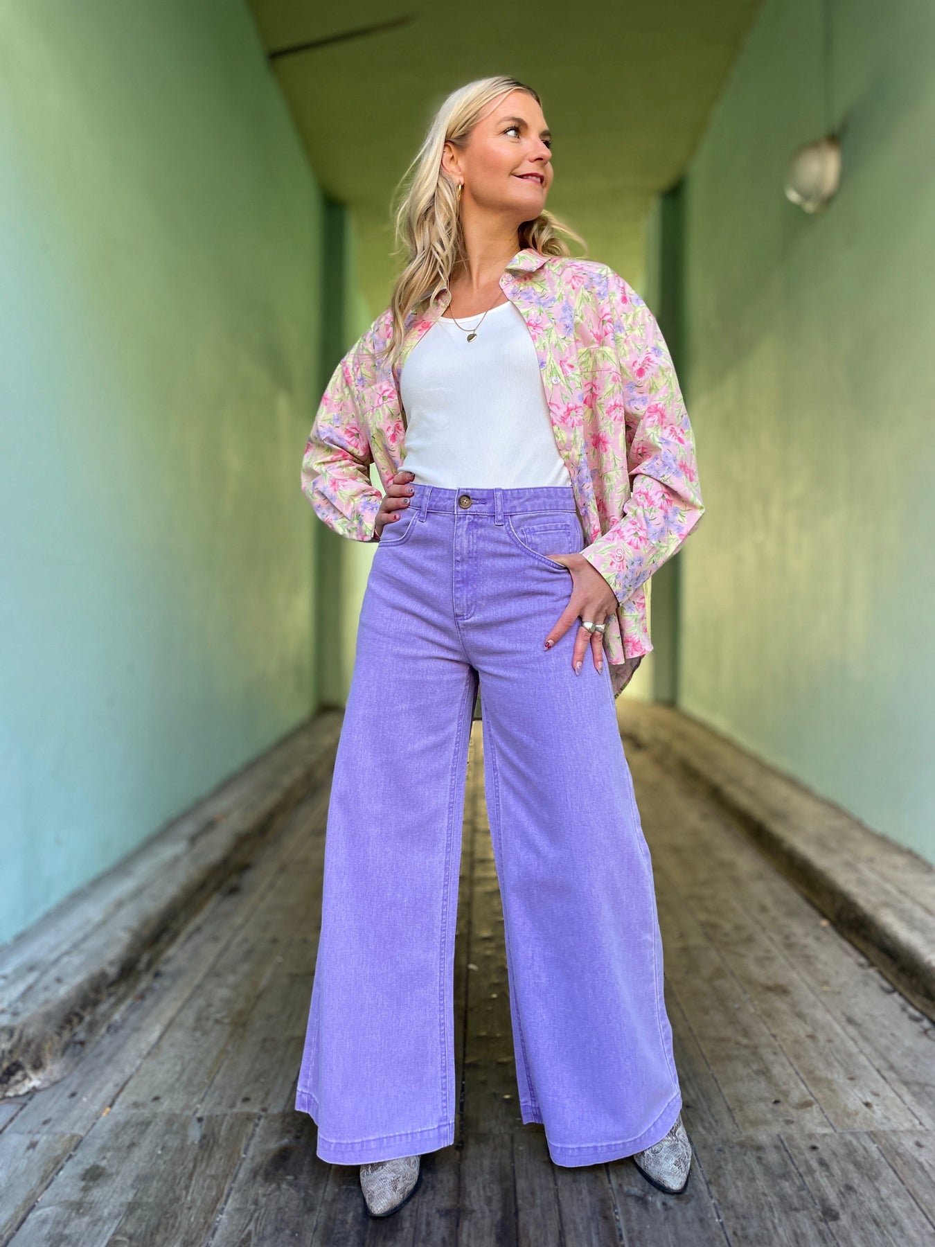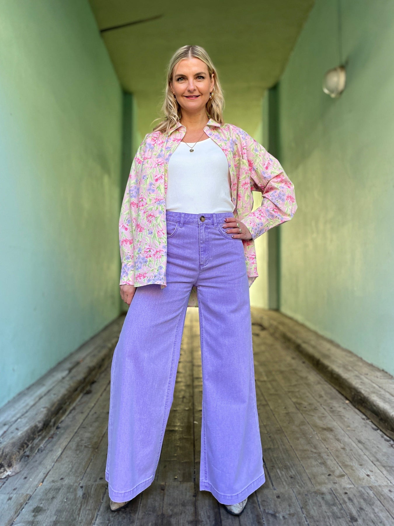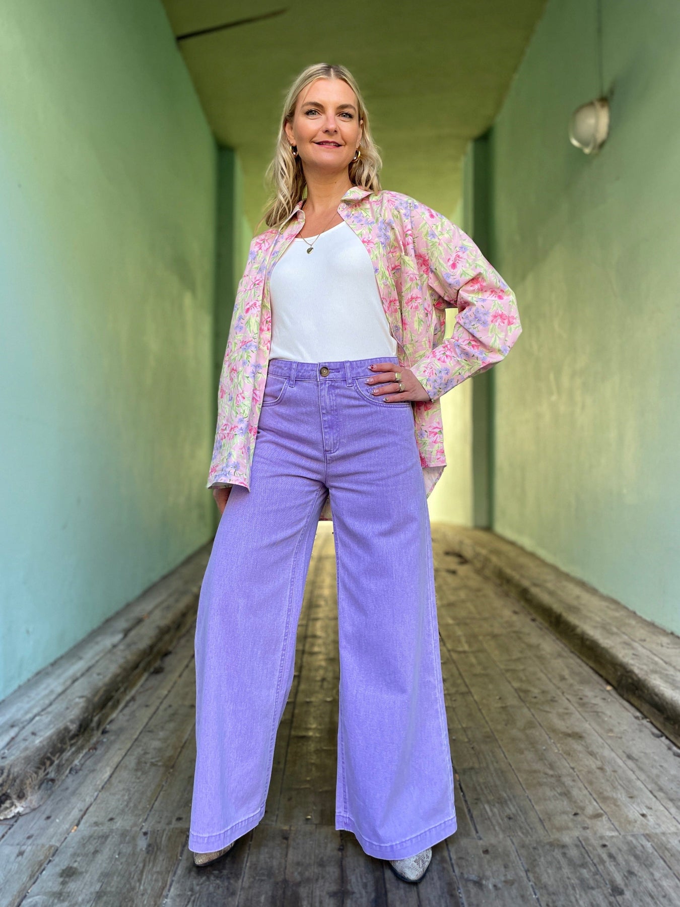 Peppa-modellen er tilbake! Denne gangen i en nydelig lilla denim som gir antrekket et friskt og lekkert løft 💜 Den har de karakteristiske vide beina, høyt liv og bred linning som gir den flatterende fasongen vi digger, men denne modellen har normal lengde i beina, og ikke like lang som den vi har i svart. Stoffet er 100 % bomull og dette gjør buksa behagelig, slitesterk og perfekt til hverdagsbruk. Denne lilla fargen er overraskende allsidig og like kul til en enkel hvit t-skjorte som til en mønstrete bluse, en bukse som garantert blir en gjenganger i garderoben! Sjekk ut den matchende Ellen-jakken for et stilig sett🙌