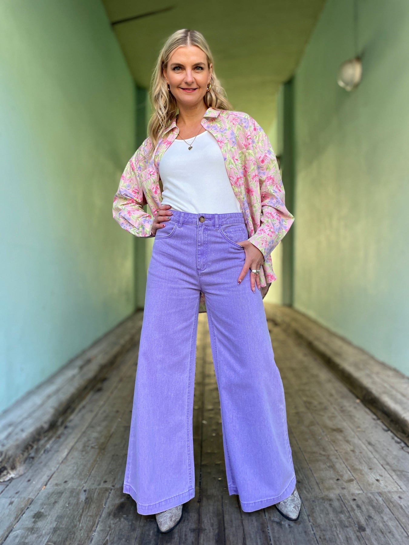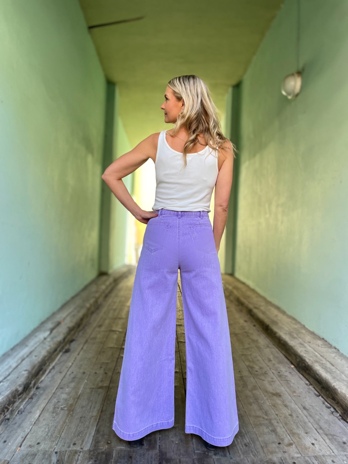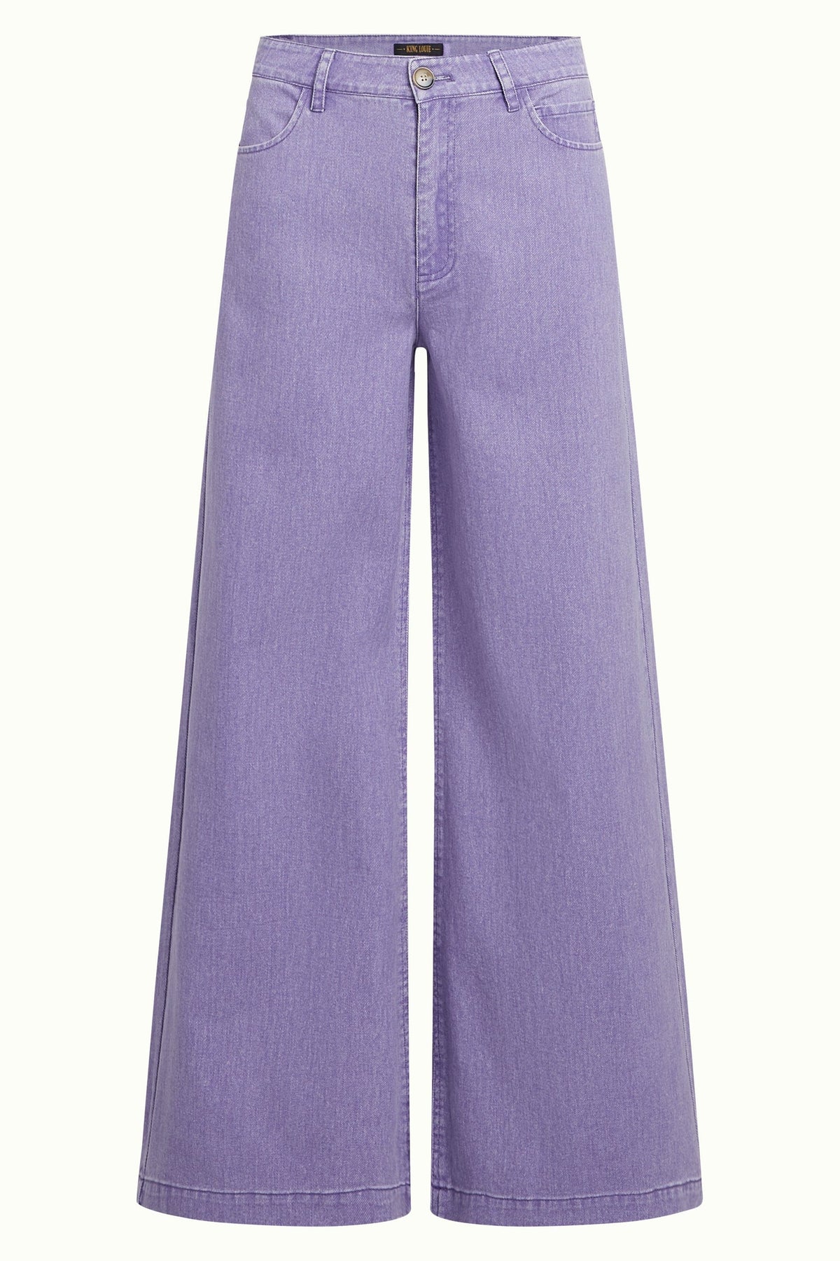 Peppa-modellen er tilbake! Denne gangen i en nydelig lilla denim som gir antrekket et friskt og lekkert løft 💜 Den har de karakteristiske vide beina, høyt liv og bred linning som gir den flatterende fasongen vi digger, men denne modellen har normal lengde i beina, og ikke like lang som den vi har i svart. Stoffet er 100 % bomull og dette gjør buksa behagelig, slitesterk og perfekt til hverdagsbruk. Denne lilla fargen er overraskende allsidig og like kul til en enkel hvit t-skjorte som til en mønstrete bluse, en bukse som garantert blir en gjenganger i garderoben! Sjekk ut den matchende Ellen-jakken for et stilig sett🙌