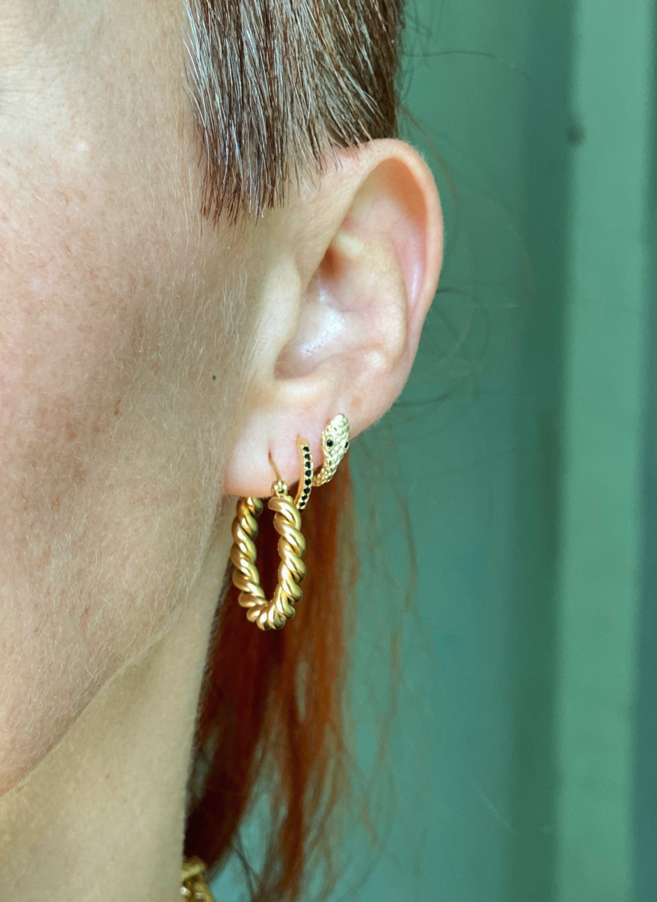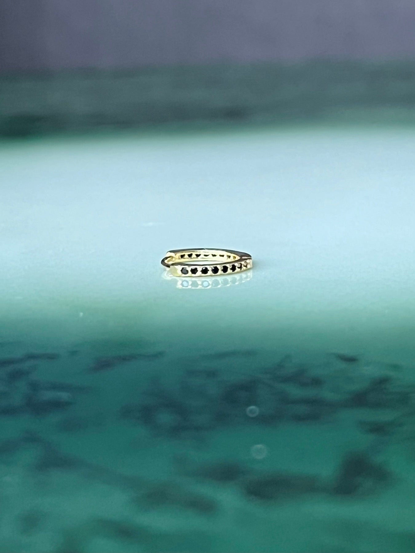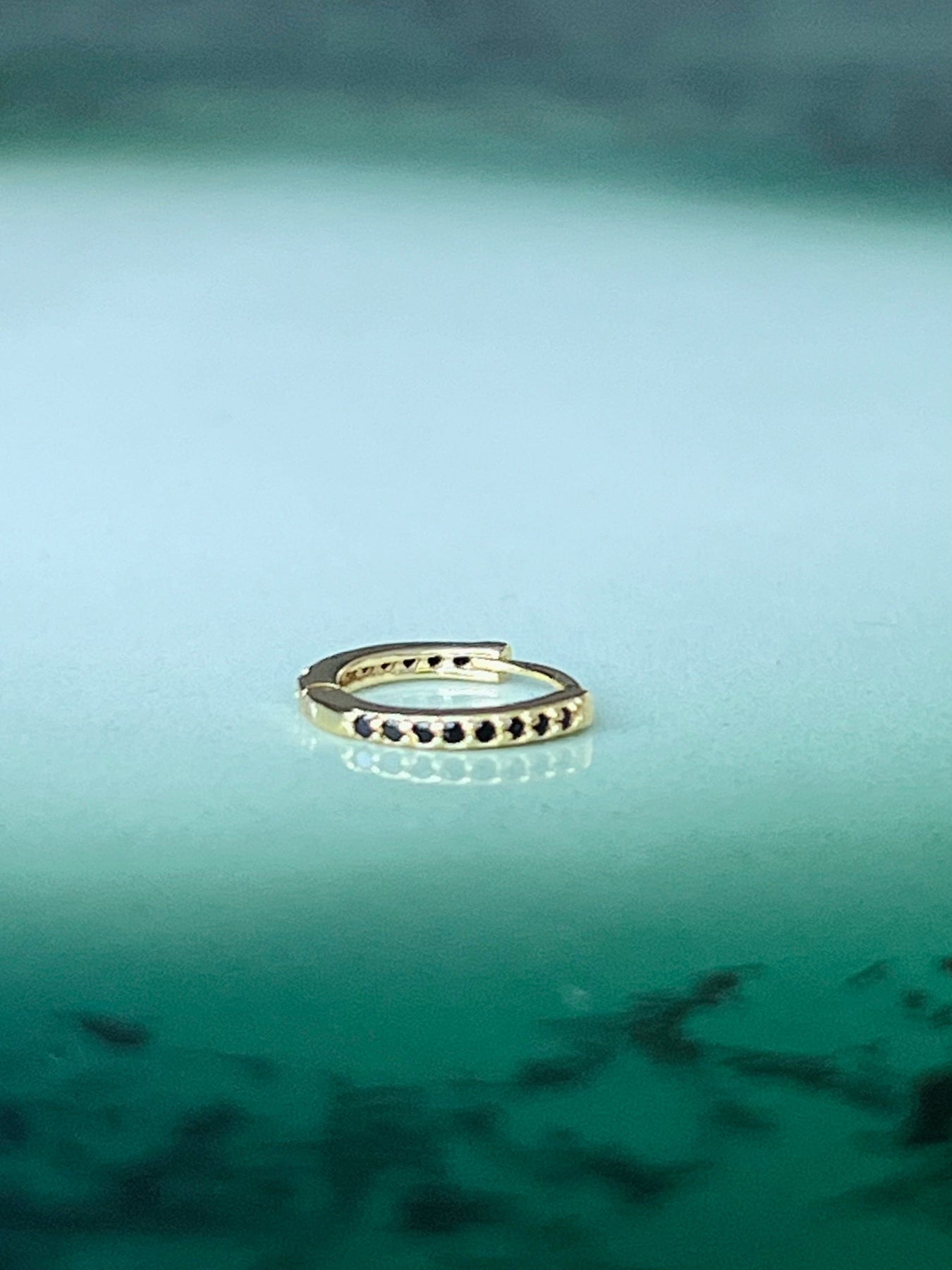 Liten gullbelagt ørering med glitrende krystaller i sort. Passer perfekt for deg som har flere hull i øret. Øreringen selges enkeltvis slik at du lett kan mikse og matche med ulike øreringer oppover flippen din! Kjempefin sammen med mini og large hoops🤩