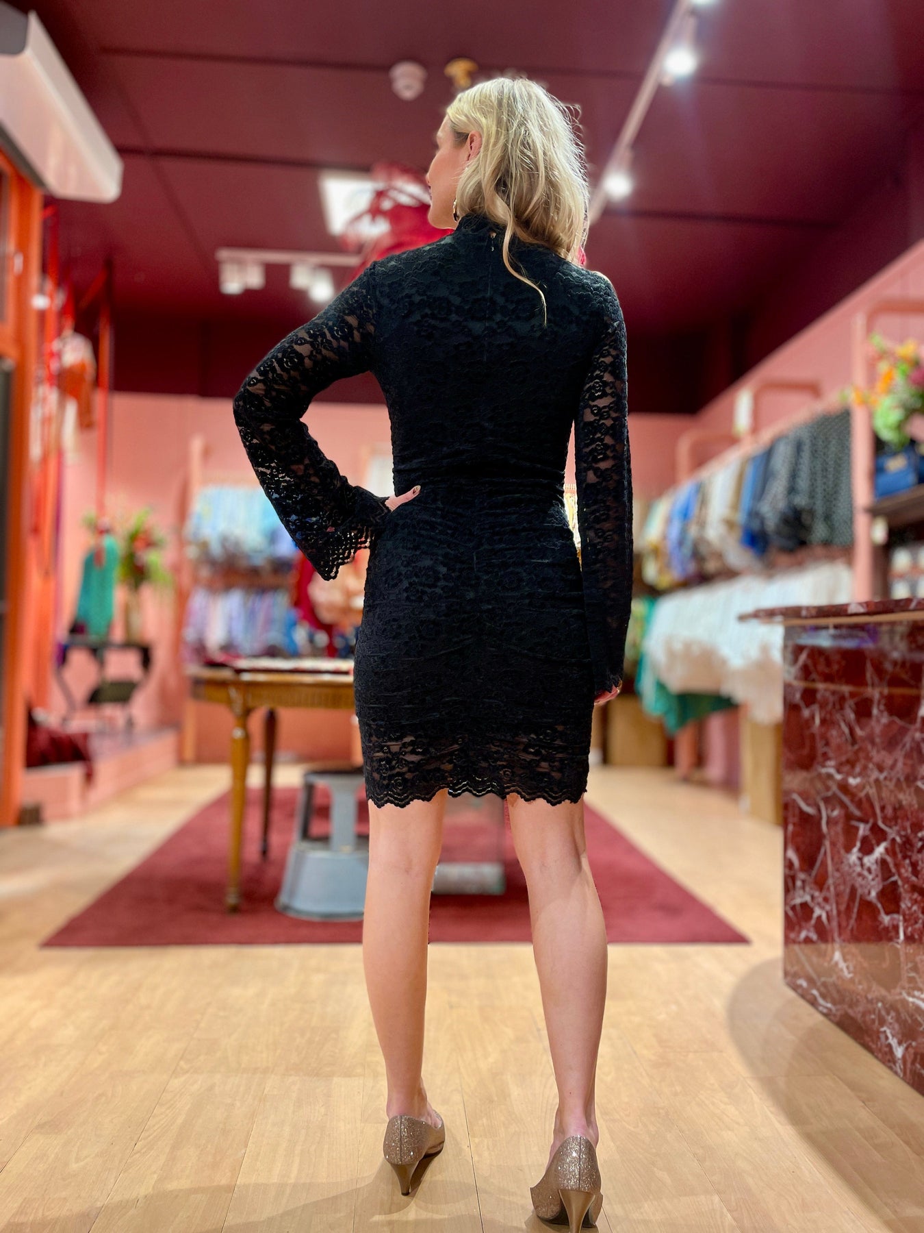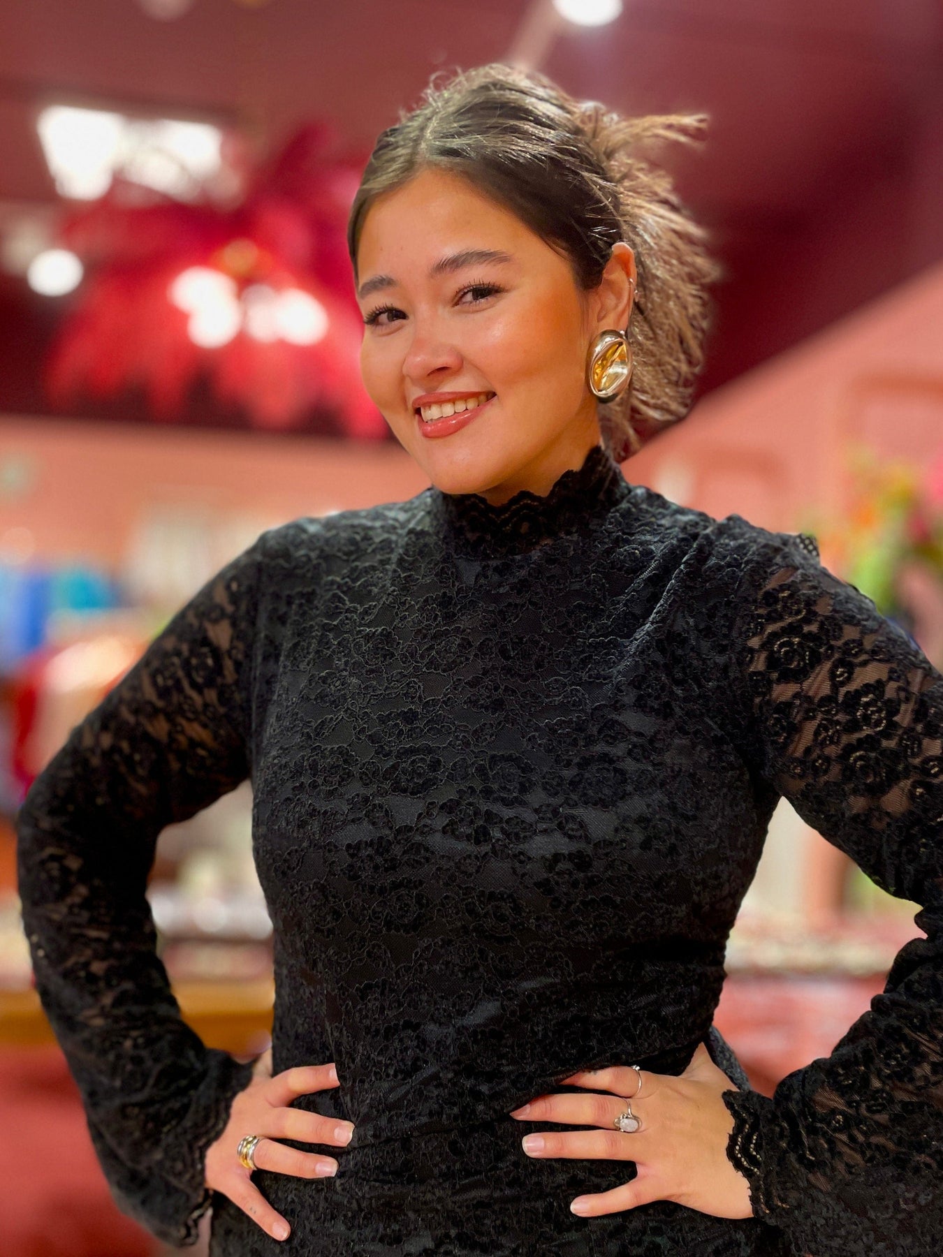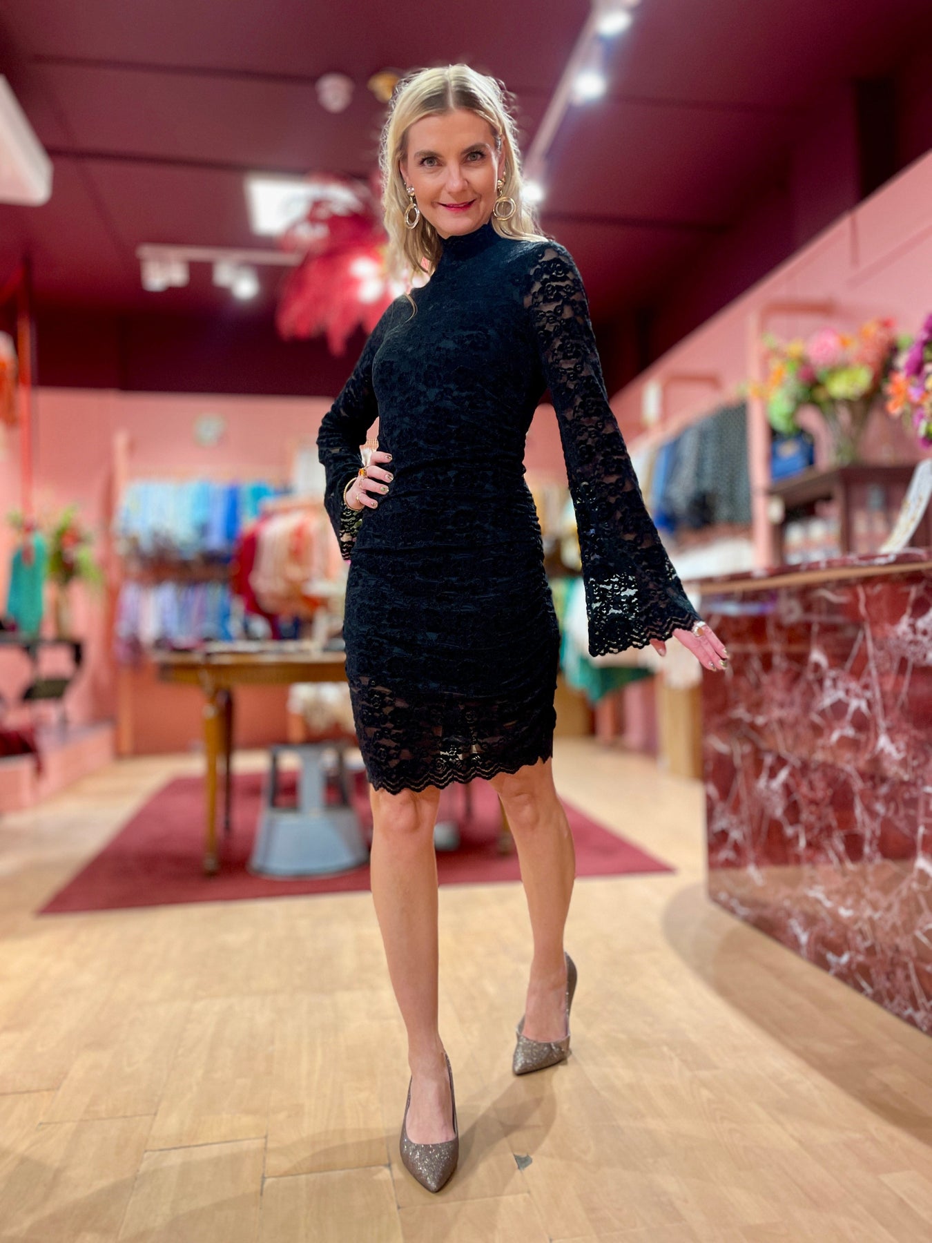 Gjør deg klar for fest med denne fantastiske, blondekjolen fra Cras - nå tilbake i tidløs svart! 🖤 Med lange armer, høy hals og vakre blonder i myk fløyel oser den av feminin romanse og vi lover at du vil føle deg som en vakker stjerne i denne showstopperen av en kjole😍 De fine draperingene fra ryggen og over rumpa gjør at kjolen sitter helt fantastisk fint og med et stretchy og komfortabelt stoff, trenger du ikke å bekymre deg over sømmer som gnager eller stramme ubehageligheter. Her er det bare å danse i vei og ta i mot komplimentene💃🏽