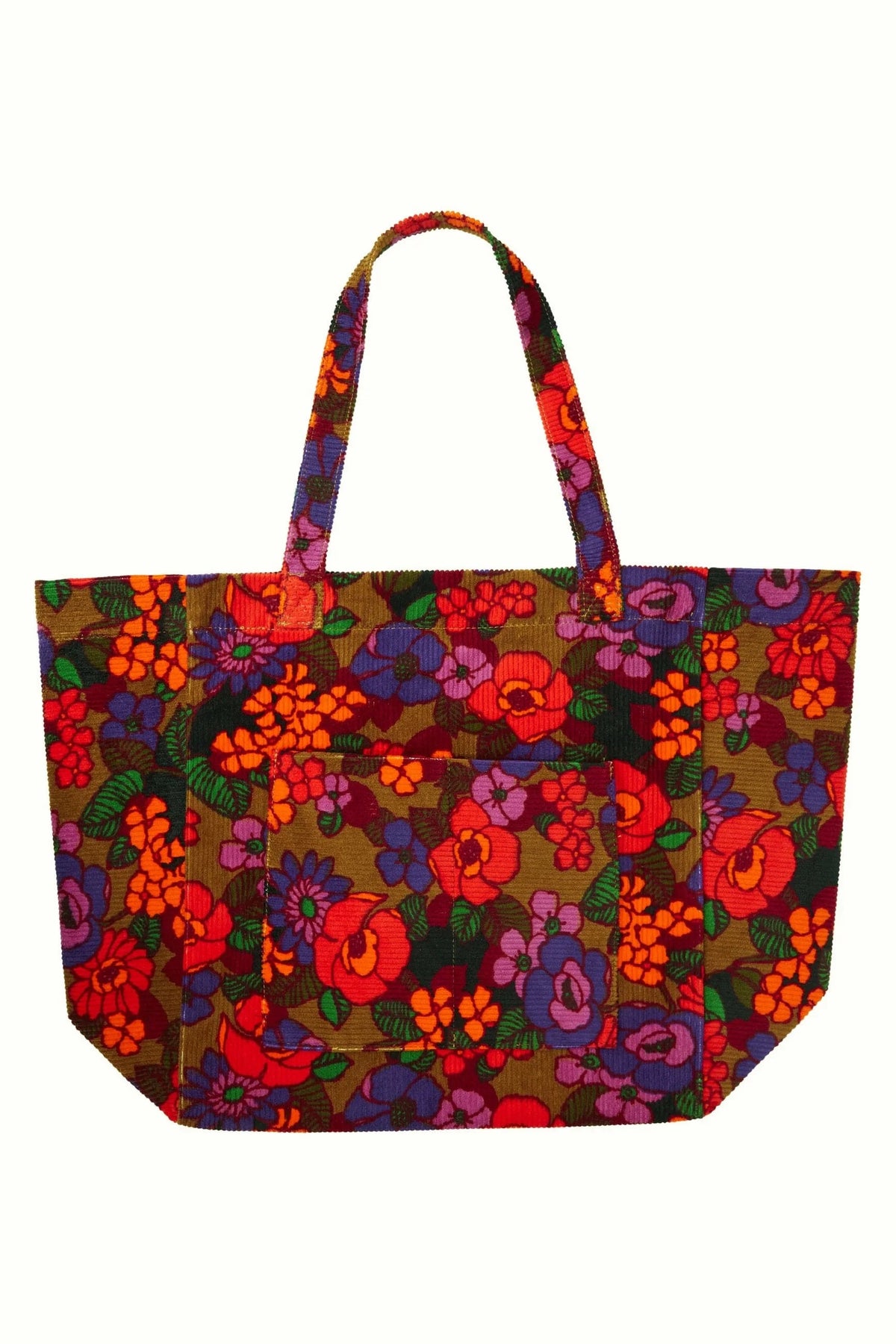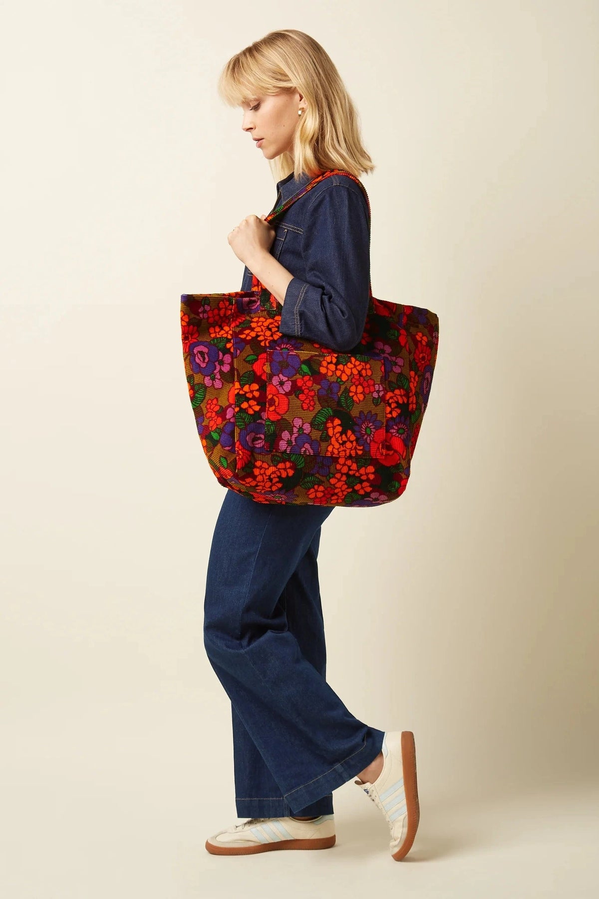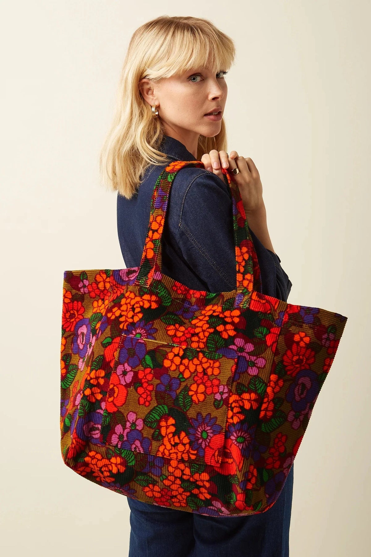 Kjempestort handlenett i cordfløyel med fantastisk print🌺 Her får du et nett, eller en weekendbag om du vil, med god plass, som tåler litt vekt, er i slitesterk bomull, og som i tillegg ser skikkelig kult ut! Det 70-tallsinspirerte blomsterprintet er rett og slett en energi-innsprøytning i seg selv og gjør drassing til en lek🙌 Limited edition!