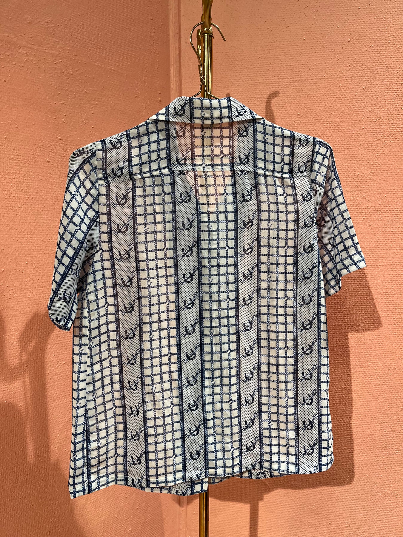 Denne vintageblusen er så kul!💙 Med et blått mønster med hestesko, bred krage og firkanta knapper digger vi denne blusen!🤩