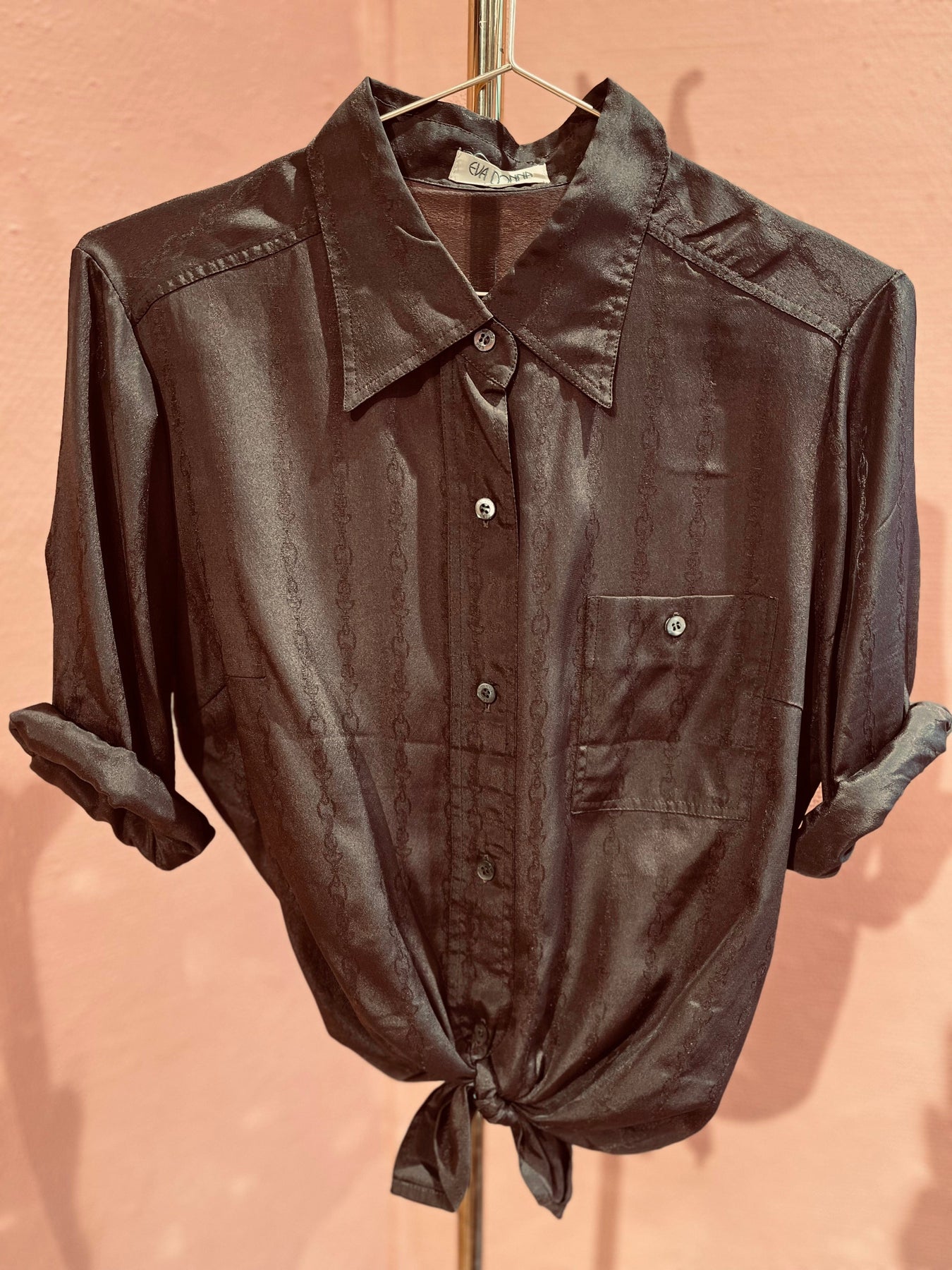 Tøff og elegant vintagebluse med print av lenker i det glansfulle stoffet ❣️ Blusen har klassisk skjortekrage, brystlomme og små knapper med touch av perlemor. Love it! 😍