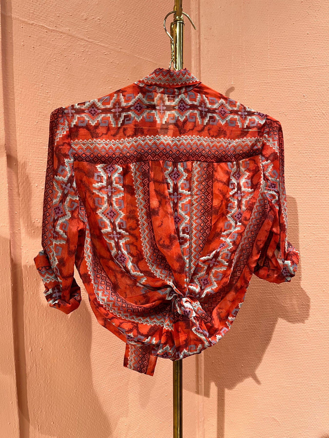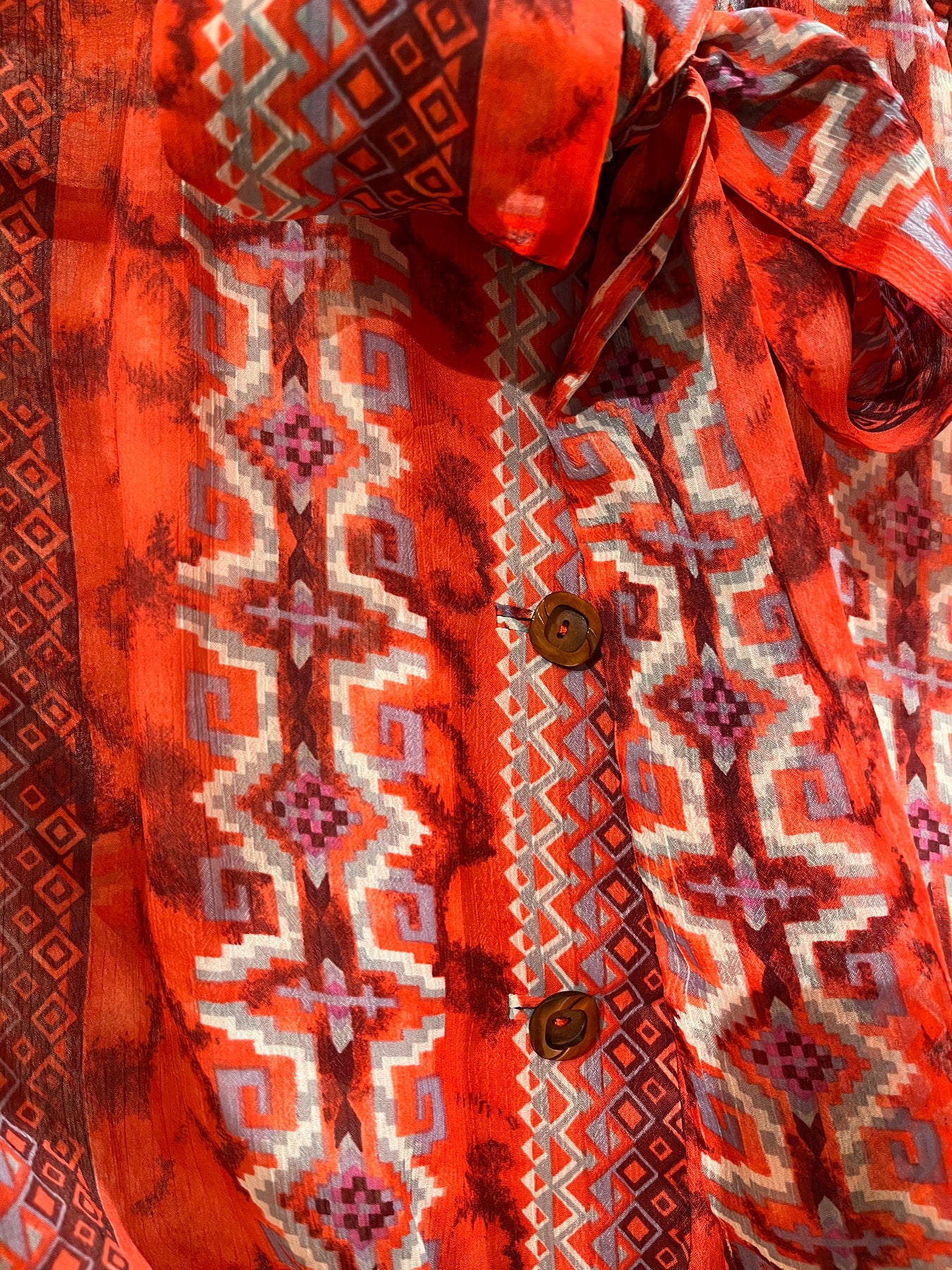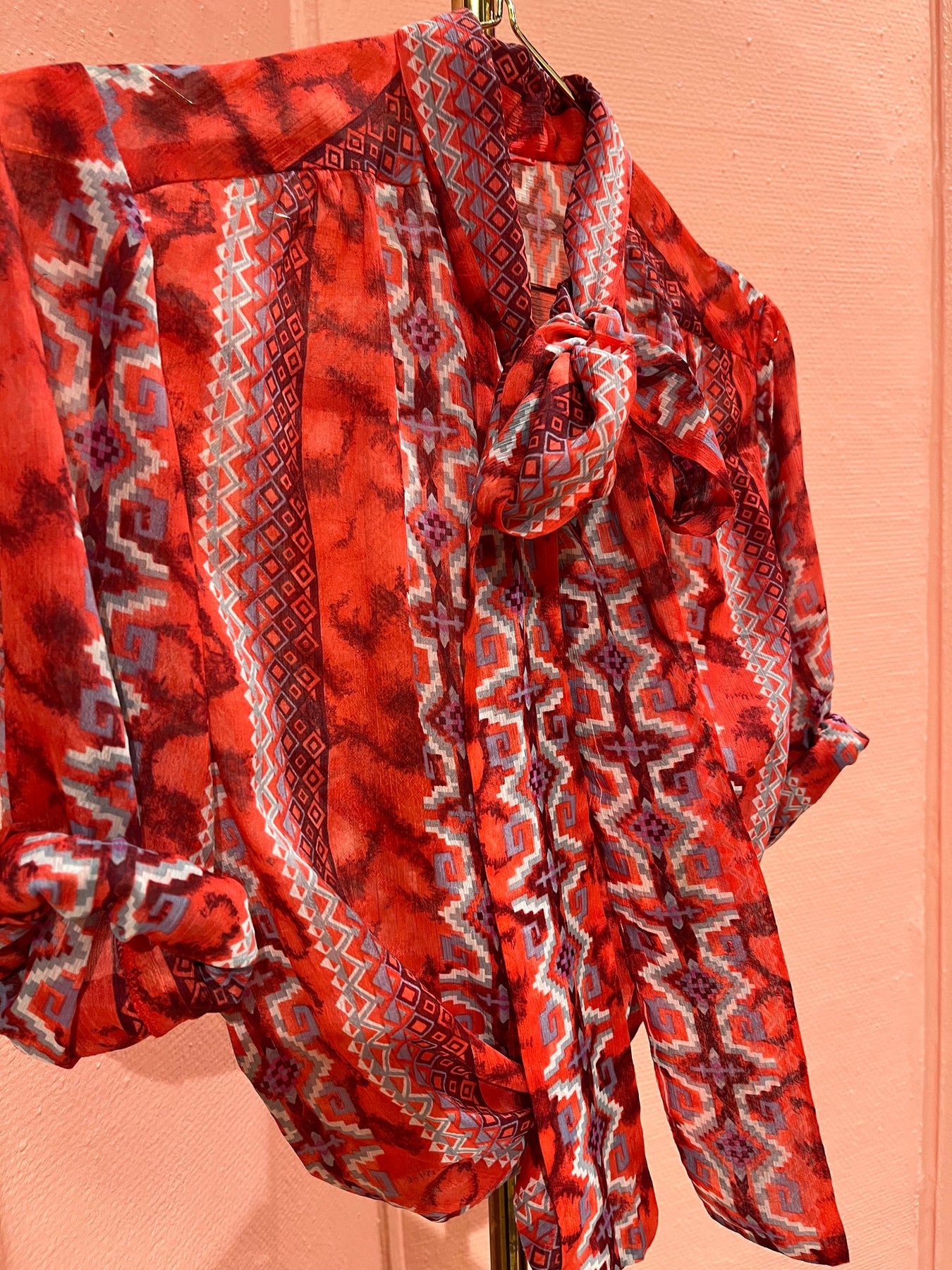 Se på denne kule vintageblusen med flott zigzag-mønster i rødtoner❤️ Den har en sjalkrage og er kjempefin!!😍
