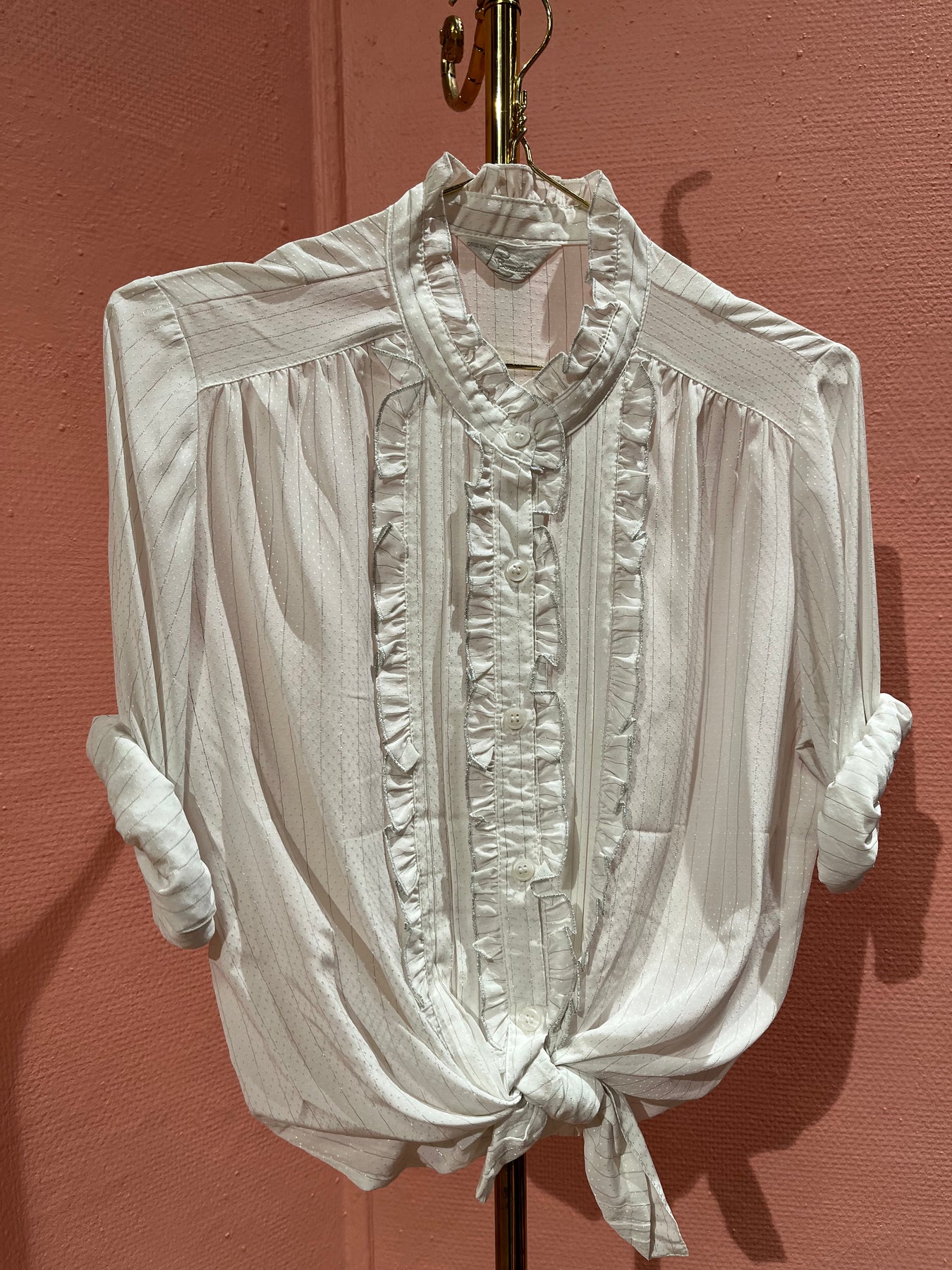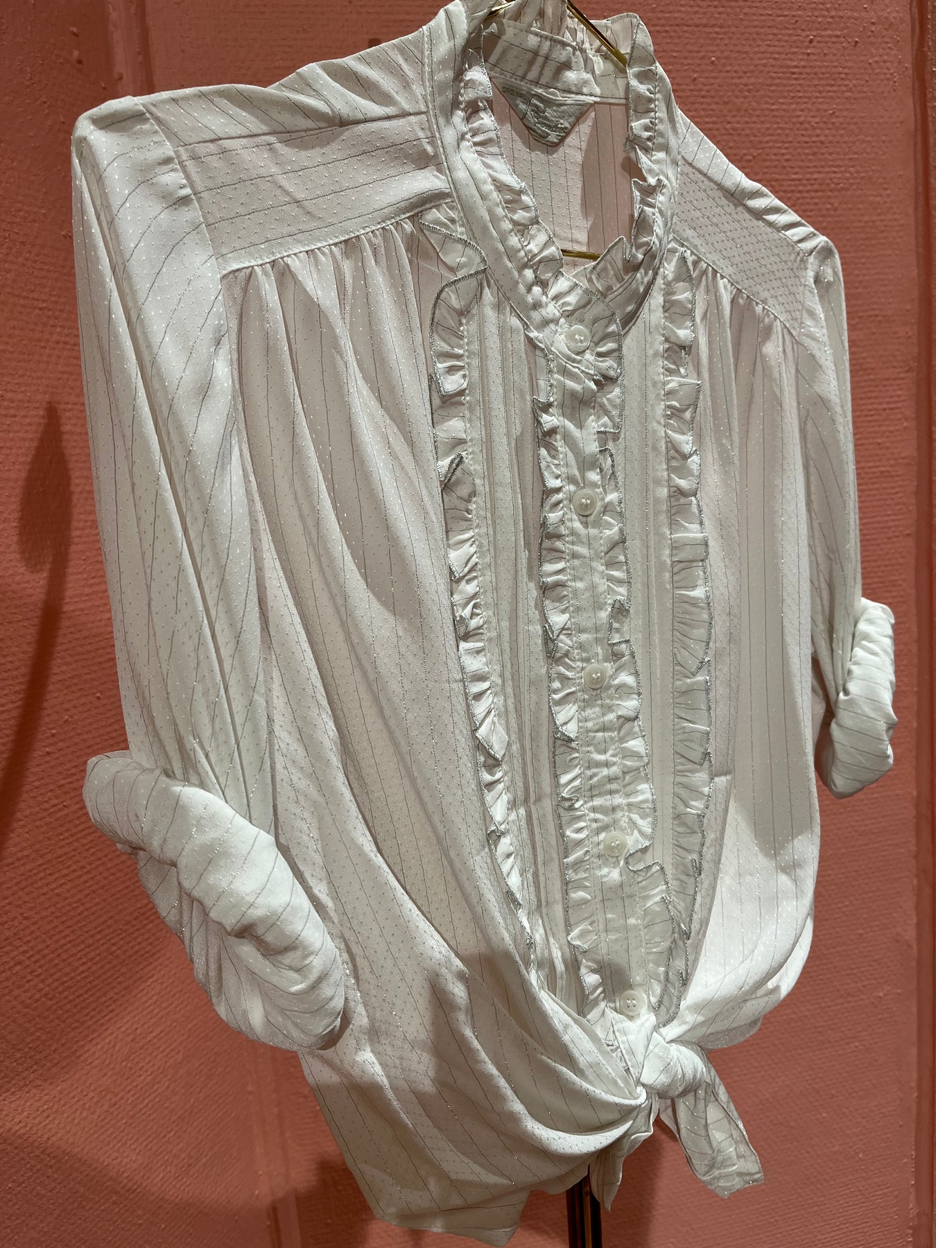 Vakker vintagebluse med glitrende snø❄️ Den har en kinakrage med rysjer og rysjer i front. Den er såå elegant og pen!🤩