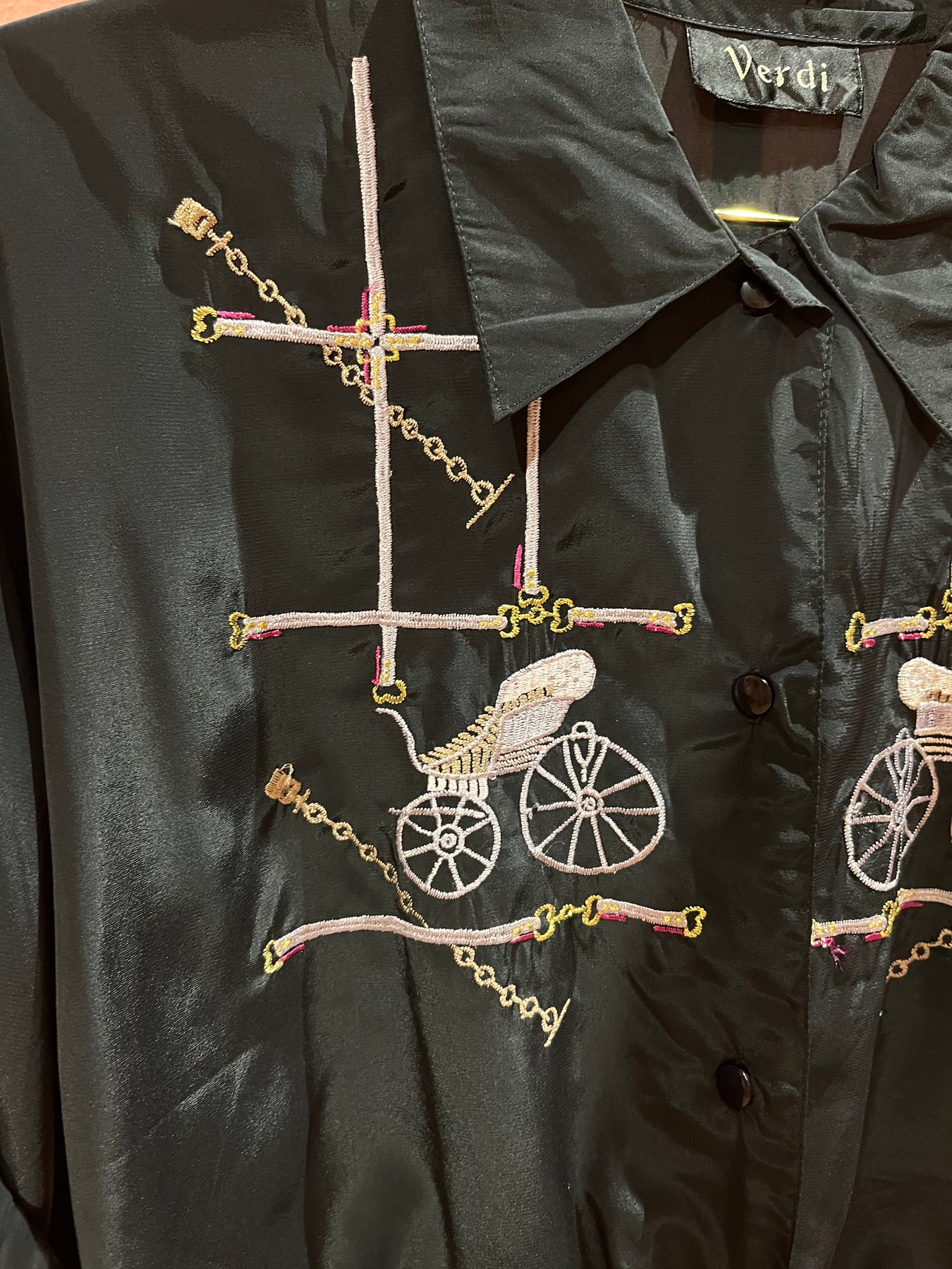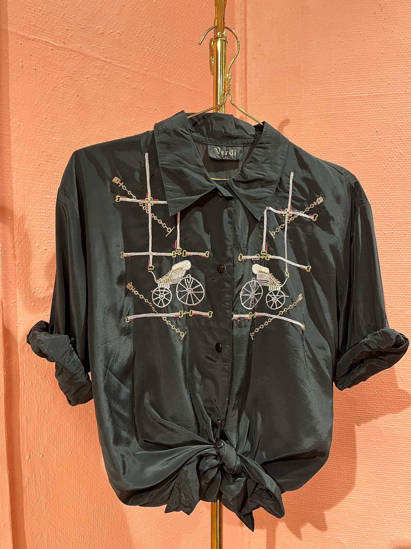 Om du leter etter en kul og artig vintagebluse trenger du ikke lete mer!🙌 Denne blusen har flotte broderier av vogner og lenker. Den har en svart bunn og svarte knapper. Vi digger denne artige blusen!🤩