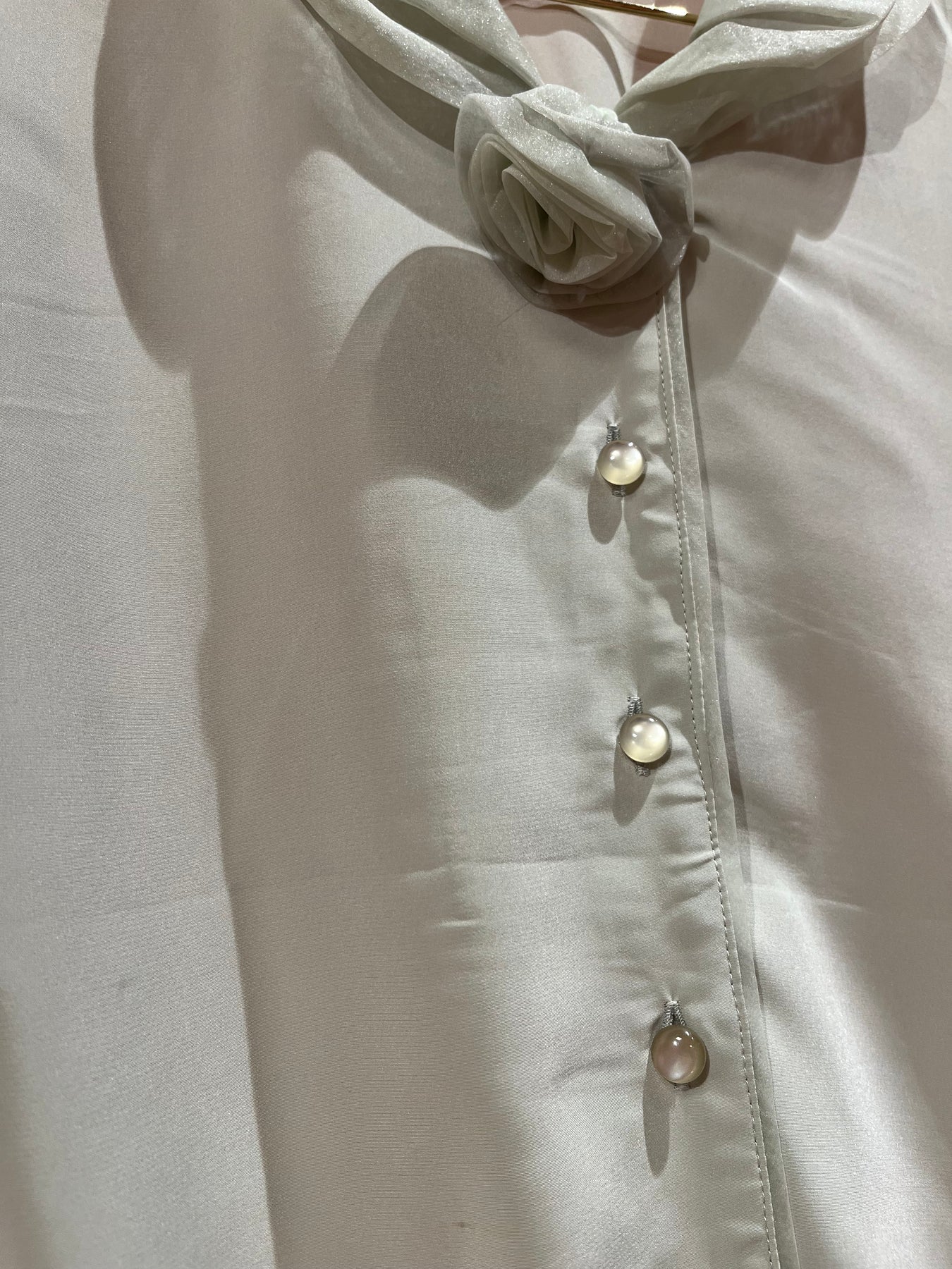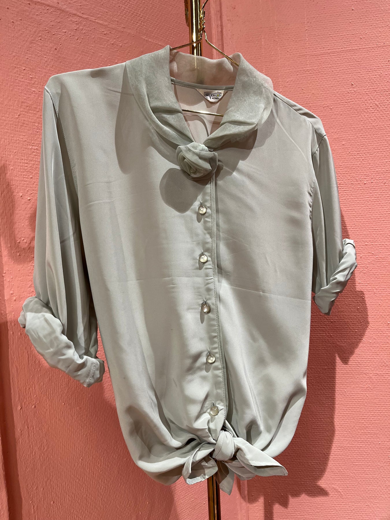 Denne fine vintageblusen er i en lys dus grønnfarge og har fine, skinnende knapper!💚 Den har en kjempekul krage med en fin rose i samme farge🌹 Vi elsker denne blusen!😍