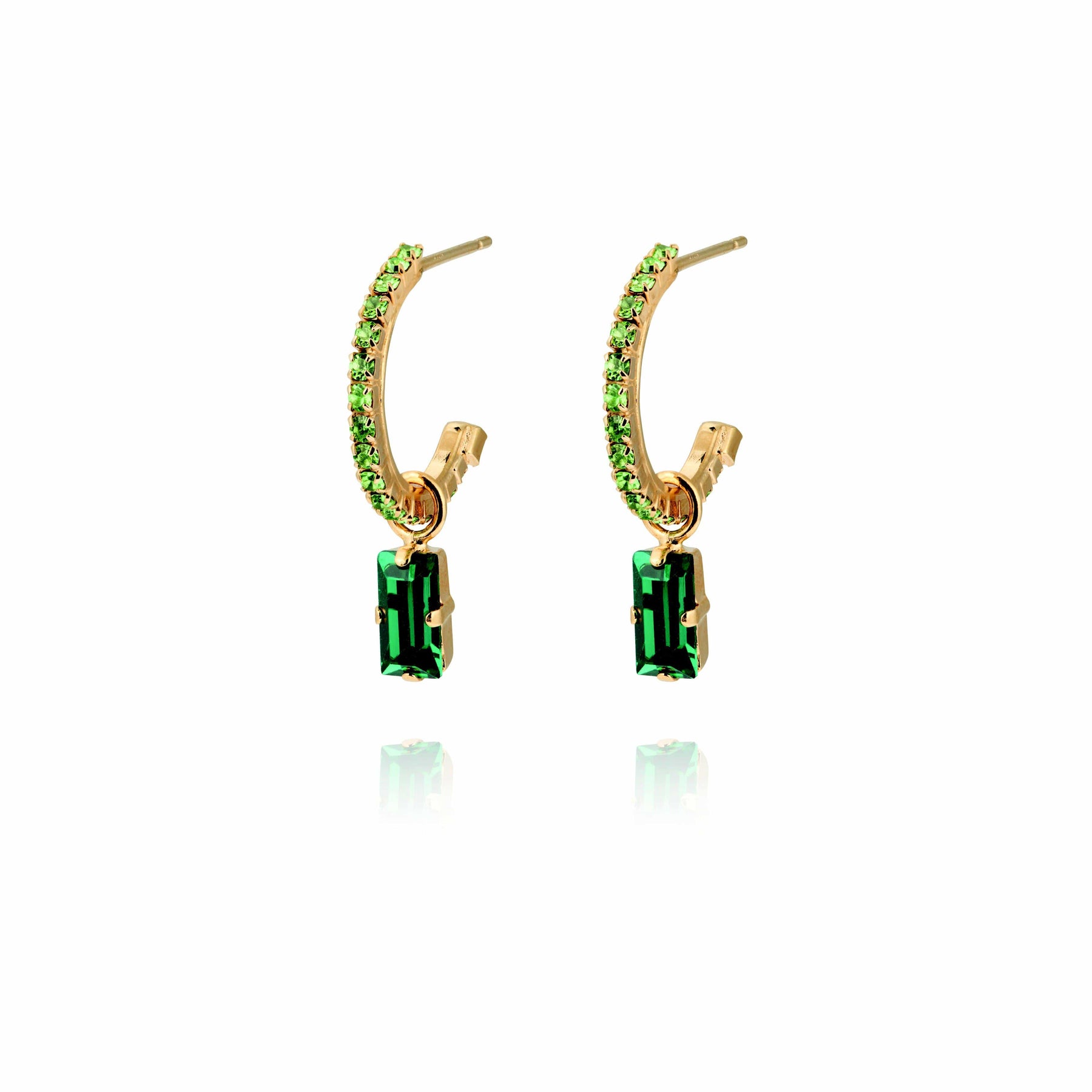 Lucy-øredobbene er både delikate og glamorøse på én gang ✨ Den buede gullbøylen er dekket med små lysegrønne Swarovski-krystaller, og i enden henger en rektangulær sten i en nydelig dypere grønnfarge! 💚 Denne er avtagbar, så her får du to i en da du kan bruke disse som enkle glitrende ringer alene. Perfekt for å tilføre litt ekstra glød til hverdagsantrekket eller som prikken over i’en til festlooken din.
